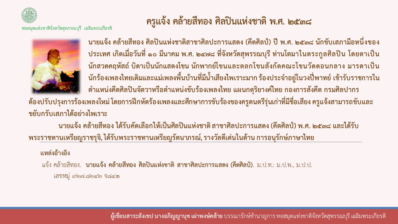 องค์ความรู้สุพรรณบุรี เรื่อง ครูแจ้ง คล้ายสีทอง