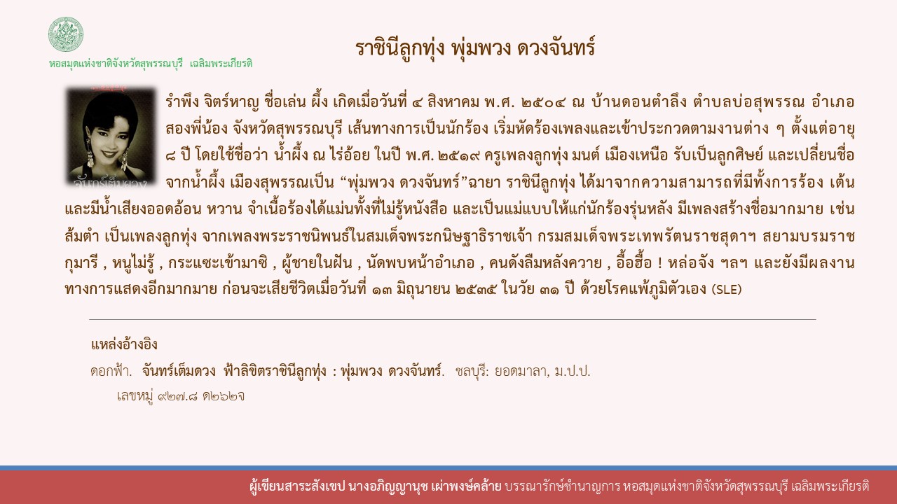 องค์ความรู้สุพรรณบุรี เรื่อง ราชินีลูกทุ่ง พุ่มพวง ดวงจันทร์