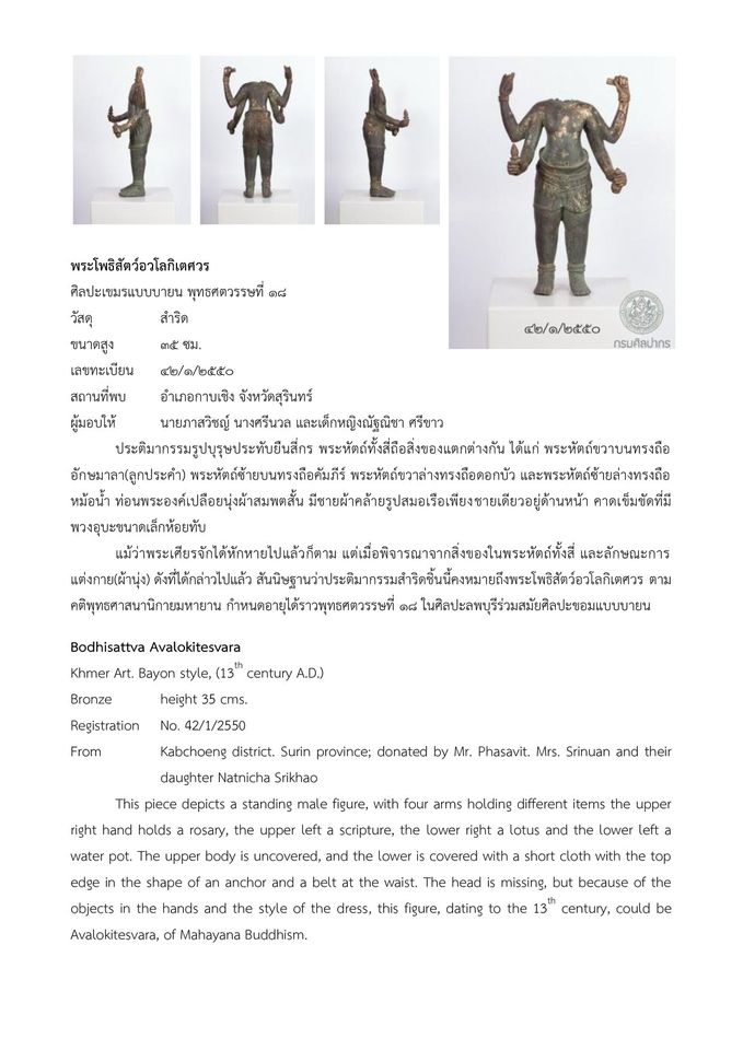 รัว รืง มืง สะเร็น วันนี้ขอพาทุกท่านไปรู้จักกับโบราณวัตถุชิ้นเด่นของพิพิธภัณฑสถานแห่งชาติ สุรินทร์ "พระโพธิสัตว์อวโลกิเตศวรสำริด" ศิลปะลพบุรีหรือเขมรแบบบายน (พุทธศตวรรษที่ ๑๘) ซึ่งพบบริเวณ อำเภอกาบเชิง จังหวัดสุรินทร์