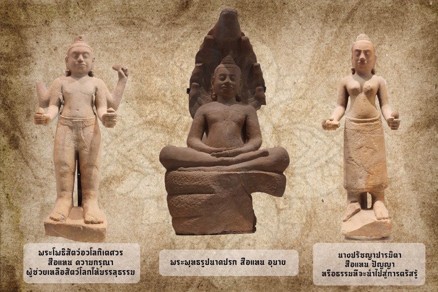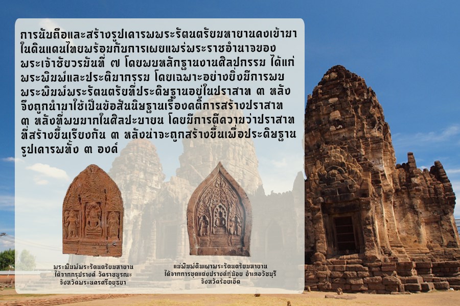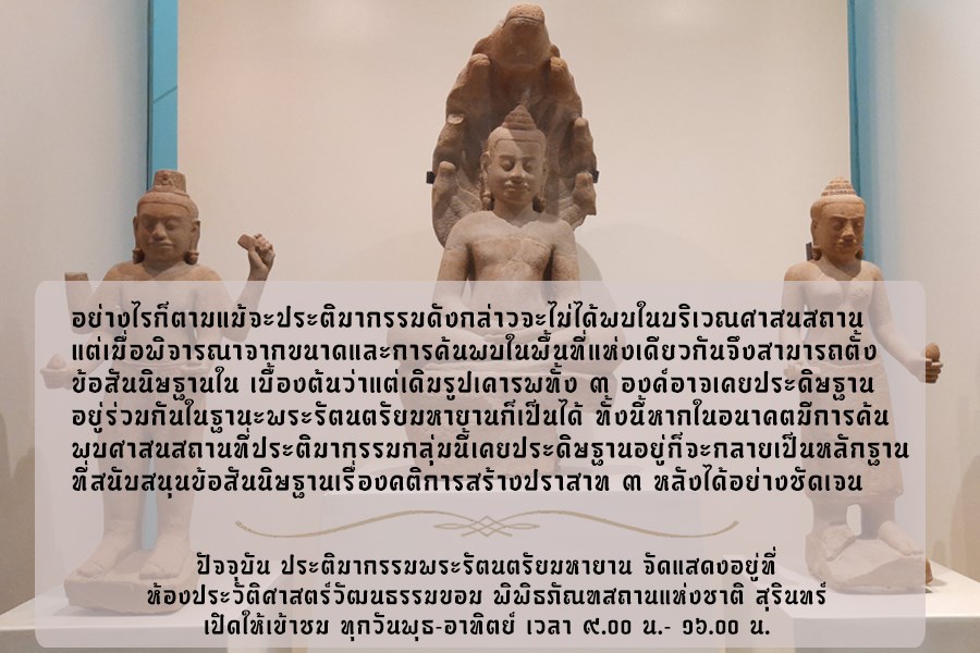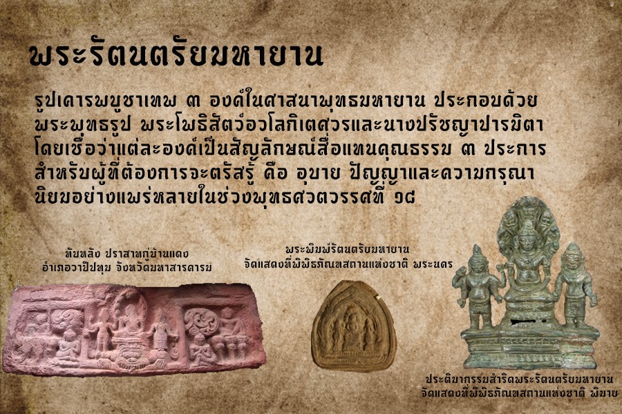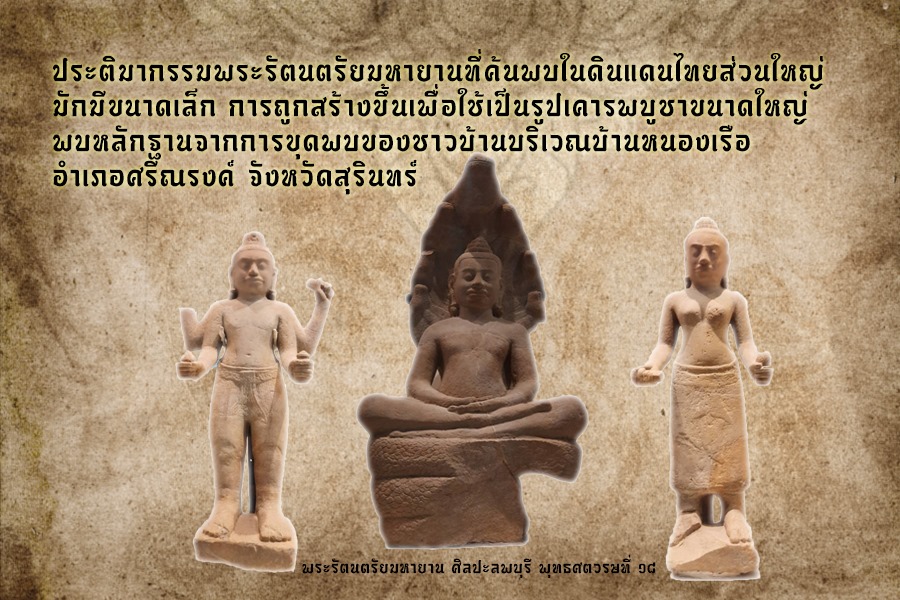 รัว รืง มืง สะเร็น สัปดาห์นี้ขอพาทุกท่านไปรู้จักกับโบราณวัตถุชิ้นเด่น คือ ประติมากรรมรูปเคารพเนื่องในพุทธศาสนา มหายาน หรือ 'รัตนตรัยมหายาน' ศิลปะลพบุรีหรือเขมรแบบบายน (พุทธศตวรรษที่ ๑๘) ซึ่งพบบริเวณ อำเภอศรีณรงค์ จังหวัดสุรินทร์ ปัจจุบันจัดแสดง ณ ห้องนิทรรศการสมัยประวัติศาสตร์วัฒนธรรมขอม พิพิธภัณฑสถานแห่งชาติ สุรินทร์