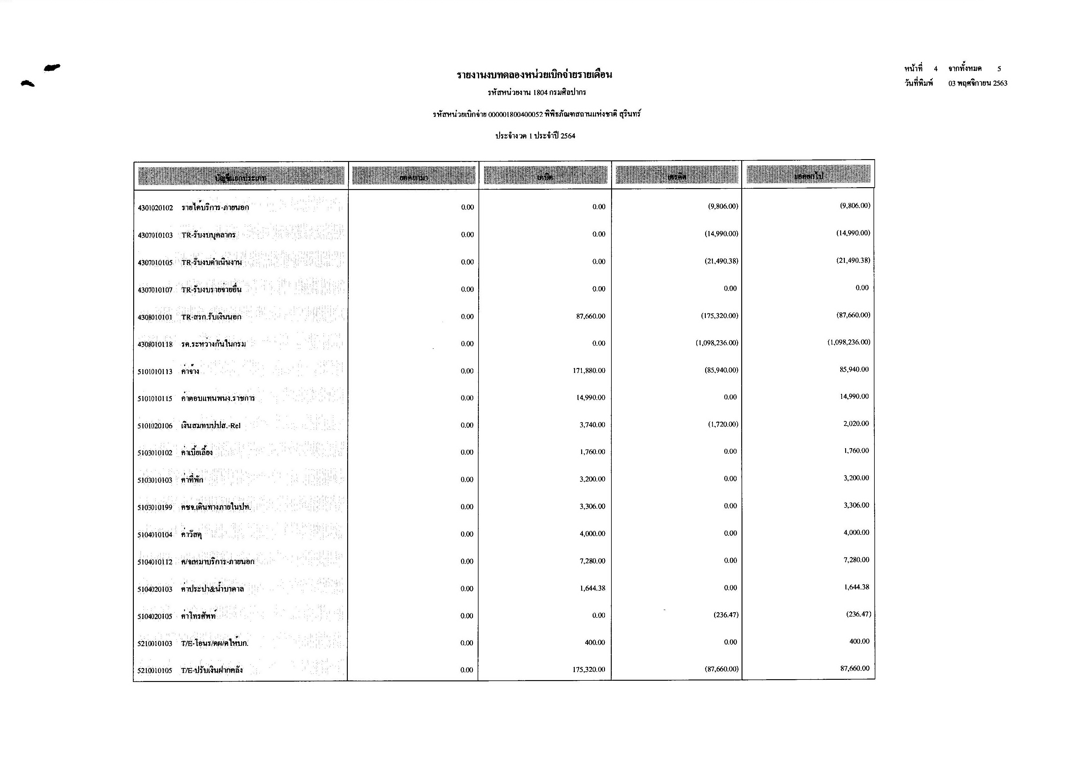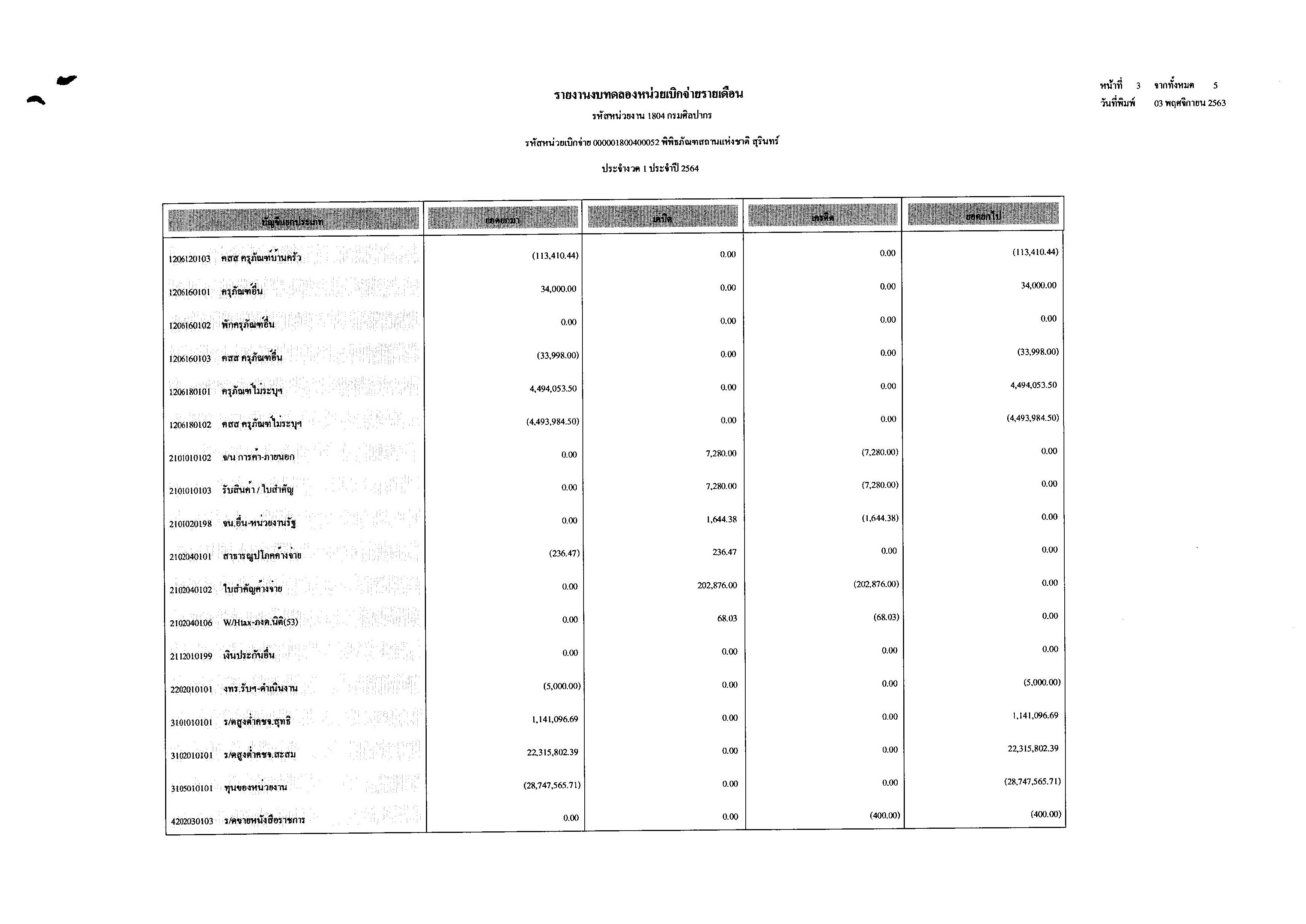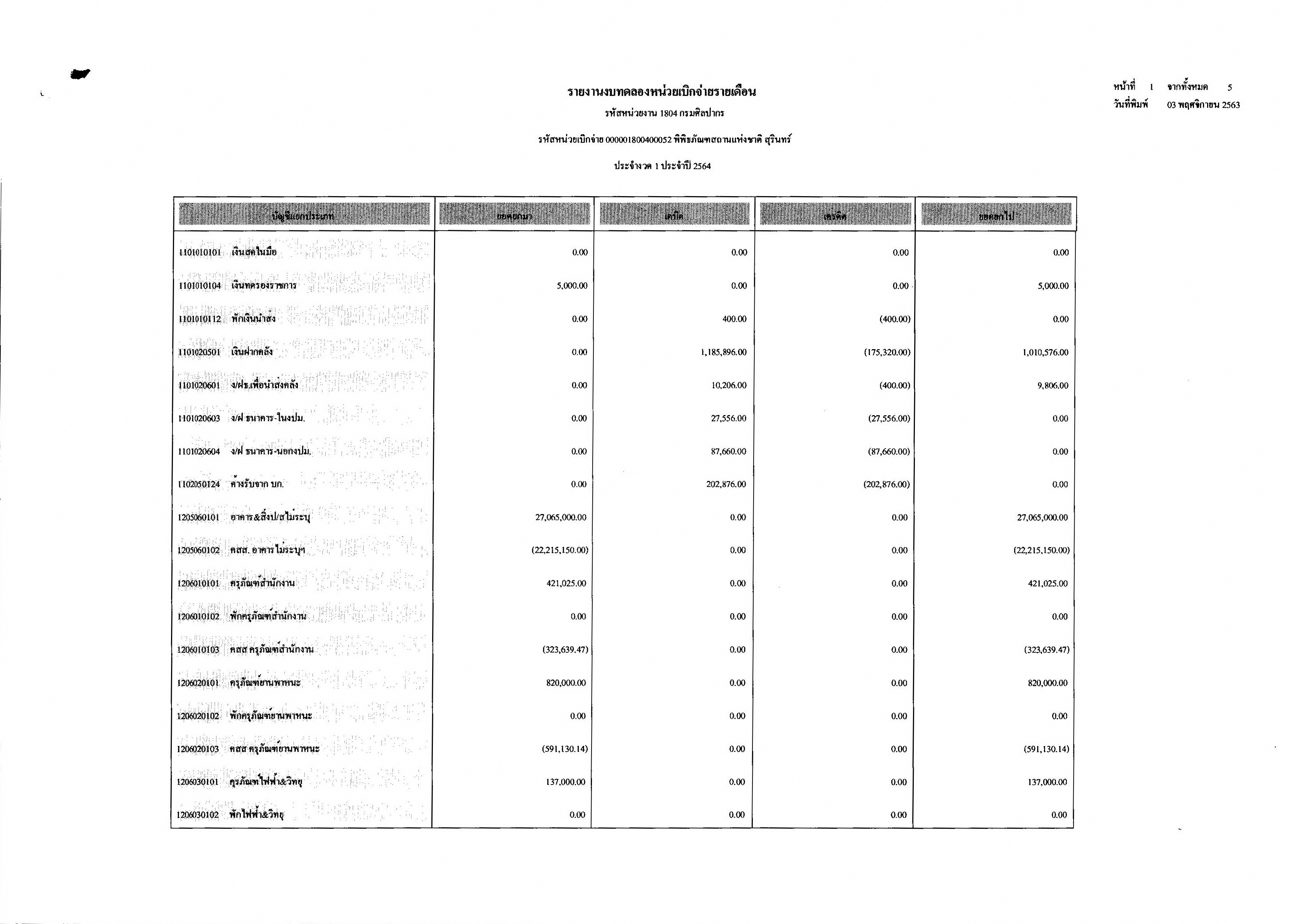 รายงานงบทดลองประจำเดือนตุลาคม ๒๕๖๓