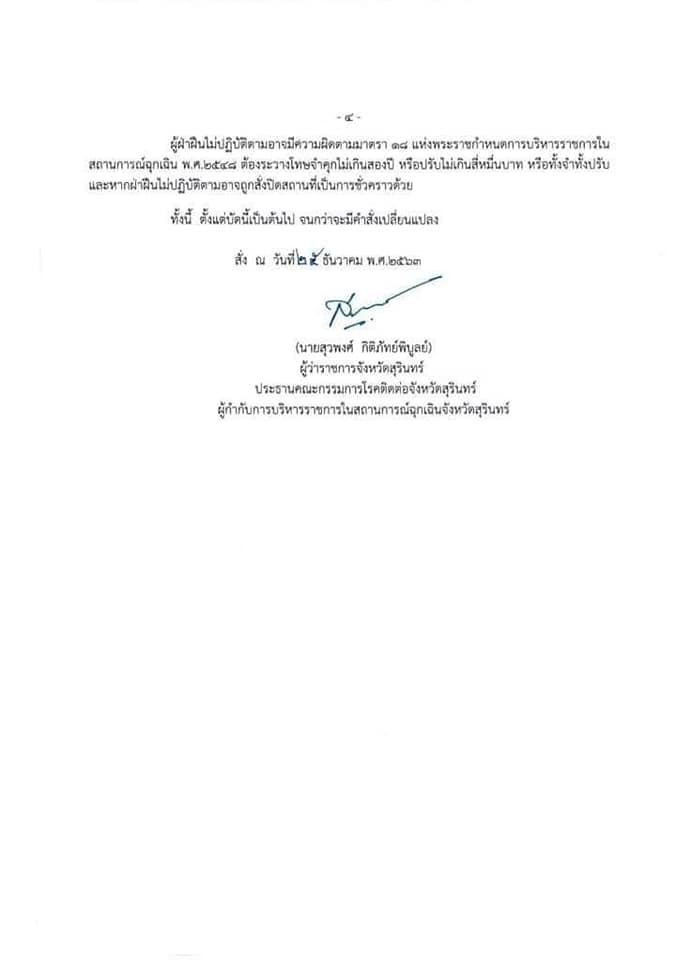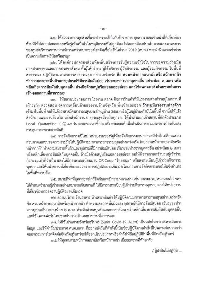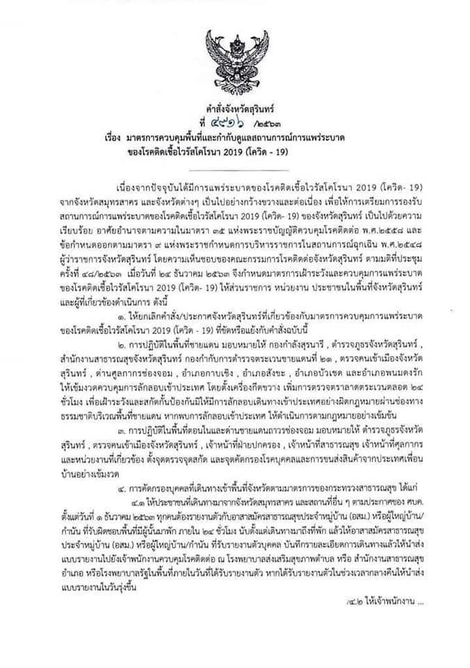 คำสั่งจังหวัดสุรินทร์ ที่ ๔๙๑๖/๒๕๖๓ เรื่องมาตรการควบคุมพื้นที่และกำกับดูแลสถานการณ์การแพร่ระบาดของโรคติดเชื้อไวรัสโคโรนา - ๑๙ (COVID - 19)