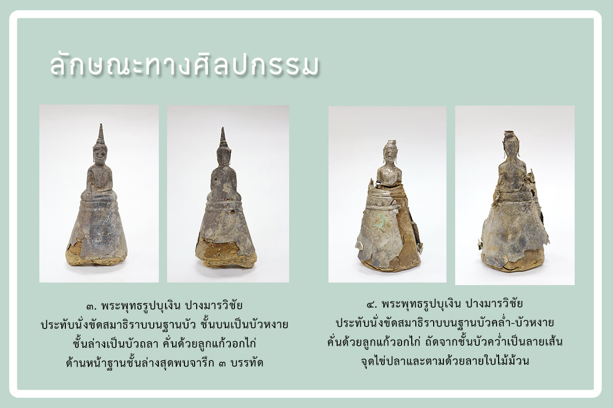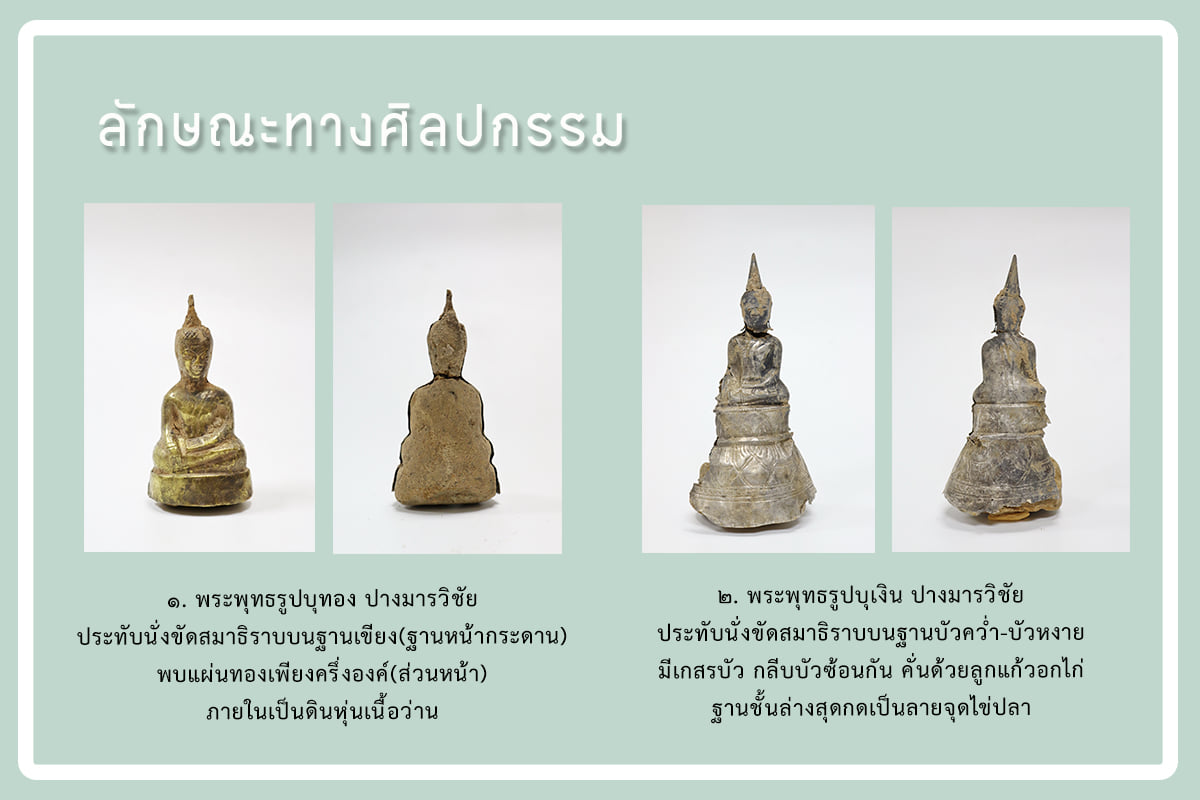 ลักษณะทางศิลปกรรม ๑.พระพุทธรูปบุทอง ปางมารวิชัย ประทับนั่งขัดสมาธิราบบนฐานเขียง(ฐานหน้ากระดาน) ปรากฏแผ่นทองเพียงครึ่งองค์ ภายในพบดินหุ่นเนื้อว่าน ๒.พระพุทธรูปบุเงิน ปางมารวิชัย ประทับนั่งขัดสมาธิราบบนฐานบัว พบทั้งฐานบัวคว่ำ-บัวหงาย ฐานบัวถลา ฐานลายใบไม้ม้วน คั่นด้วยลูกแก้วอกไก่ และพบจารึกที่ฐานชั้นล่างสุด ปรากฏเป็นอักษรธรรมอีสานและอักษรไทยน้อย ภาษาไทย-อีสาน ข้อความในจารึกกล่าวถึงการสร้าง สร้างเมื่อใด ใครเป็นผู้สร้าง และสร้างเพื่อวัตถุประสงค์ใด ปัจจุบันยังไม่สามารถอ่านและแปลความจารึกได้ทั้งหมด เนื่องจากอยู่ระหว่างรอดำเนินการอนุรักษ์ซ่อมแซม