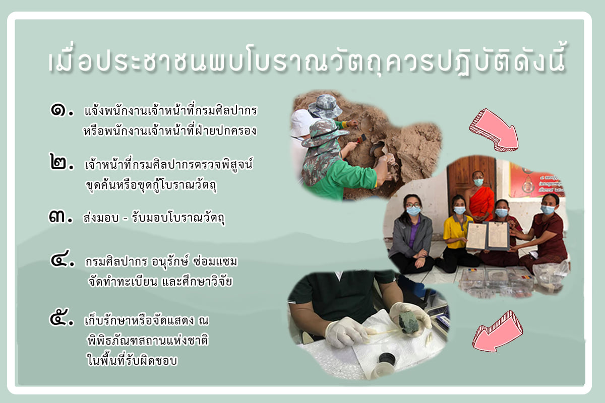 เมื่อประชาชนพบโบราณวัตถุควรปฏิบัติดังนี้ ๑.แจ้งพนักงานเจ้าหน้าที่กรมศิลปากรหรือฝ่ายปกครอง ๒.เจ้าหน้าที่กรมศิลปากรตรวจพิสูจน์ ขุดค้นหรือขุดกู้โบราณวัตถุ ๓.ดำเนินการส่งมอบ-รับมอบโบราณวัตถุ ๔.กรมศิลปากรดำเนินการอนุรักษ์ซ่อมแซม จัดทำทะเบียนและศึกษาค้นคว้าข้อมูลโบราณวัตถุ ๕.เก็บรักษาหรือจัดแสดง ณ พิพิธภัณฑสถานแห่งชาติ ในพื้นที่รับผิดชอบ เพื่อเป็นการอนุรักษ์ไว้ซึ่งมรดกศิลปวัฒนธรรมของชาติให้คงอยู่สืบไป