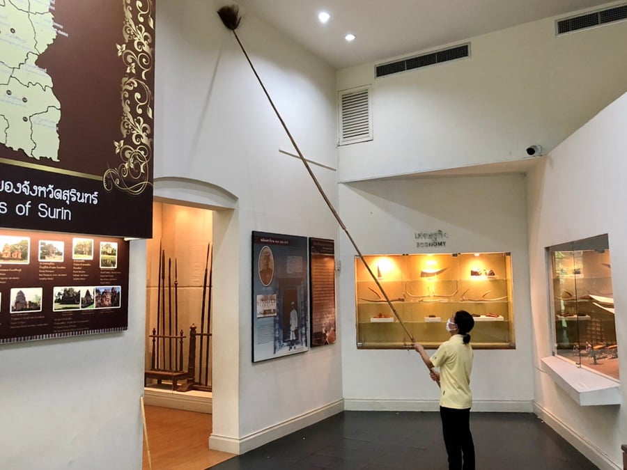 พิพิธภัณฑสถานแห่งชาติ สุรินทร์ ปฏิบัติงานระหว่างปิดให้บริการชั่วคราว ระหว่างวันที่ ๓ - ๙ พฤษภาคม ๒๕๖๔ โดยเจ้าหน้าที่ร่วมกัน จัดทำข้อมูลทะเบียนโบราณวัตถุประเภทผ้า , ทำความสะอาดอาคารจัดแสดงและภูมิทัศน์โดยรอบพิพิธภัณฑ์ และซ่อมแซมวัสดุอุปกรณ์ของหน่วยงาน