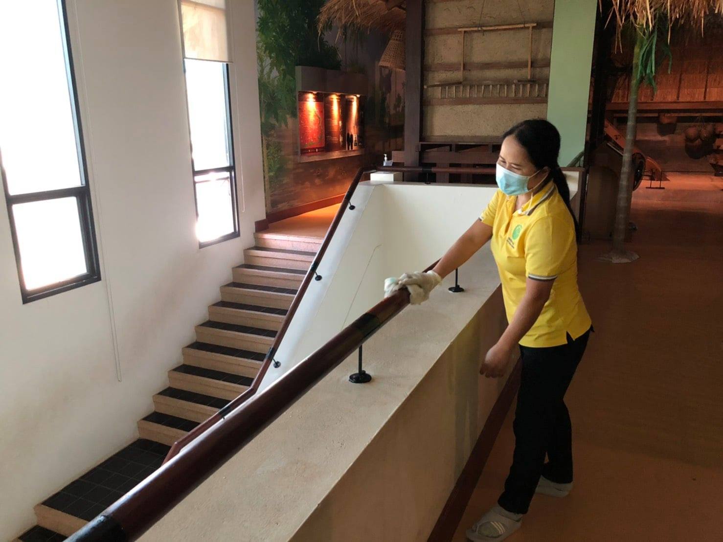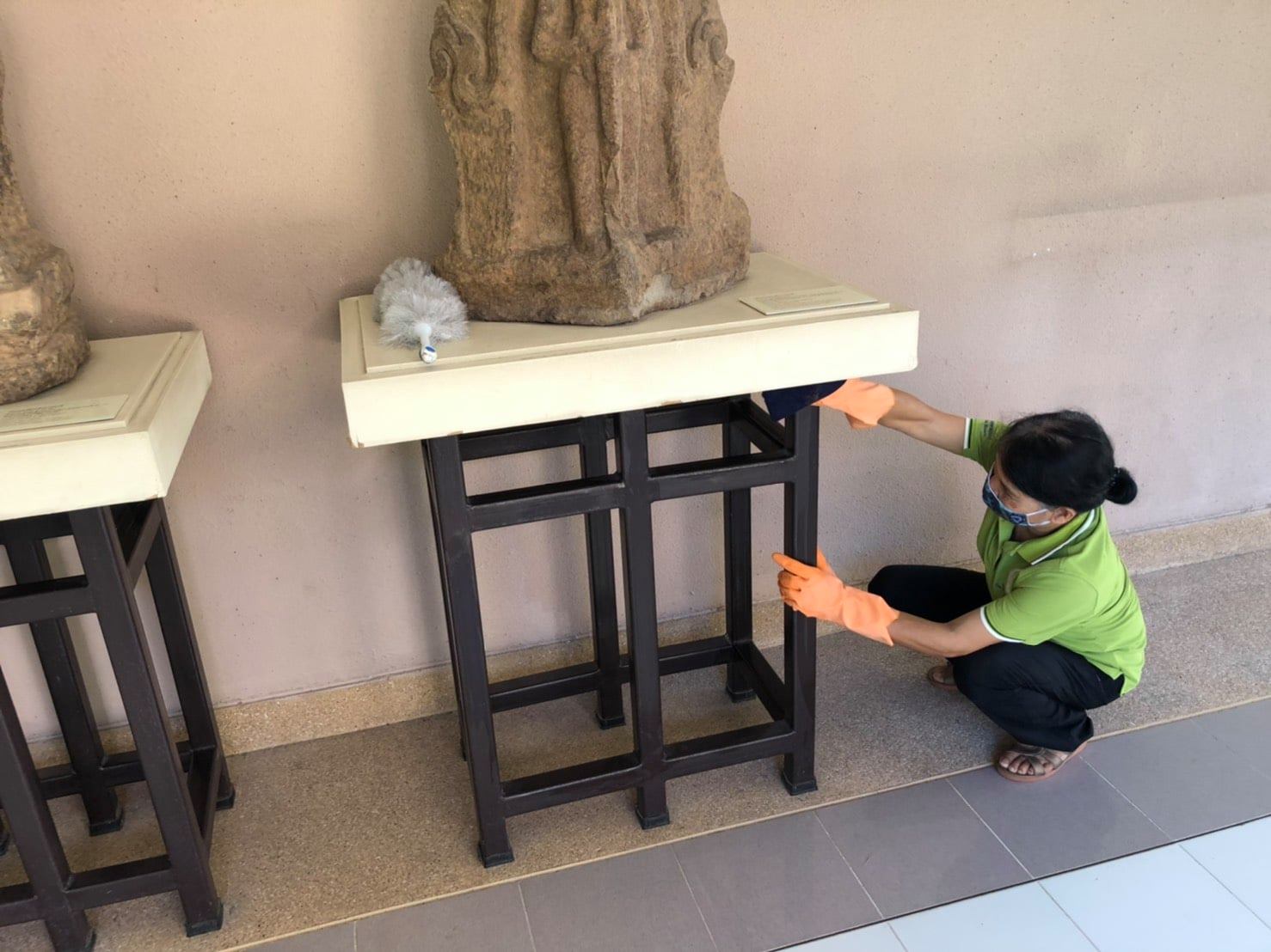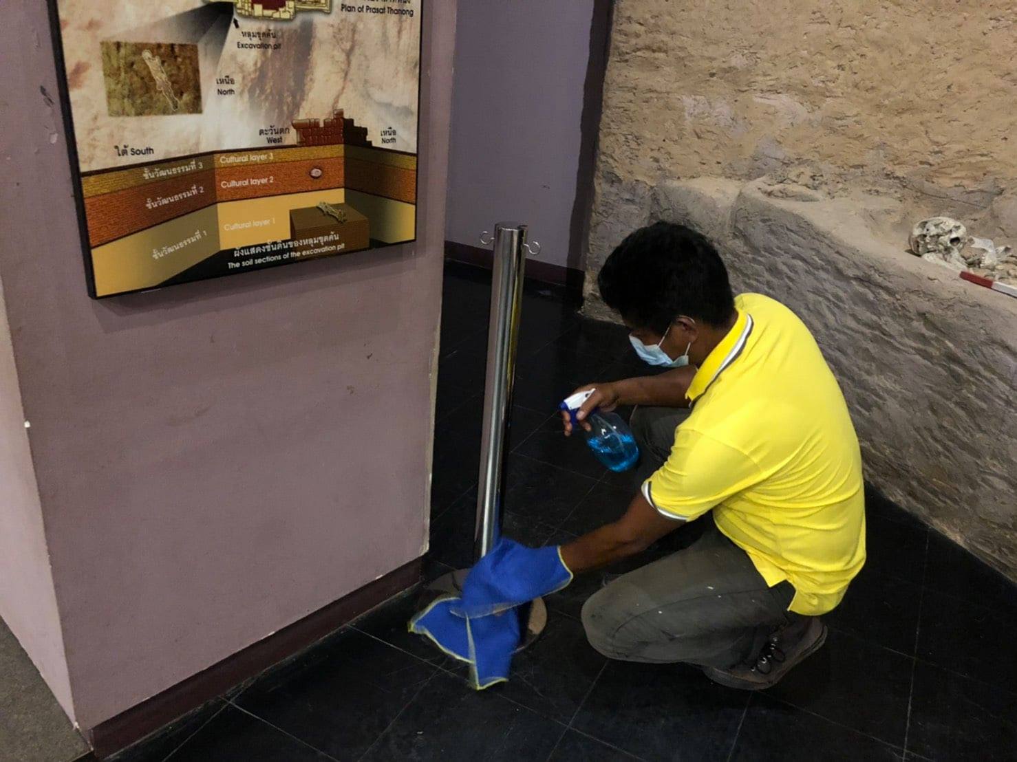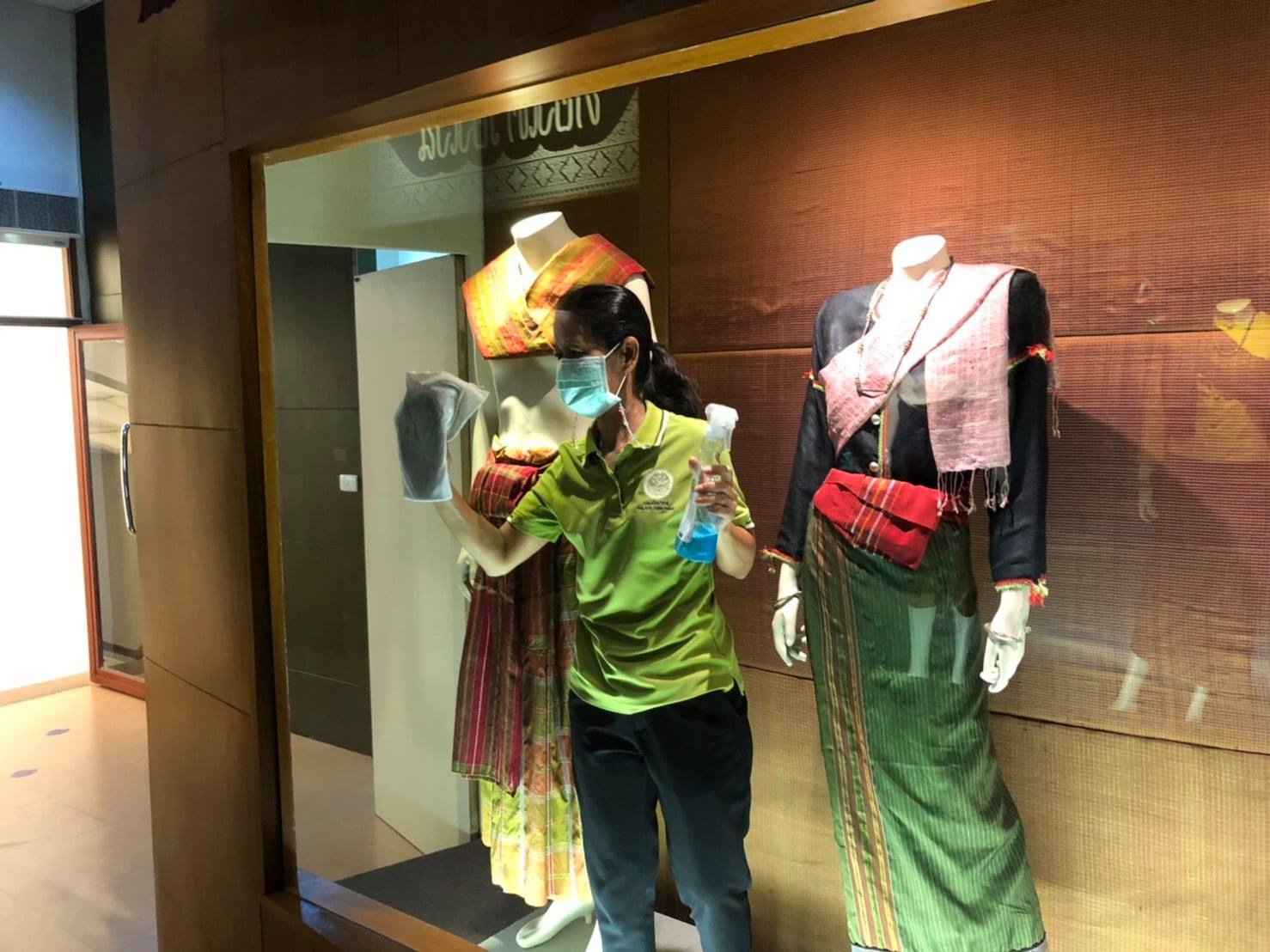 วันอาทิตย์ที่ ๒๐ มิถุนายน พ.ศ. ๒๕๖๔ เจ้าหน้าที่พิพิธภัณฑสถานแห่งชาติ สุรินทร์ ร่วมกันทำความสะอาดฆ่าเชื้อไวรัสโคโรน่า ๒๐๑๙ หลังจากปิดให้บริการนักท่องเที่ยวแล้ว บริเวรห้องจัดแสดงนิทรรศการและบริเวณรอบๆ