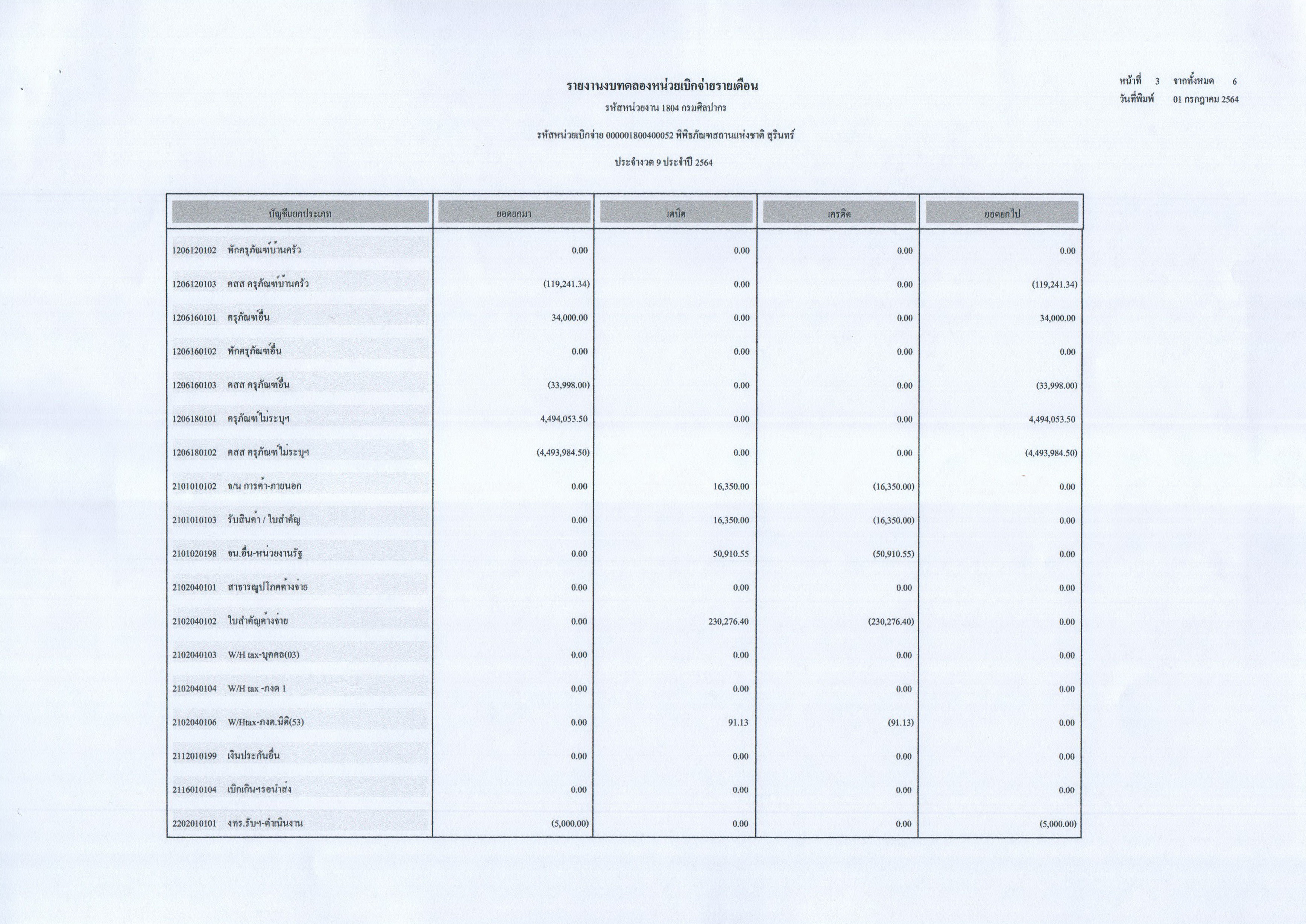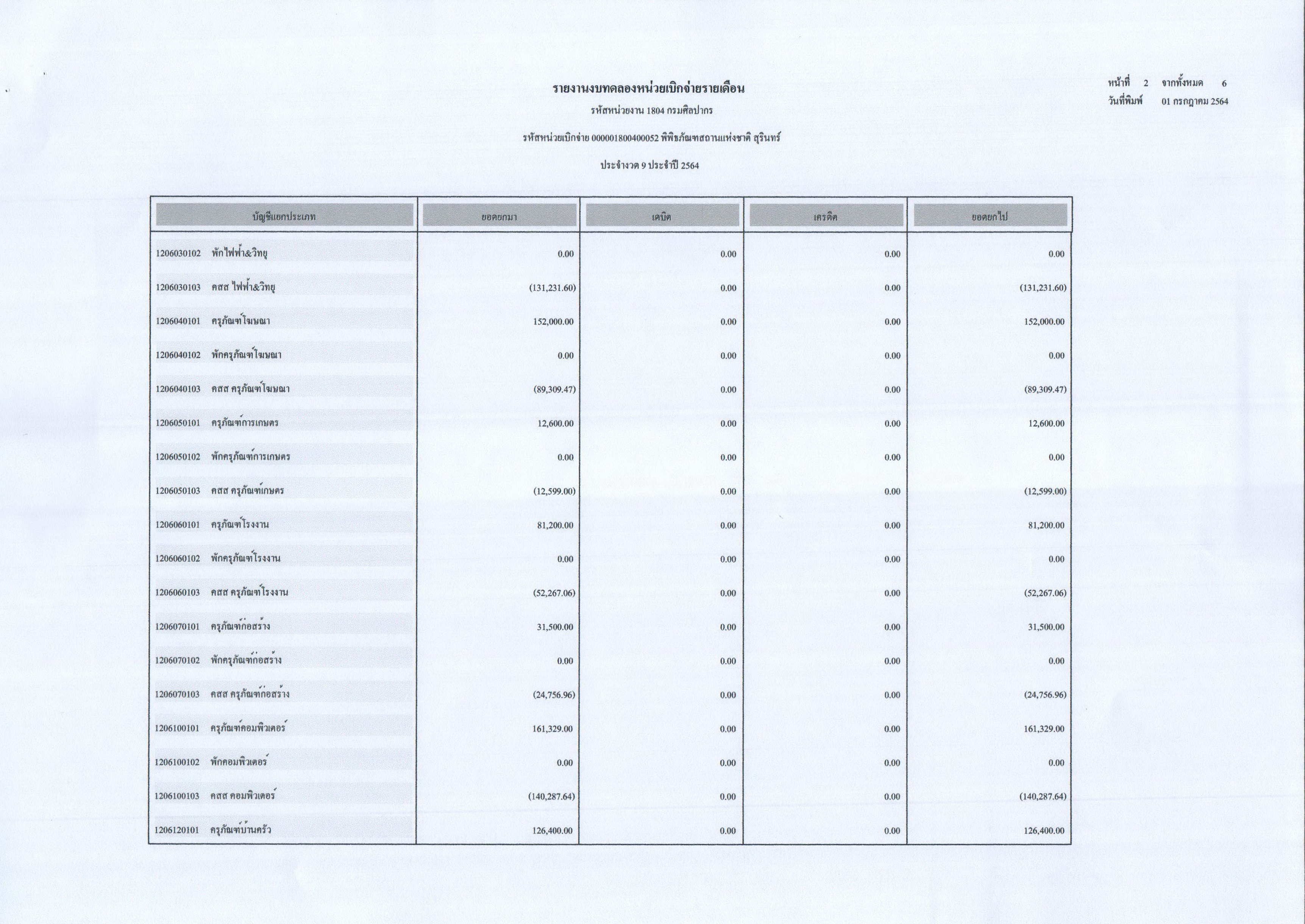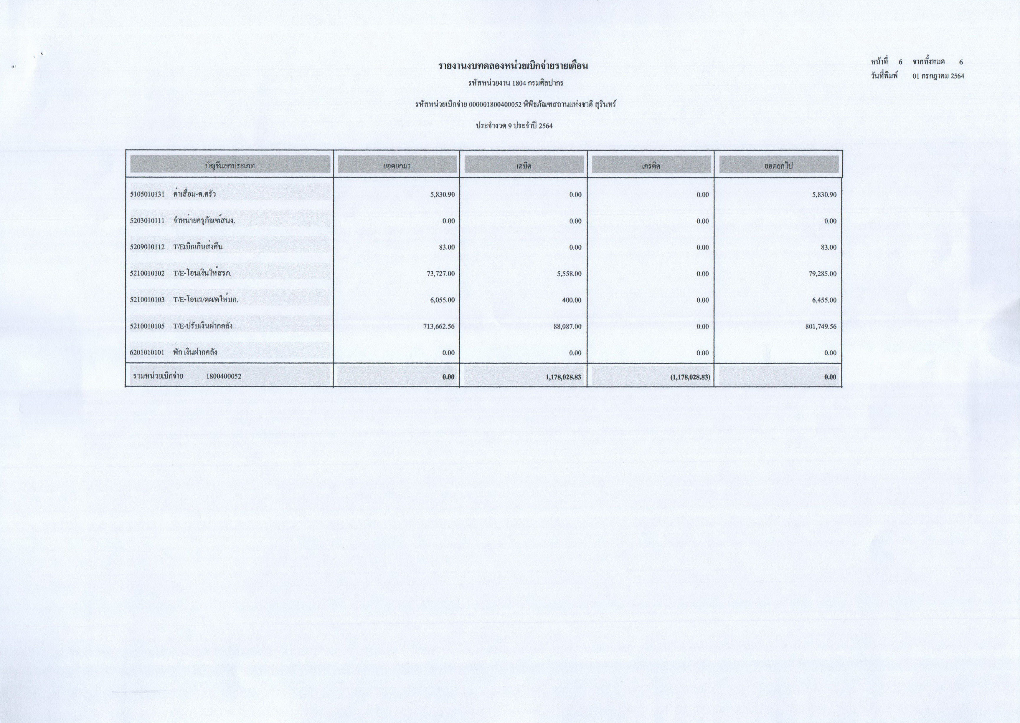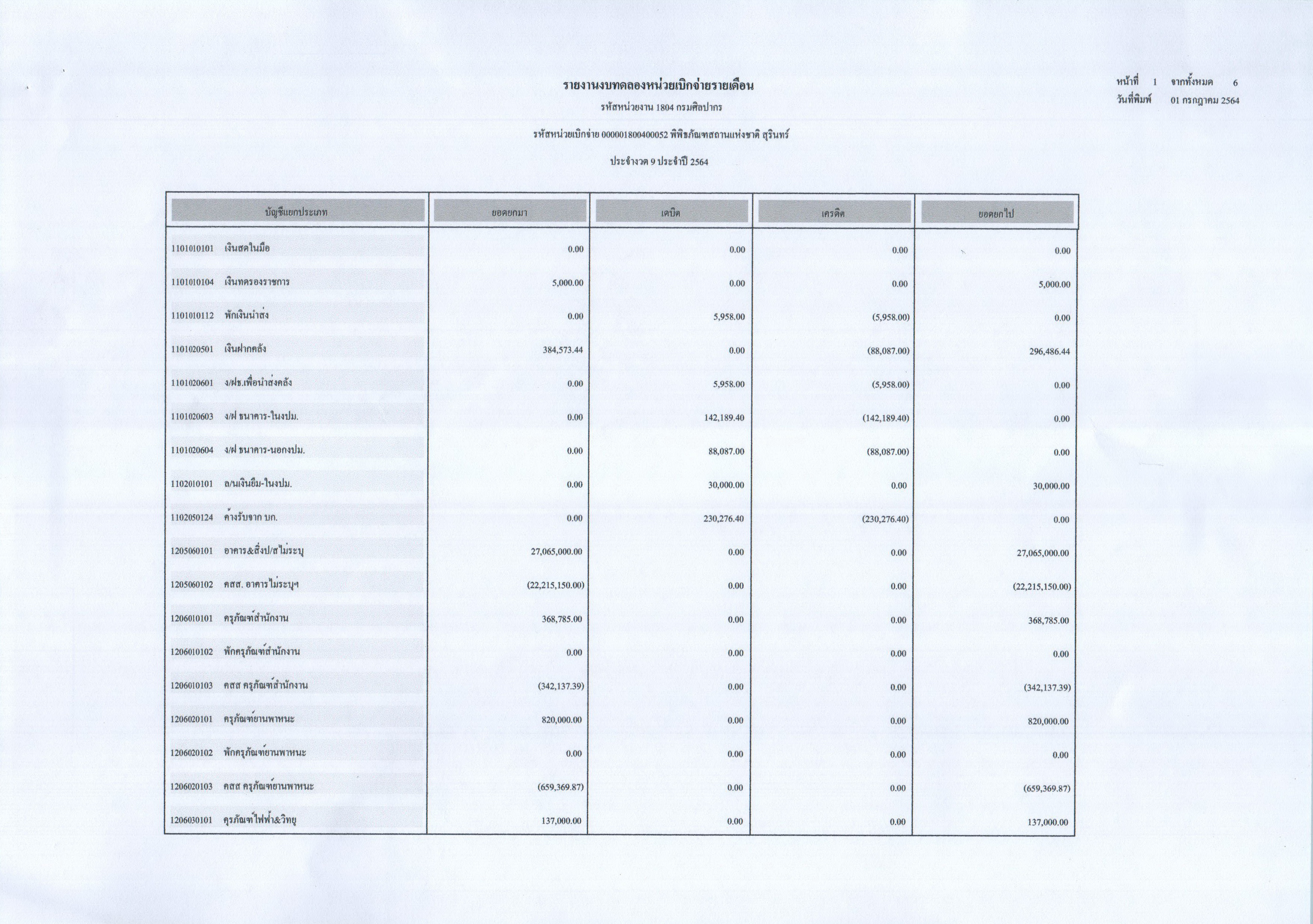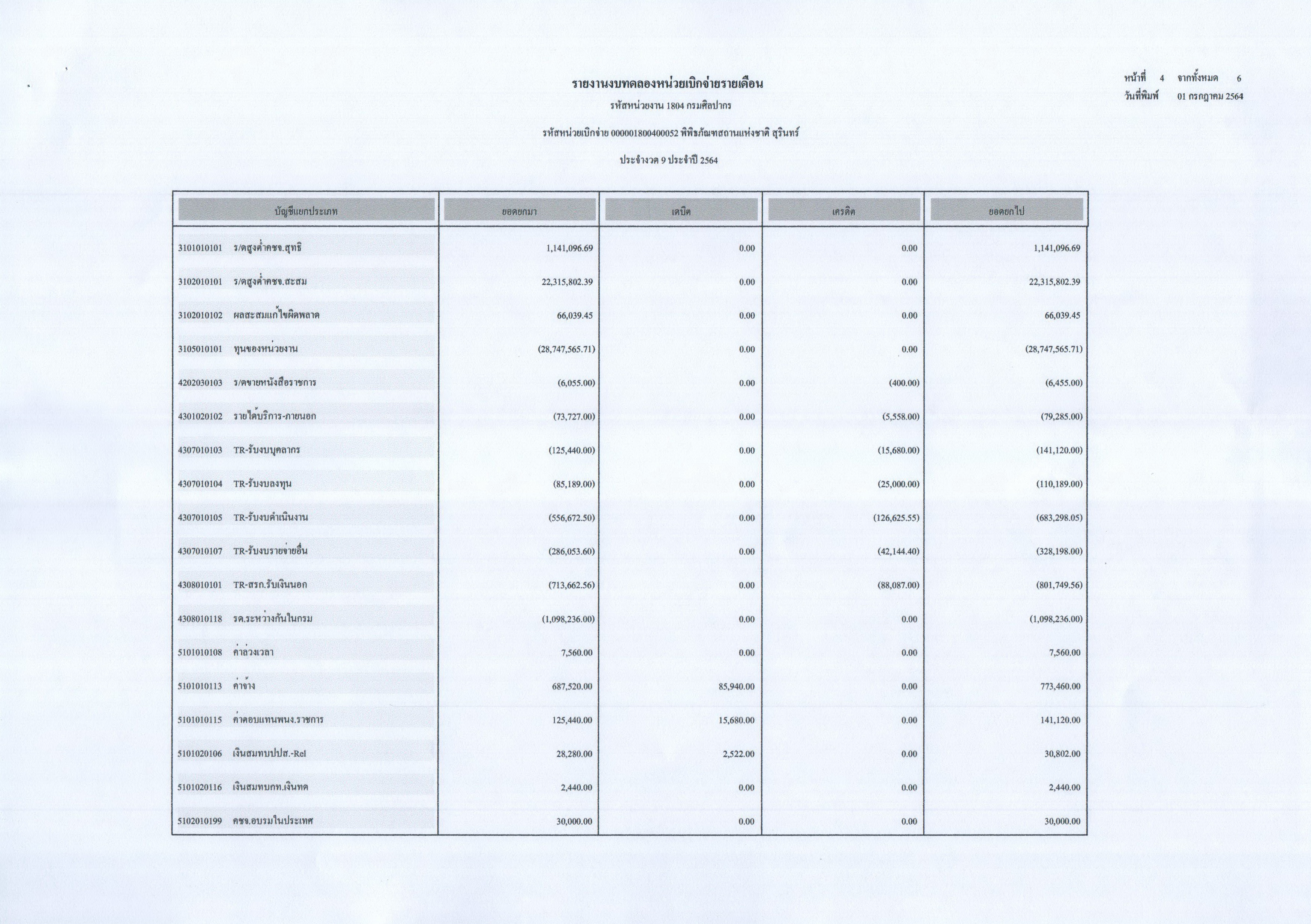 รายงานงบทดลองประจำเดือนมิถุนายน พ.ศ. ๒๕๖๔