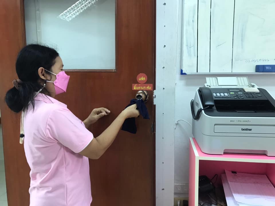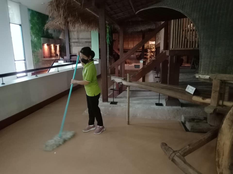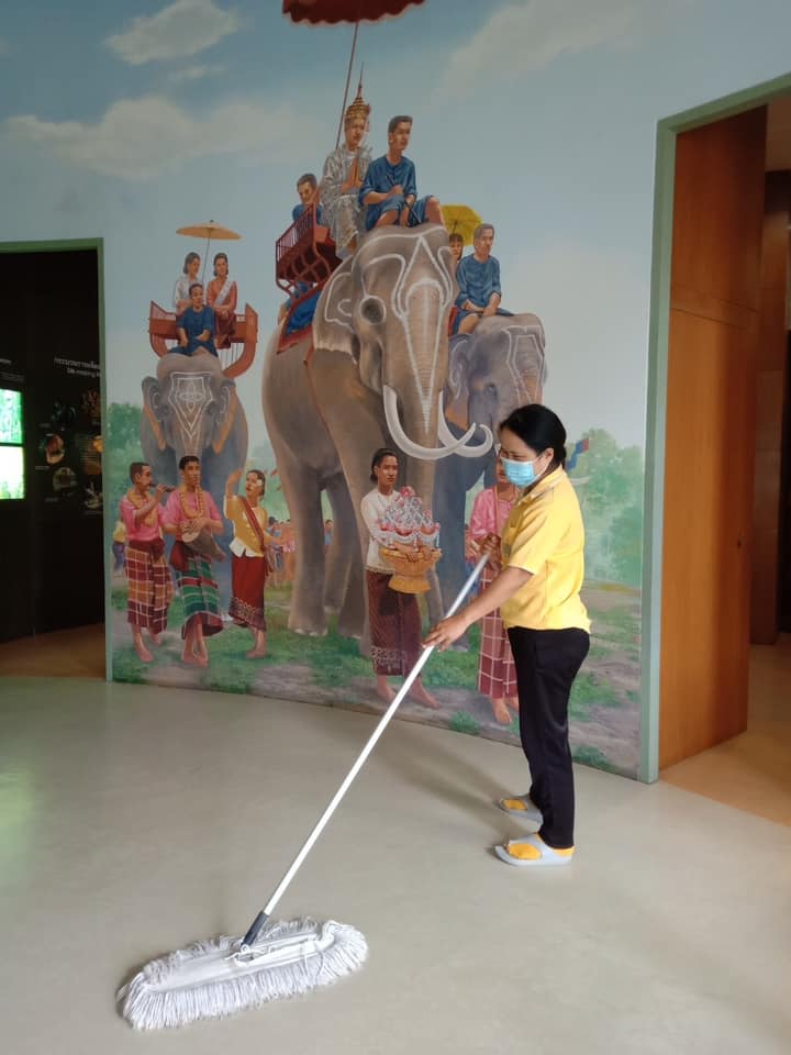 วันอาทิตย์ที่ ๒๒ สิงหาคม พ.ศ. ๒๕๖๔ เจ้าหน้าที่พิพิธภัณฑสถานแห่งชาติ สุรินทร์ ร่วมกันทำความสะอาดเพื่อฆ่าเชื้อไวรัสโคโรน่า - ๒๐๑๙ หลังปิดบริการแล้ว ตามมาตรการการป้องกันการแพร่ระบาดของเชื้อโควิด - ๑๙