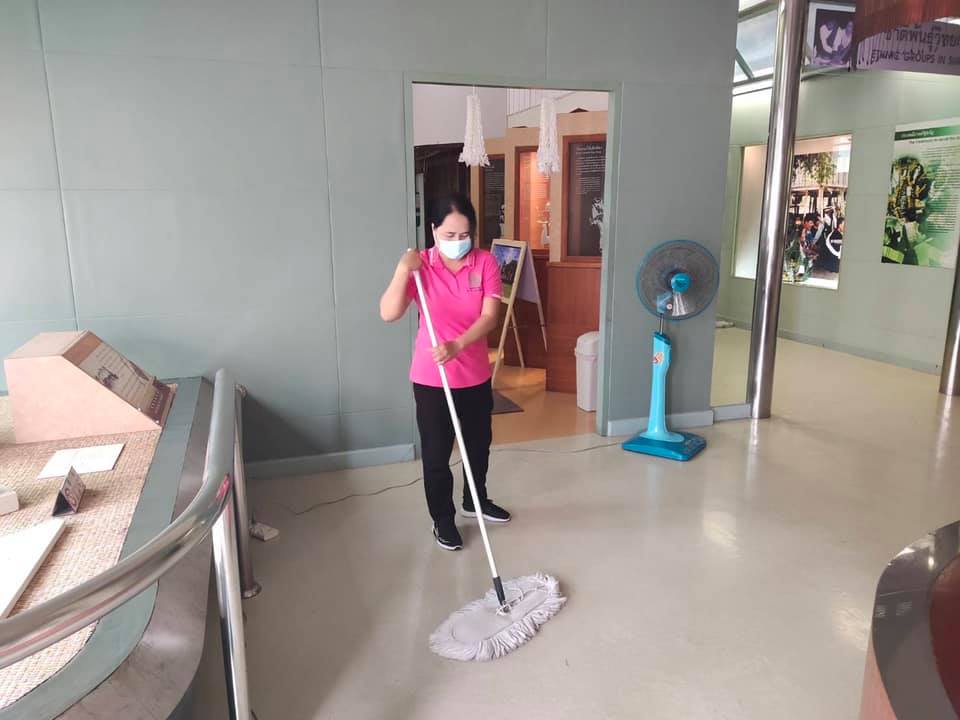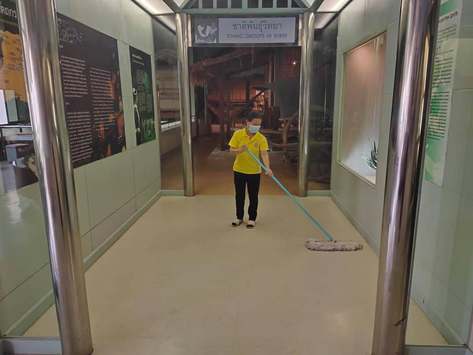 วันอาทิตย์ที่ ๕ กันยายน พ.ศ. ๒๕๖๔ เจ้าหน้าที่พิพิธภัณฑสถานแห่งชาติ สุรินทร์ ทำความสะอาดห้องจัดแสดงนิทรรศการและบริเวณพิพิธภัณฑสถานแห่งชาติ สุรินทร์ เพื่อป้องกันการแพร่ระบาดของเชื้อไวรัสโควิด - ๑๙