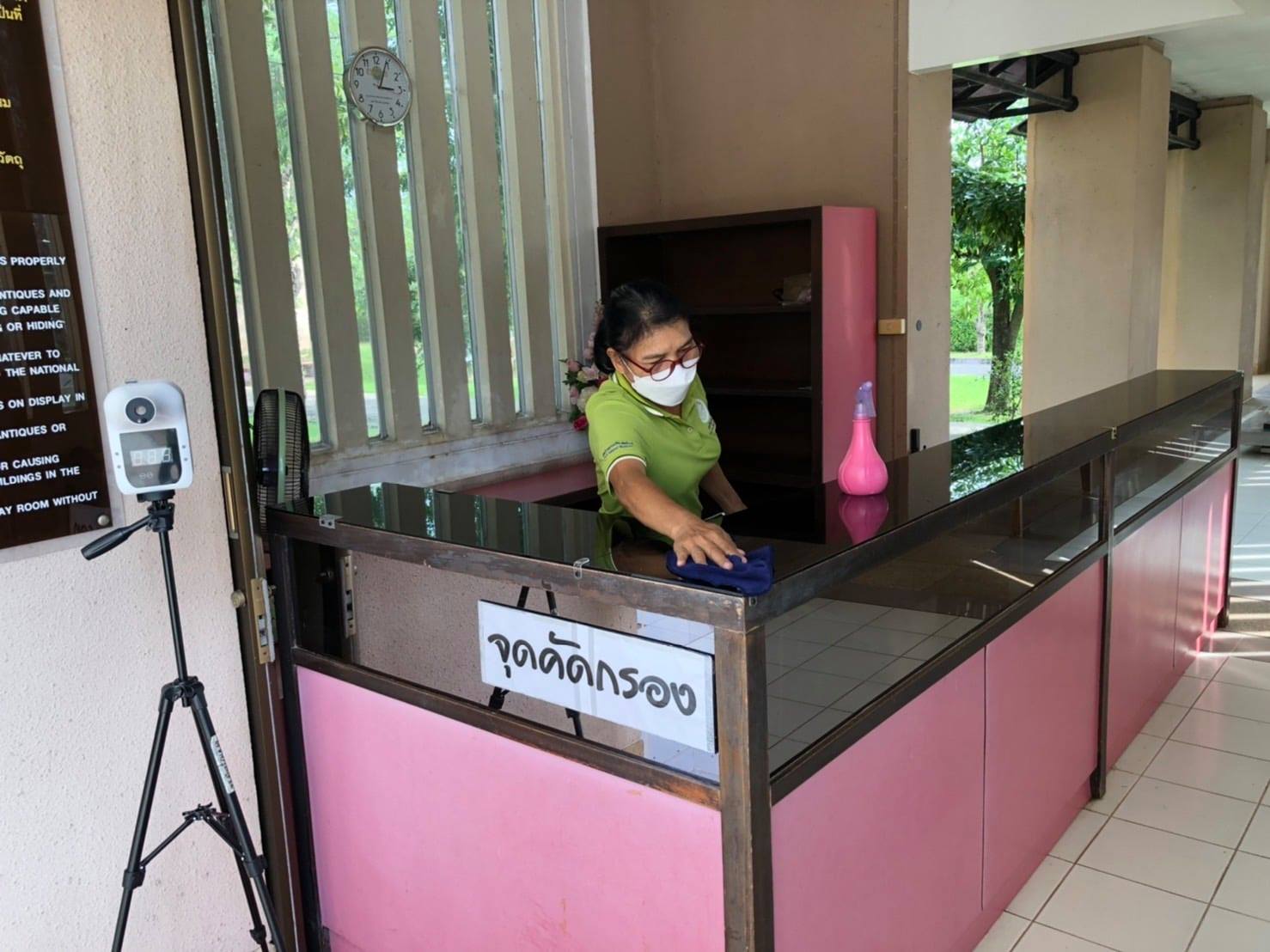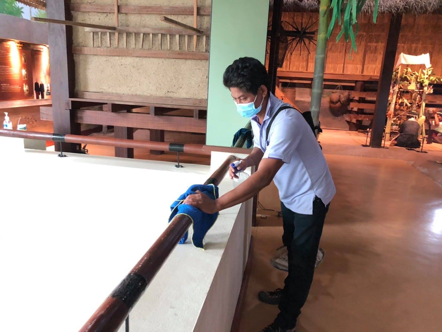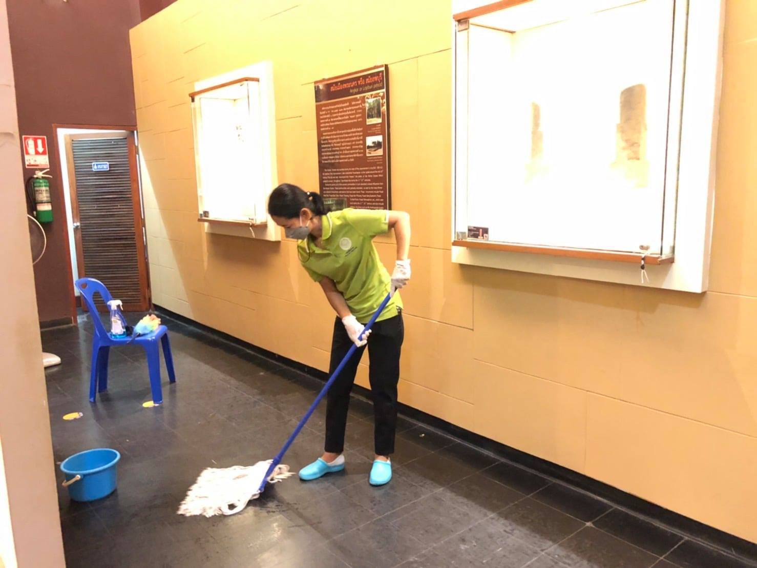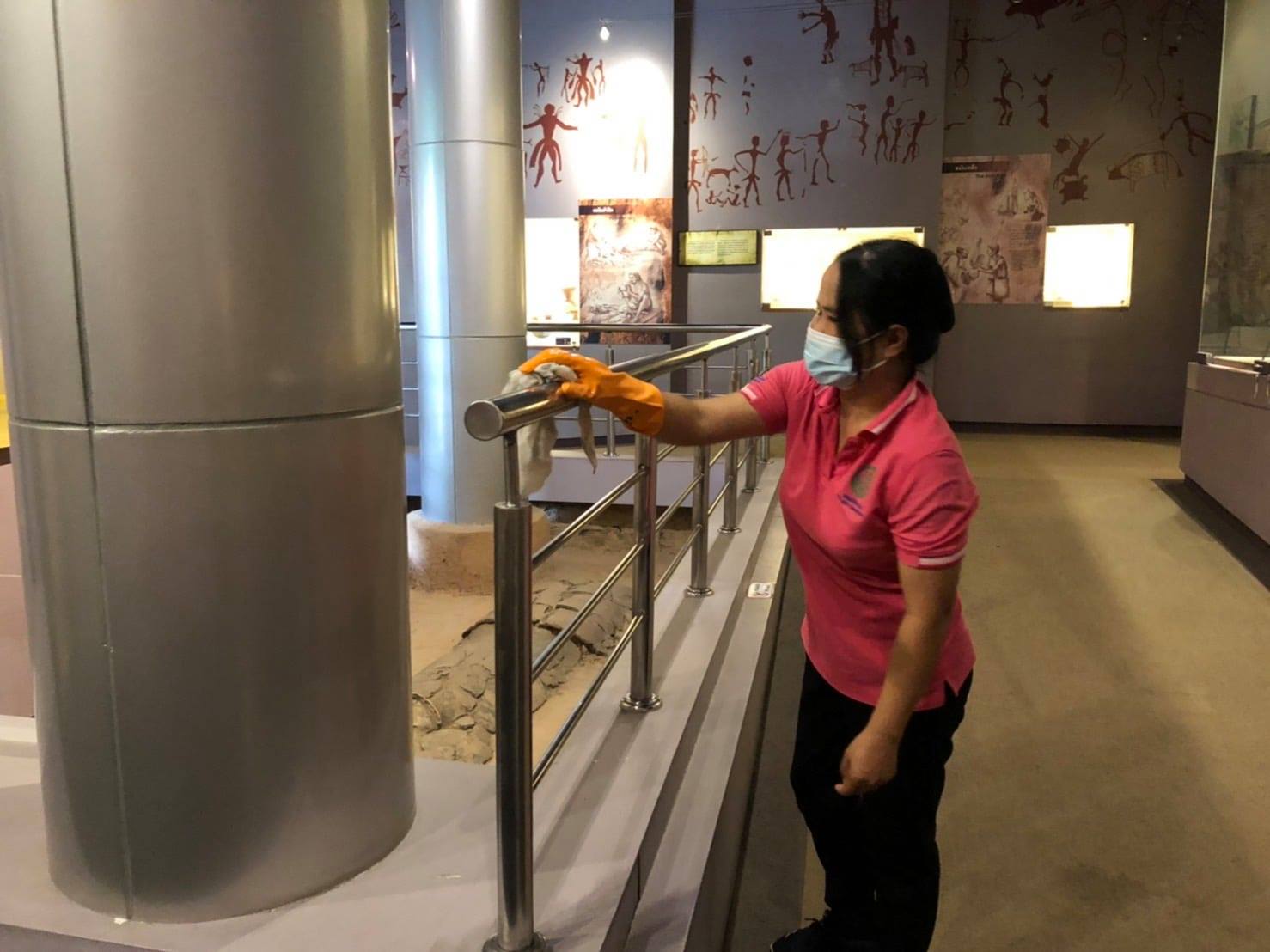 วันอาทิตย์ที่ ๓ ตุลาคม พ.ศ. ๒๕๖๔ เจ้าหน้าที่พิพิธภัณฑสถานแห่งชาติ สุรินทร์ ทำความสะอาดห้องจัดแสดงนิทรรศการเพื่อฆ่าเชื้อและเตรียมความพร้อมบริการนักท่องเที่ยวในวันต่อไป
