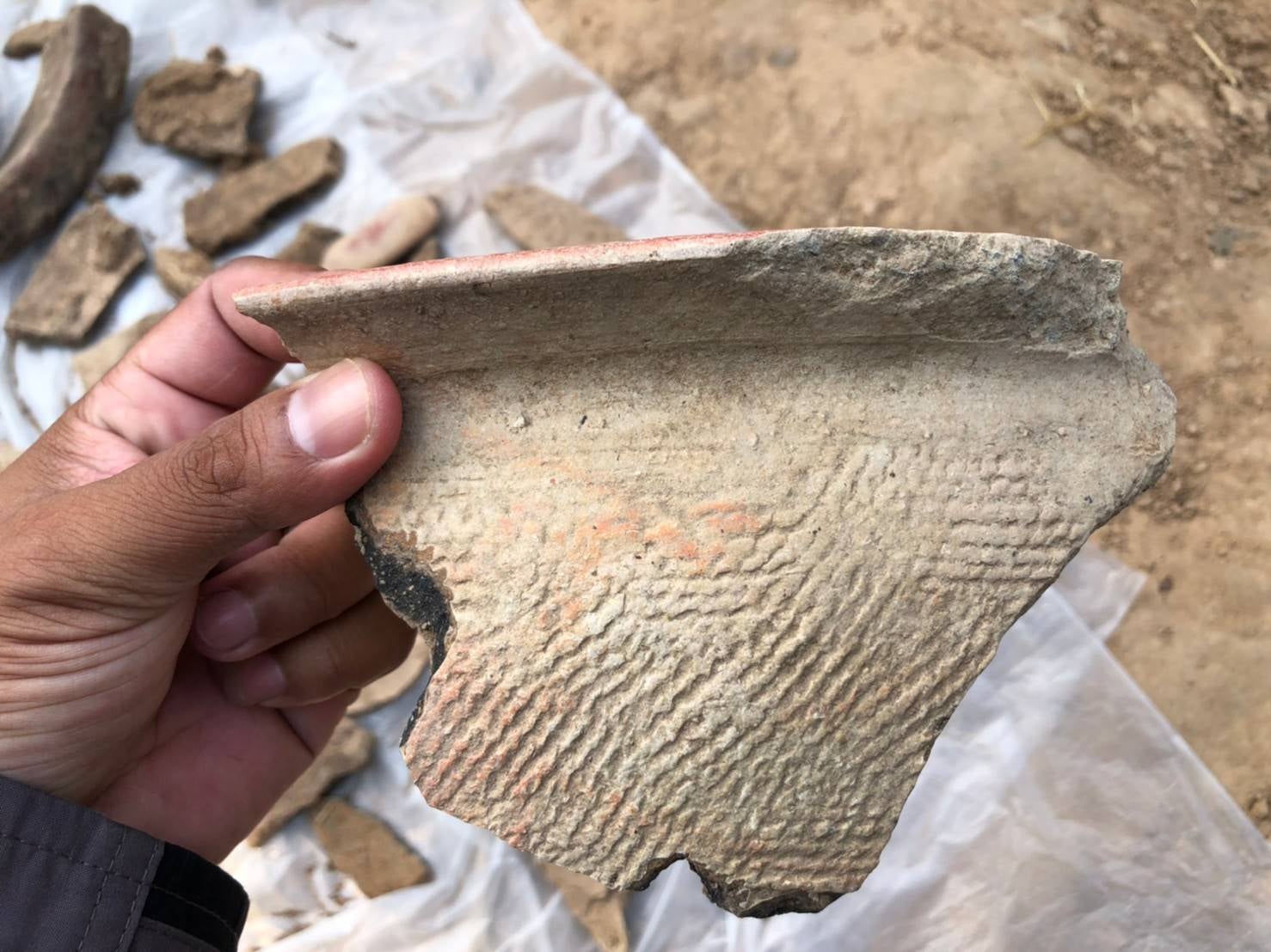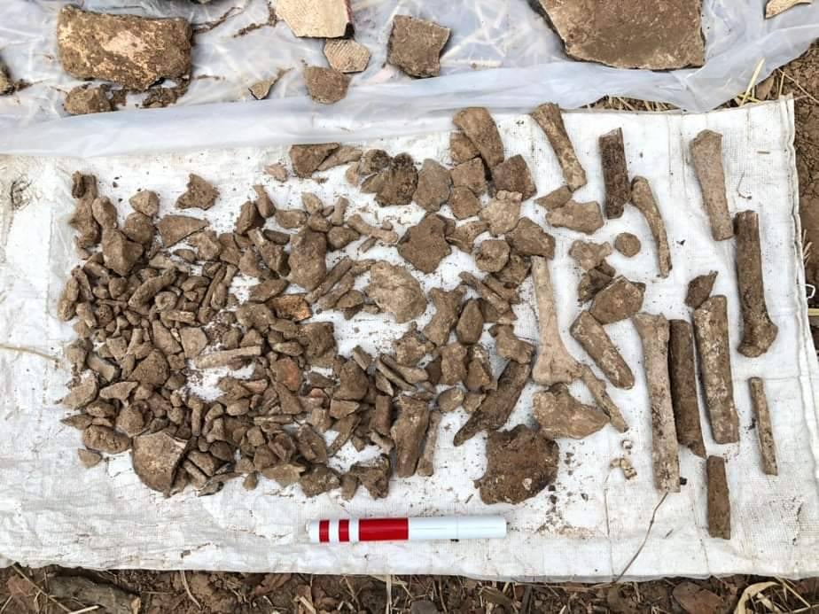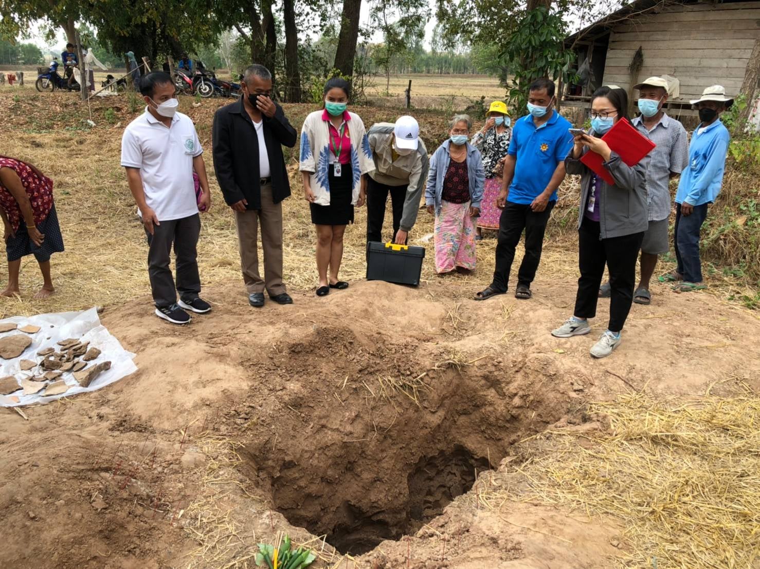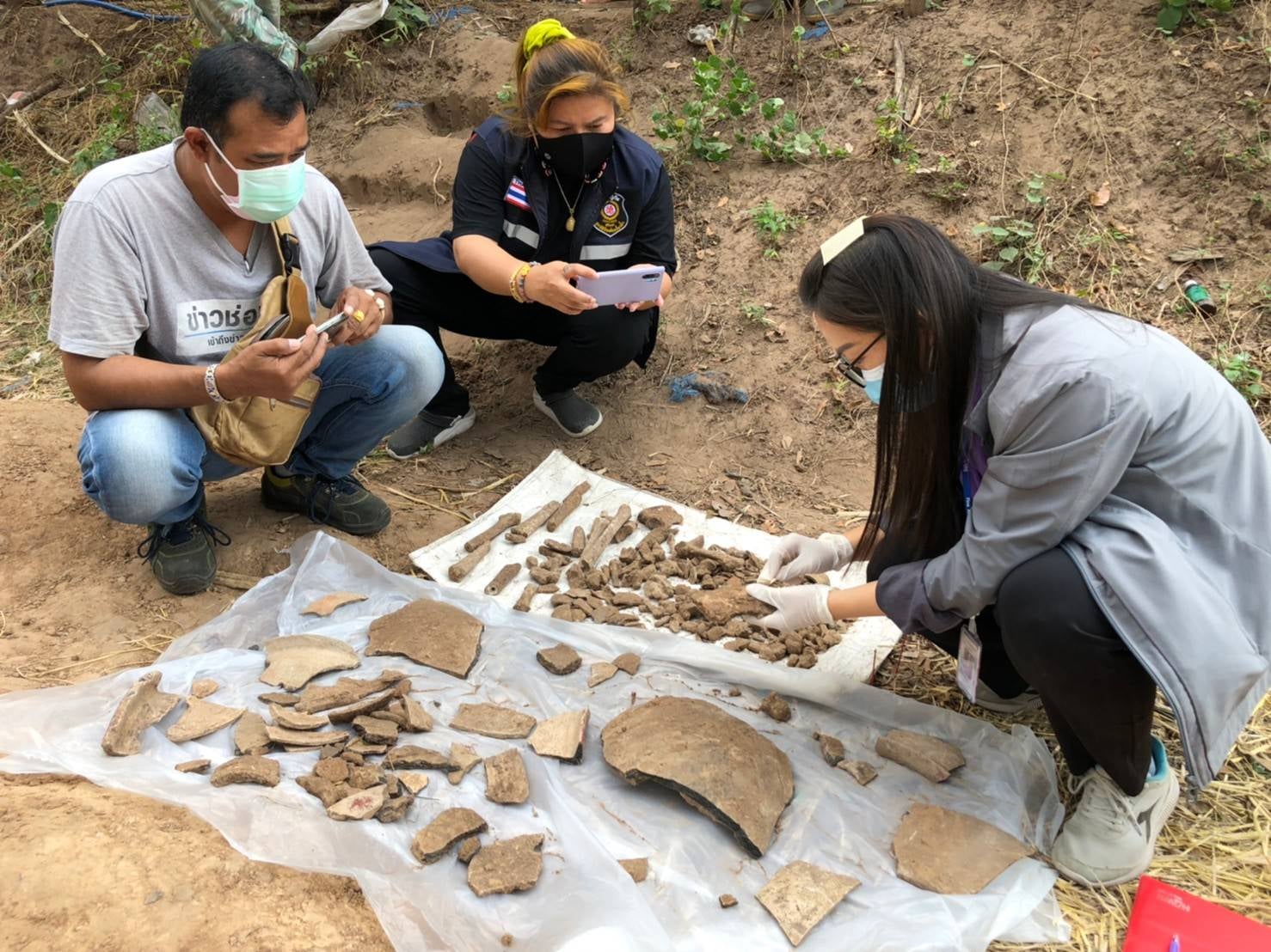 การนี้ พิพิธภัณฑสถานแห่งชาติ สุรินทร์ โดยนางสาวกมลรัตน์ ชวนสบาย ตำแหน่ง ภัณฑารักษ์ปฏิบัติการ และนายกรภัทร์ สุขใหญ่ ตำแหน่ง พนักงานประจำพิพิธภัณฑ์ พร้อมเจ้าหน้าที่ ได้ประสานและเข้าดำเนินการตรวจสอบพื้นที่ดังกล่าว เมื่อวันที่ ๒๙ มกราคม ๒๕๖๕ พบภาชนะดินเผา จำนวน ๓ ใบ สันนิษฐานเบื้องต้นว่าเป็นภาชนะดินเผาเนื้อดิน (Earthen Ware) สมัยก่อนประวัติศาสตร์ตอนปลาย อายุประมาณ ๒,๐๐๐-๑,๕๐๐ ปีมาแล้ว ภายในพบชิ้นส่วนโครงกระดูกและฟัน ทั้งนี้ พิพิธภัณฑสถานแห่งชาติ สุรินทร์ ได้แจ้งระเบียบและขั้นตอนการดำเนินงานทางโบราณคดีเบื้องต้นแก่เจ้าของพื้นที่ ผู้ใหญ่บ้านและประชาชนเพื่อทราบ พร้อมได้กั้นเขตพื้นที่ดังกล่าว และจะดำเนินการประสานกลุ่มโบราณคดี สำนักศิลปากรที่ ๑๐ นครราชสีมา เพื่อตรวจสอบ ต่อไป