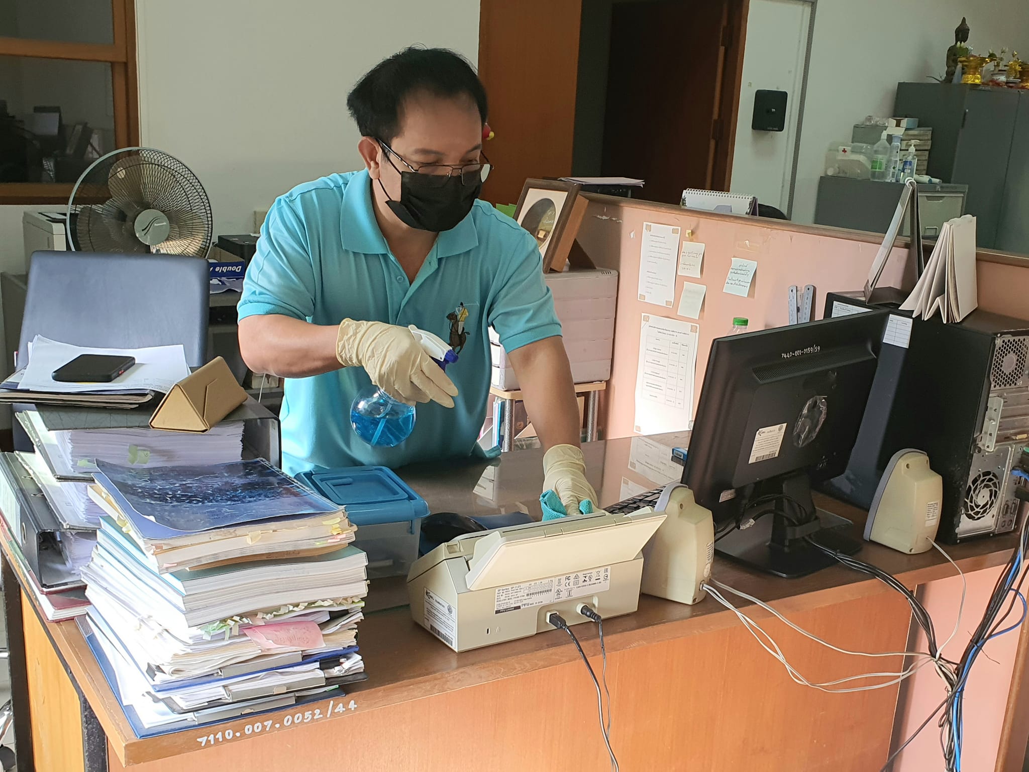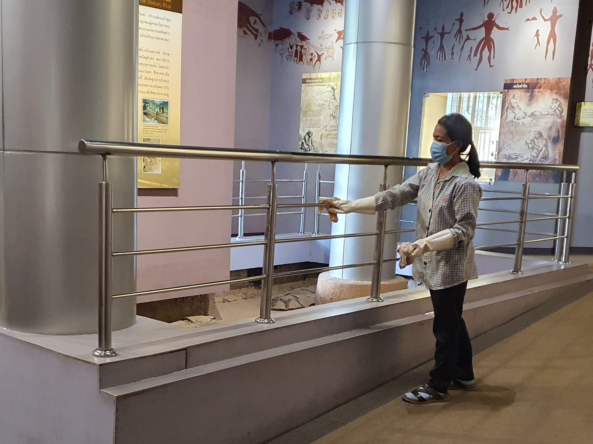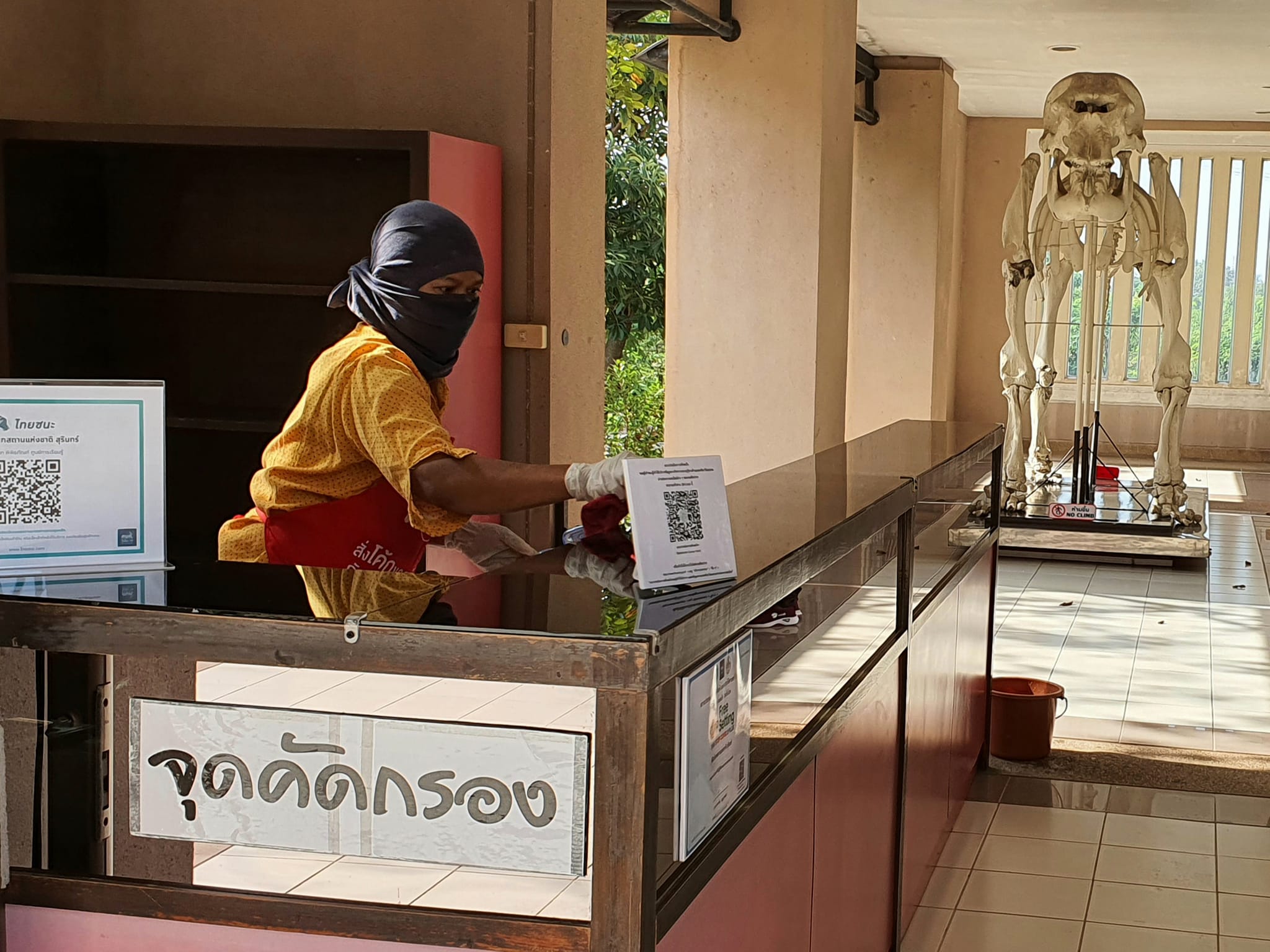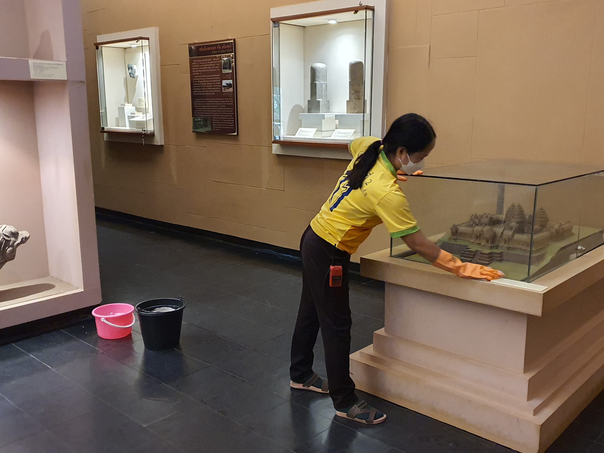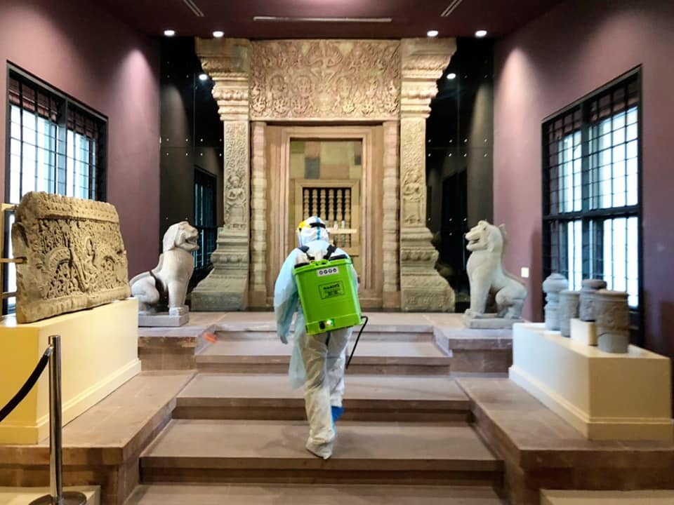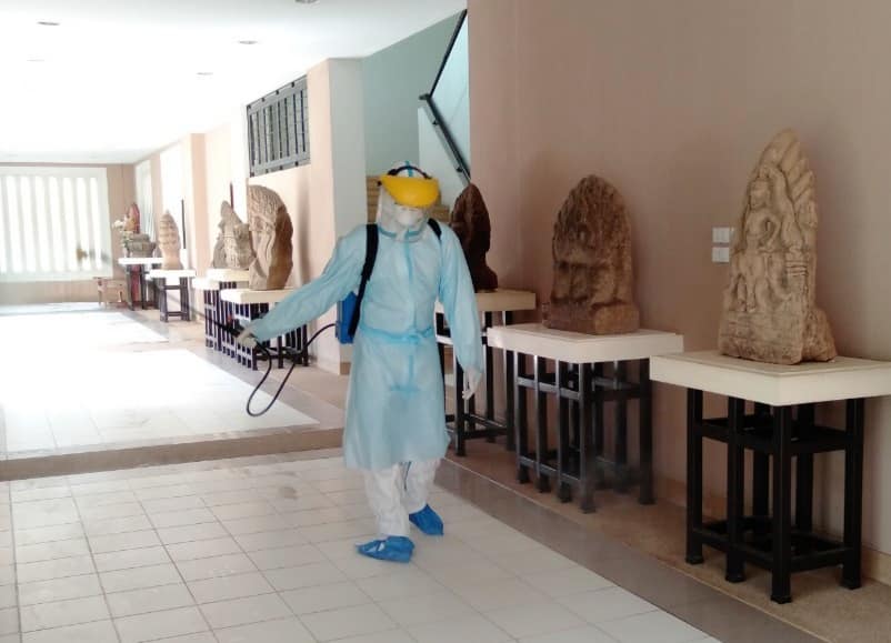 วันที่ ๒๖ - ๒๗ กุมภาพันธ์ พ.ศ. ๒๕๖๕ เจ้าหน้าที่มูลนิธิธรรมรัศมีมณีรัตน์(หน่วยกู้ภัยมังกรสุรินทร์) โดยองค์การบริหารส่วนตำบลเฉนียง และเจ้าหน้าที่พิพิธภัณฑสถานแห่งชาติ สุรินทร์ ร่วมกันทำความสะอาด ฆ่าเชื้อไวรัสภายในอาคารจัดแสดง ห้องนิทรรศการ สำนักงาน และบ้านพัก เพื่อป้องกันการแพร่ระบาดของเชื้อไวรัสโควิด ๑๙