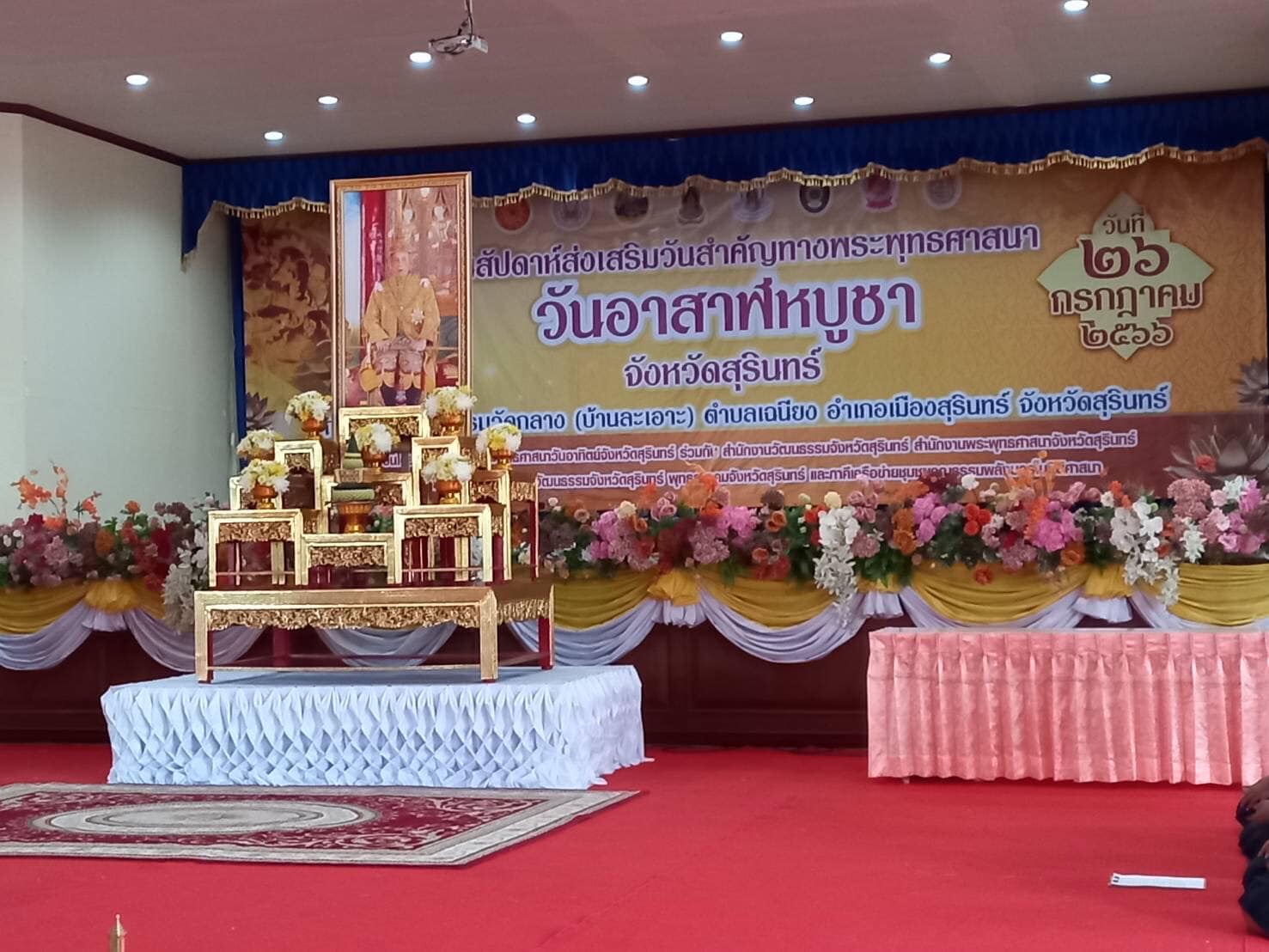 วันที่ ๒๖ กรกฏาคม พ.ศ.๒๕๖๖ เวลา ๐๙.๐๐ น. ร่วมงานวันสำคัญทางพระพุทธศาสนาอาสาฬหบูชา เฉลิมพระเกียรติพระบาทสมเด็จพระเจ้าอยู่หัว เนื่องในโอกาสวันเฉลิมพระชนมพรรษา ๒๘ กรกฎาคม พ.ศ. ๒๕๖๖ จังหวัดสุรินทร์ ณ ศูนย์ปฏิบัติธรรมวัดกลาง กิจกรรม ประกอบด้วย พิธีเจริญพระพุทธมนต์ ถวายราชสักการะ ถวายราชสดุดี ถวายพระพรชัยมงคล การแสดงตนเป็นพุทธมามกะ ถวายเทียนพรรษา และการประกวดแข่งขันกิจกรรมทางพระพุทธศาสนา