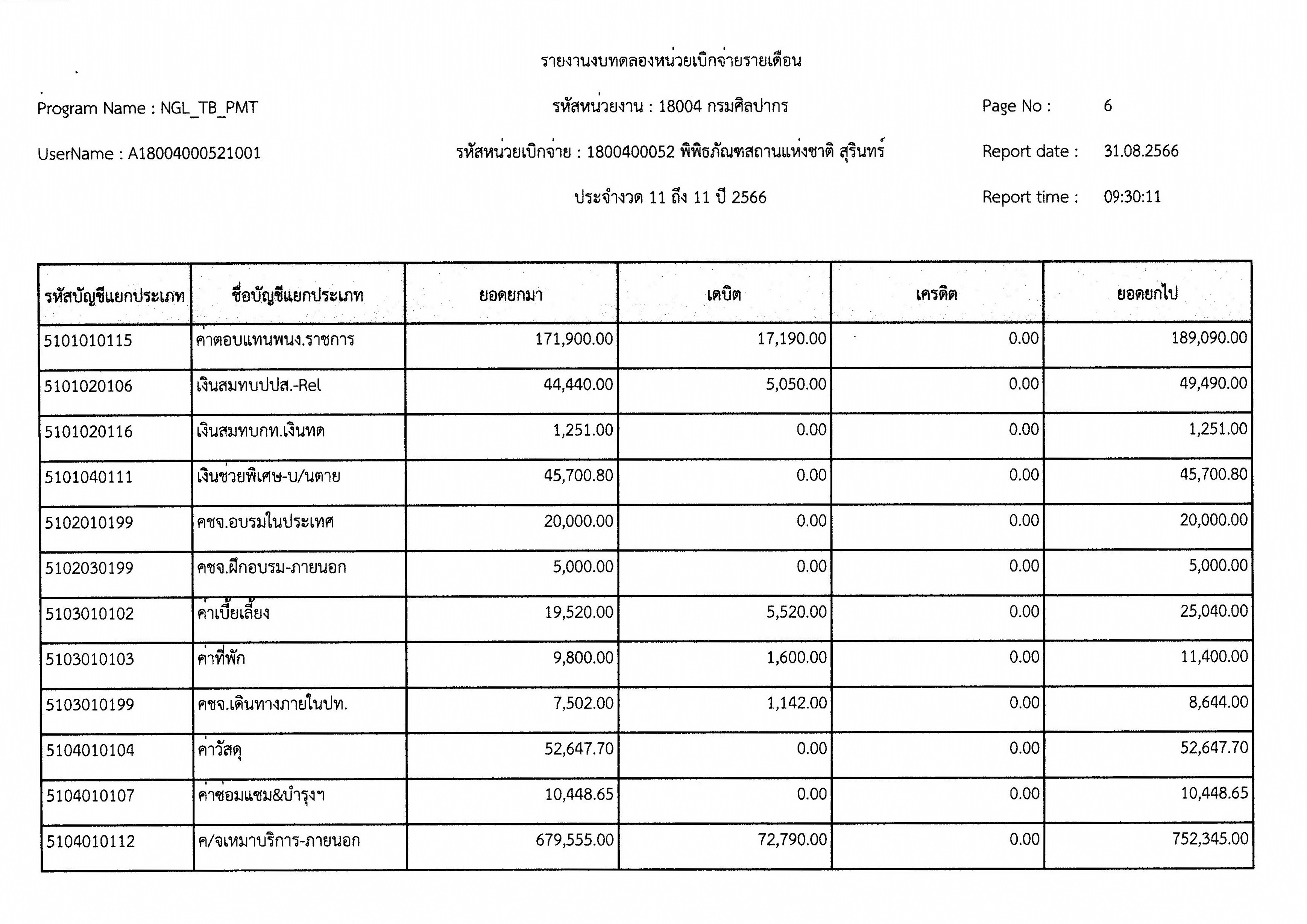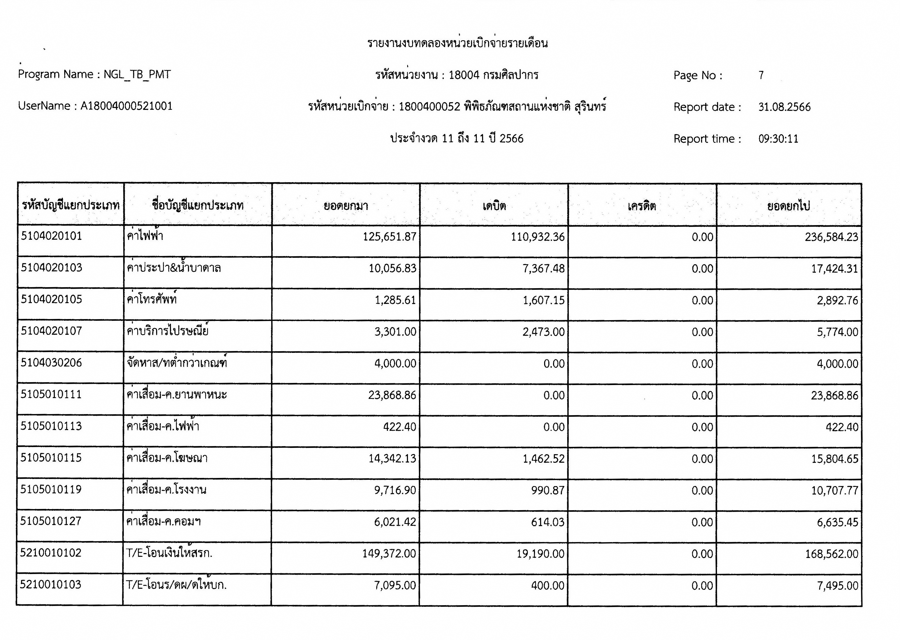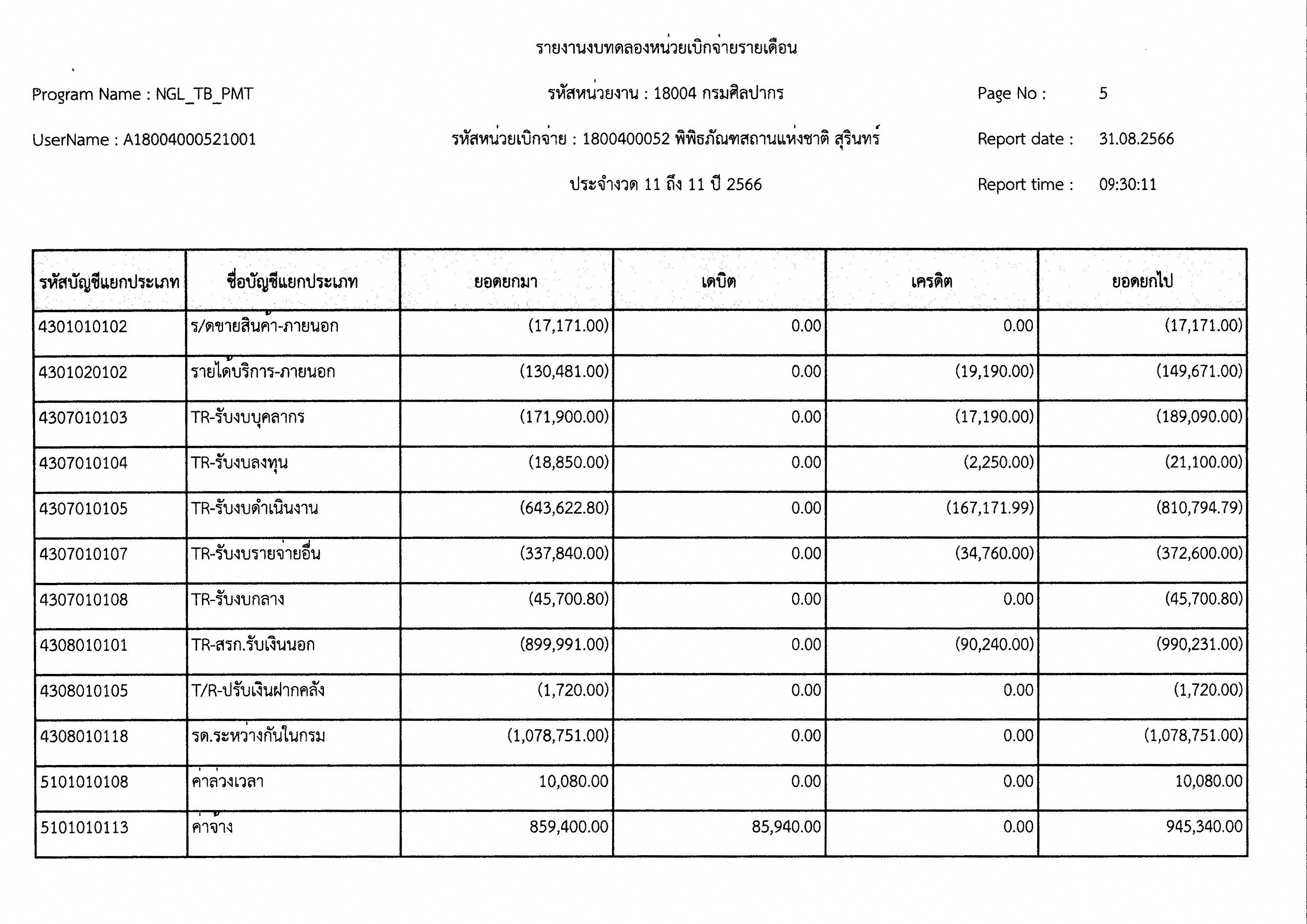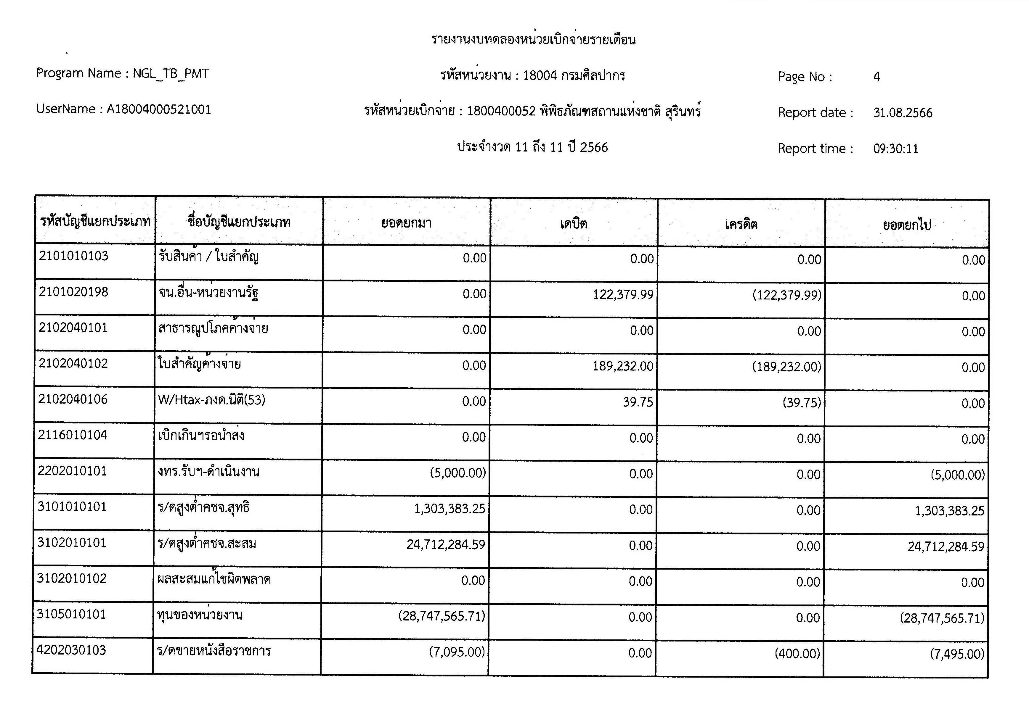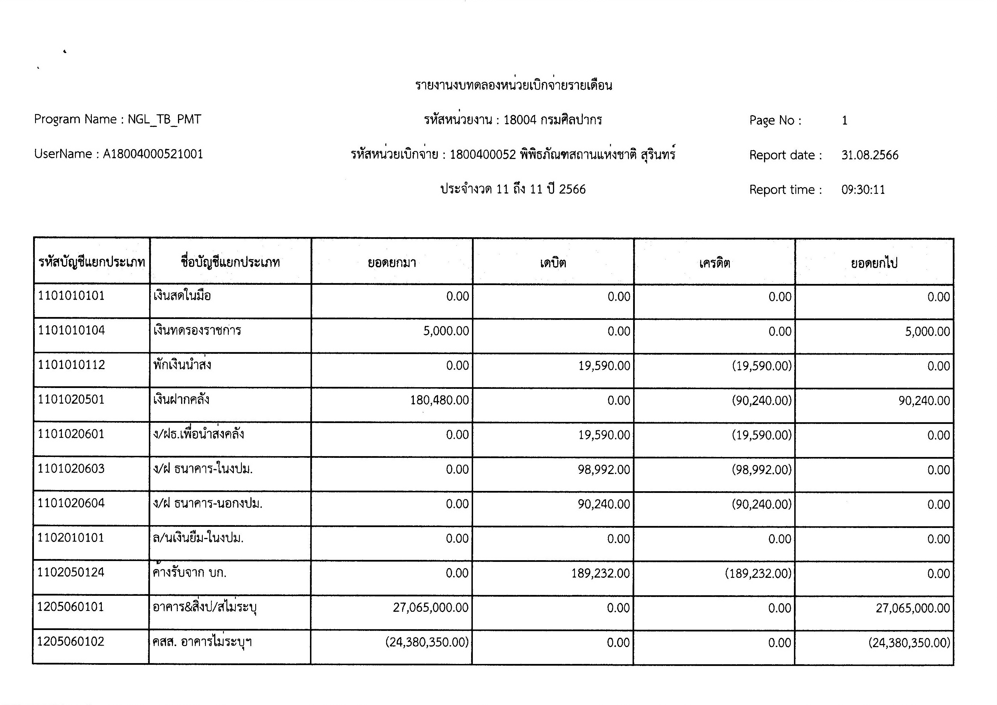 รายงานงบทดลองหน่วยเบิกจ่ายเดือน สิงหาคม พ.ศ. ๒๕๖๖
