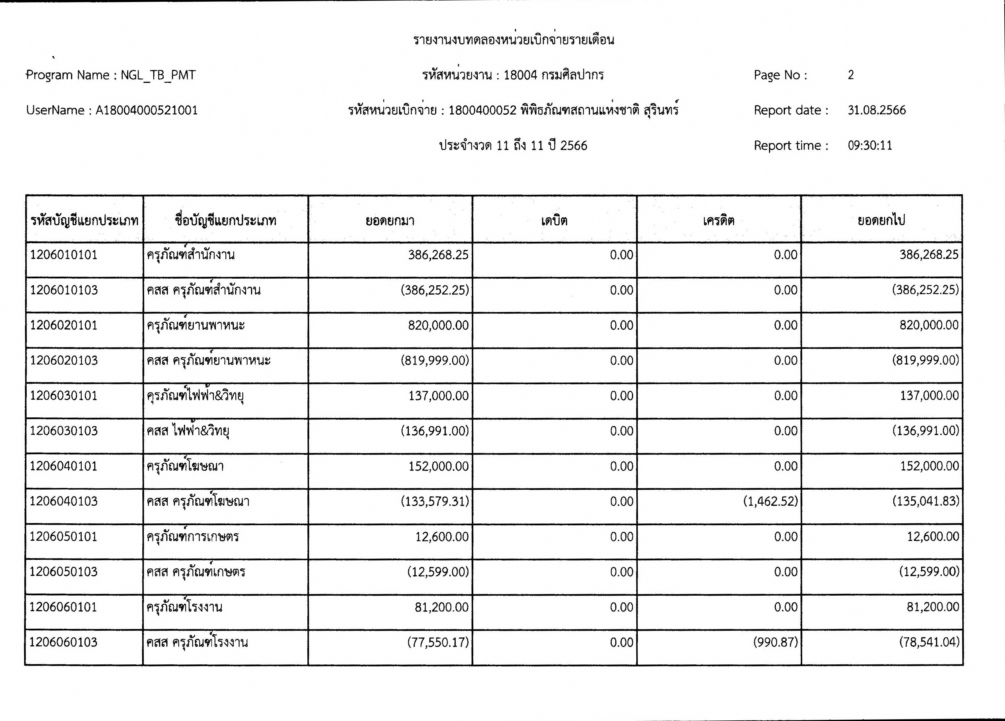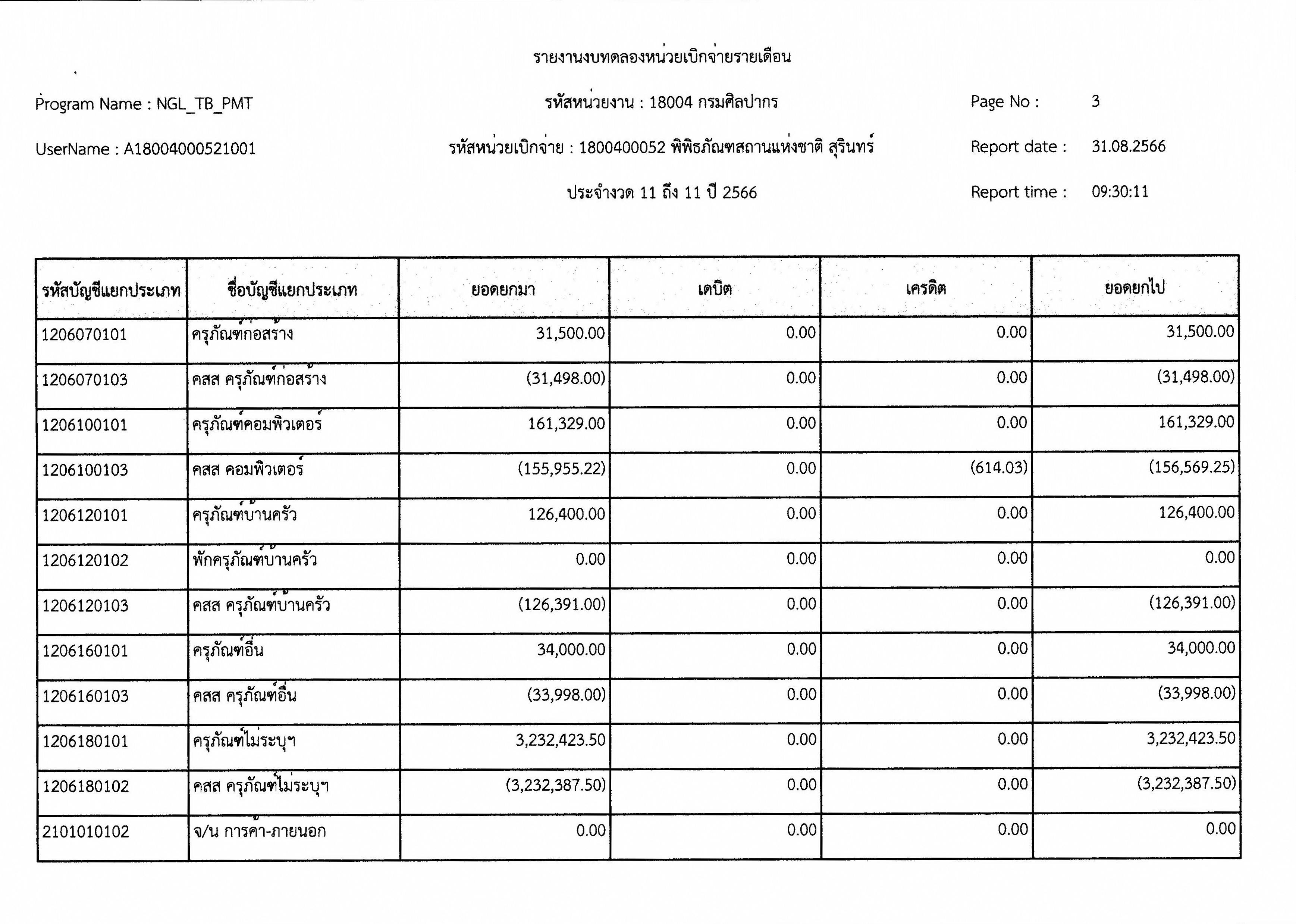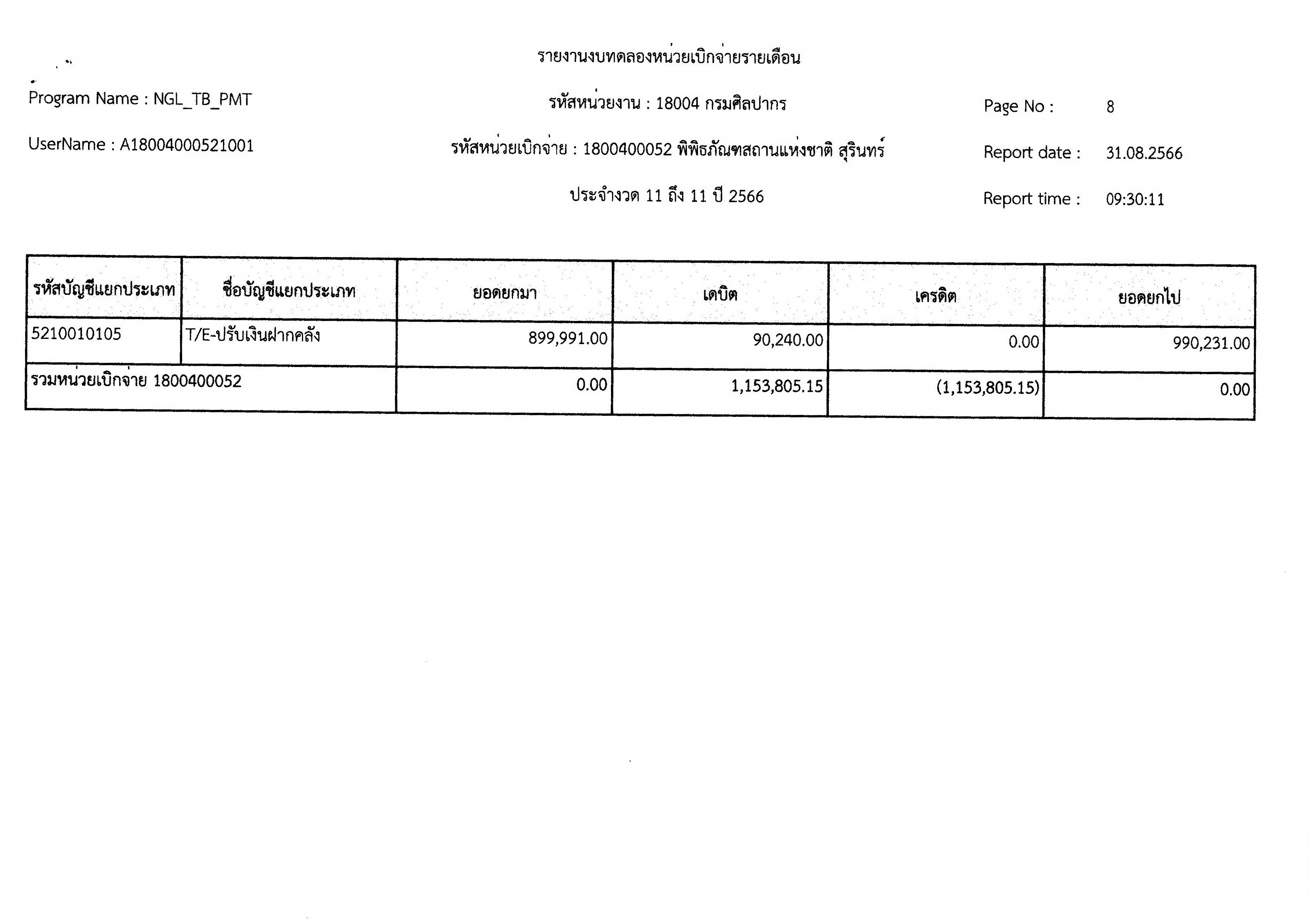 รายงานงบทดลองหน่วยเบิกจ่ายรายเดือน สิงหาคม พ.ศ. ๒๕๖๖