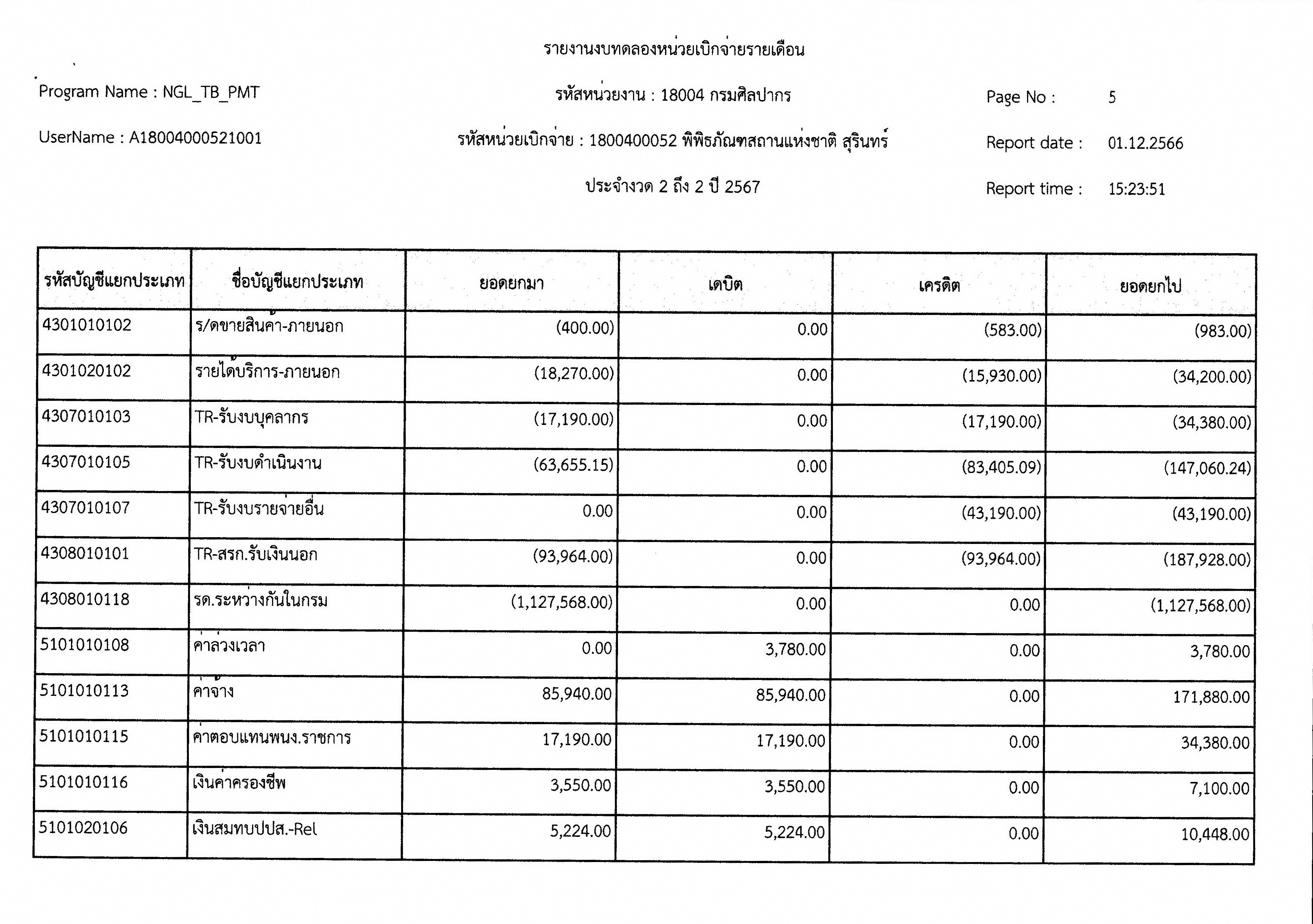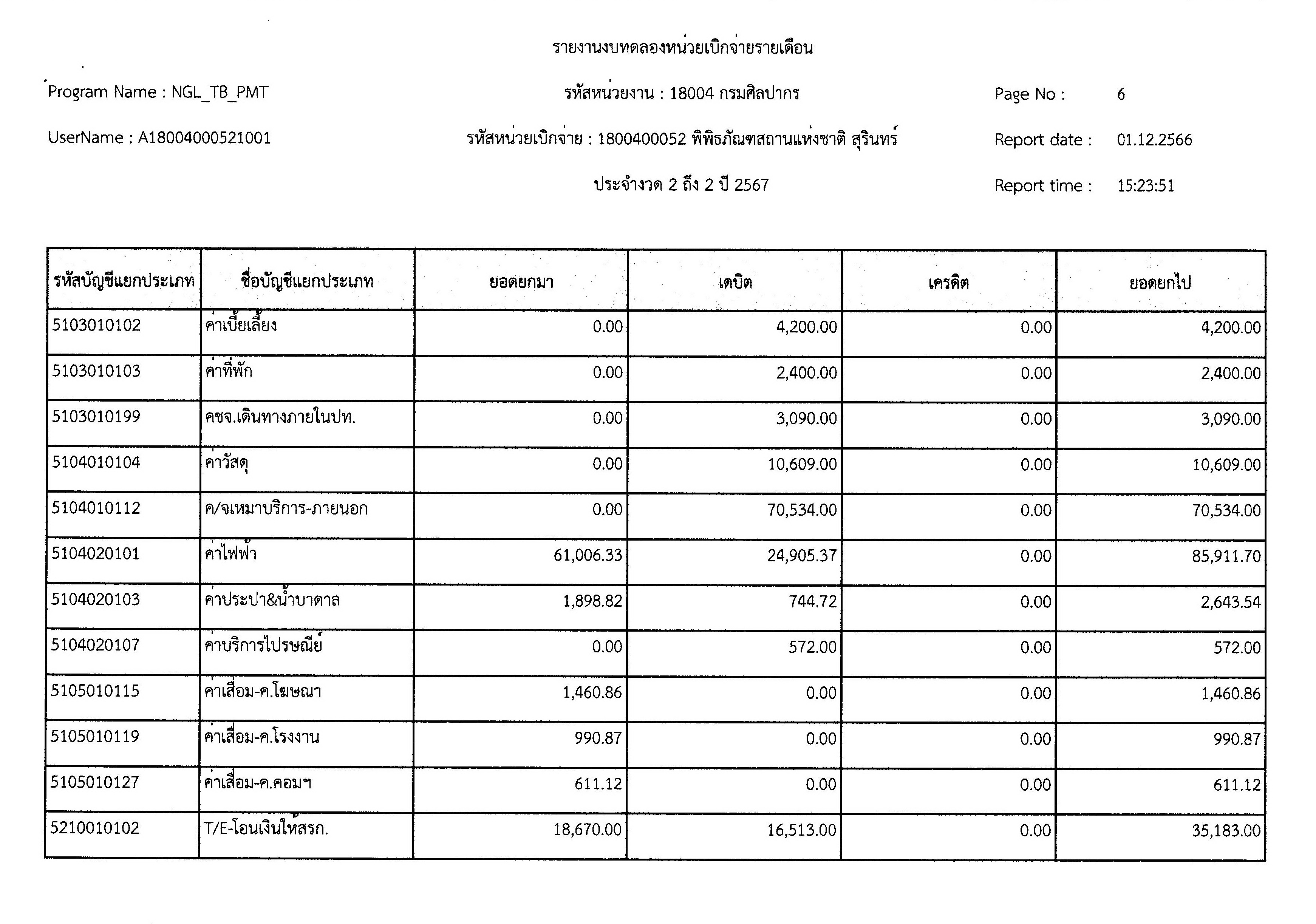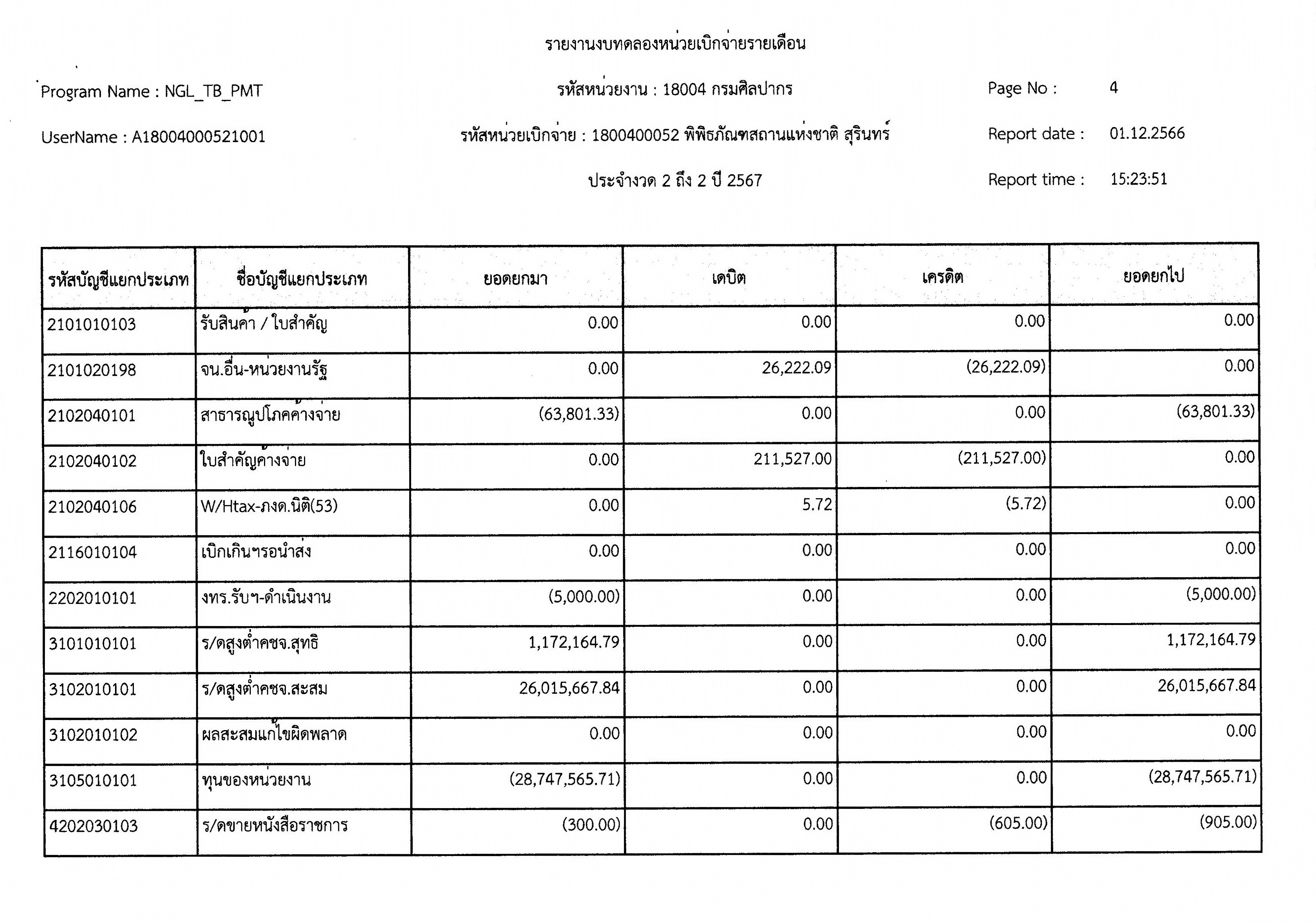รายงานงบทดลองหน่วยเบิกจ่ายรายเดือน พฤศจิกายน พ.ศ. ๒๕๖๖