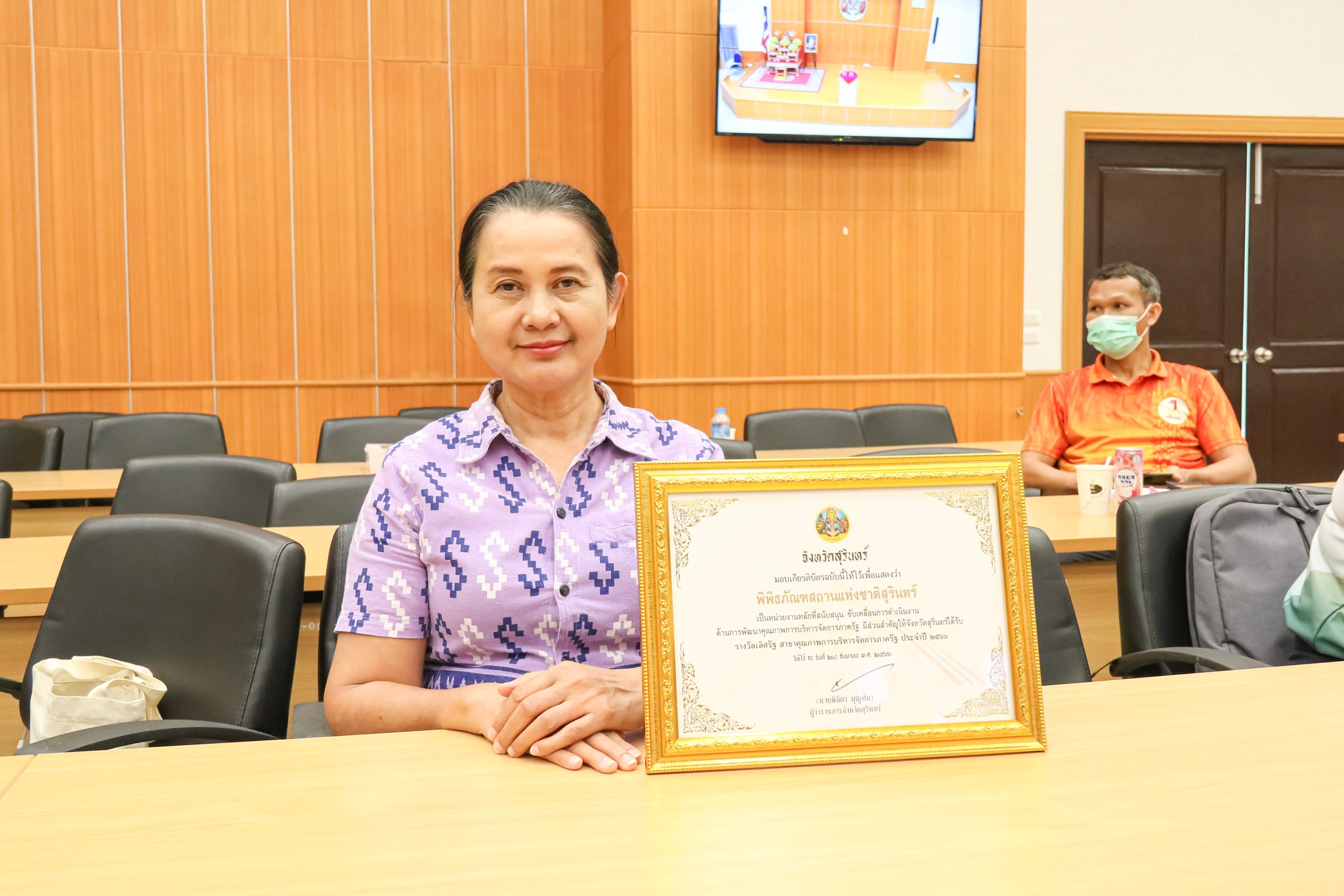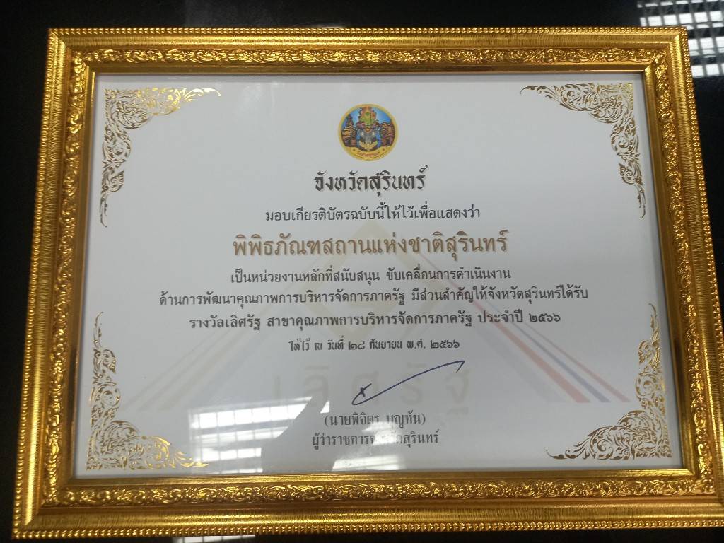 ในการนี้ จังหวัดสุรินทร์ได้มอบเกียรติบัตรให้แก่พิพิธภัณฑสถานแห่งชาติ สุรินทร์ เพื่อแสดงว่าเป็นหน่วยงานหลักที่สนับสนุน ขับเคลื่อนการดำเนินงานด้านการพัฒนาคุณภาพการบริหารจัดการภาครัฐและมีส่วนสำคัญให้จังหวัดสุรินทร์ได้รับรางวัลเลิศรัฐ สาขาคุณภาพการบริหารจัดการภาครัฐ ประจำปี ๒๕๖๖