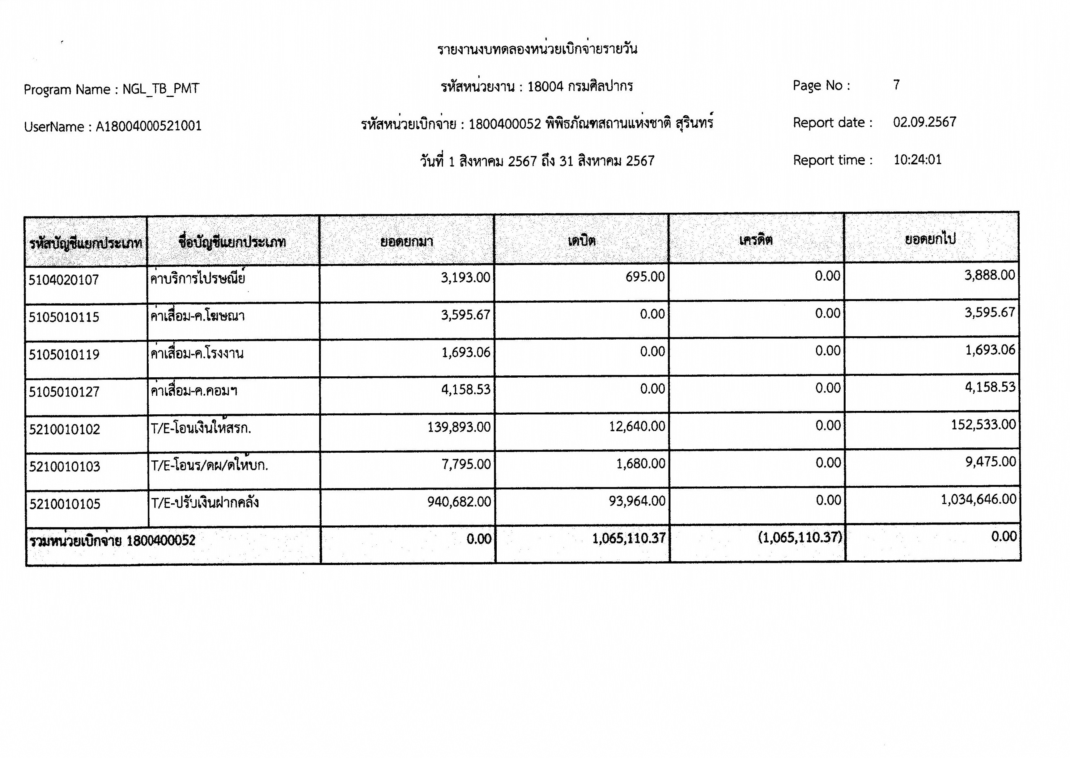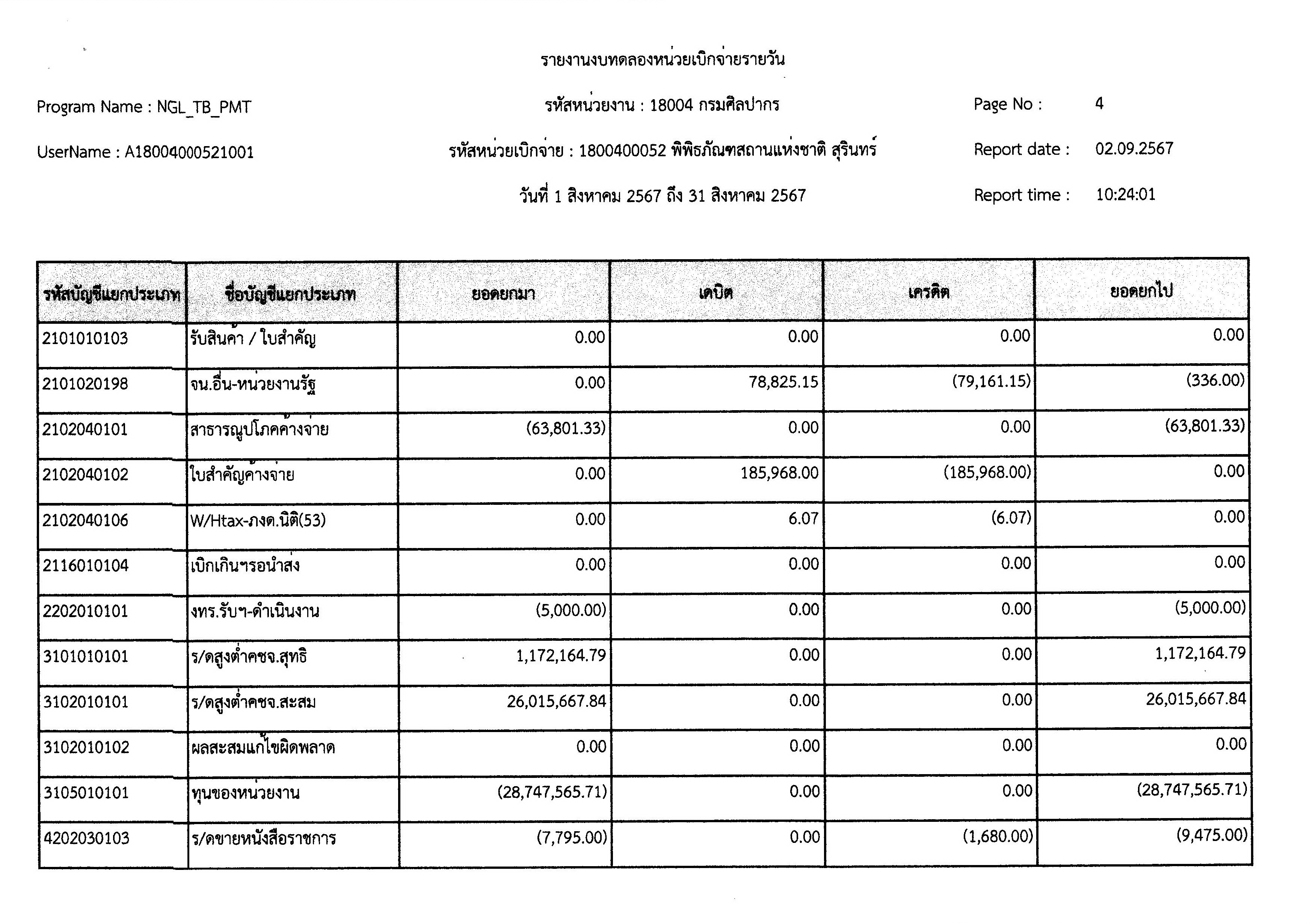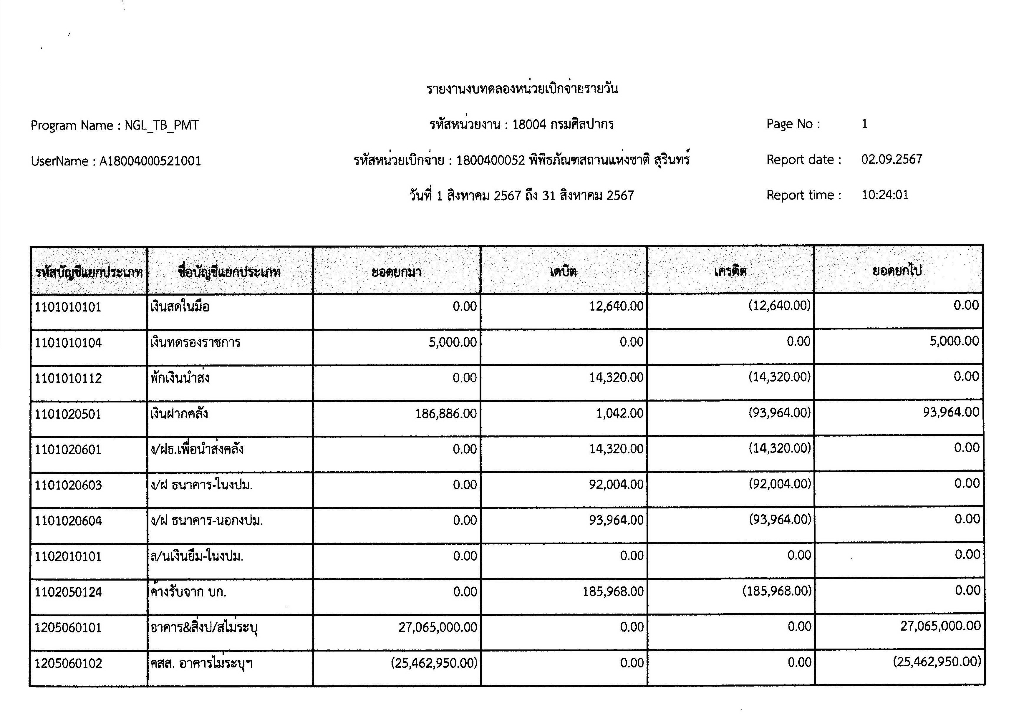 รายงานงบทดลองหน่วยเบิกจ่าย ประจำเดือน สิงหาคม ๒๕๖๗