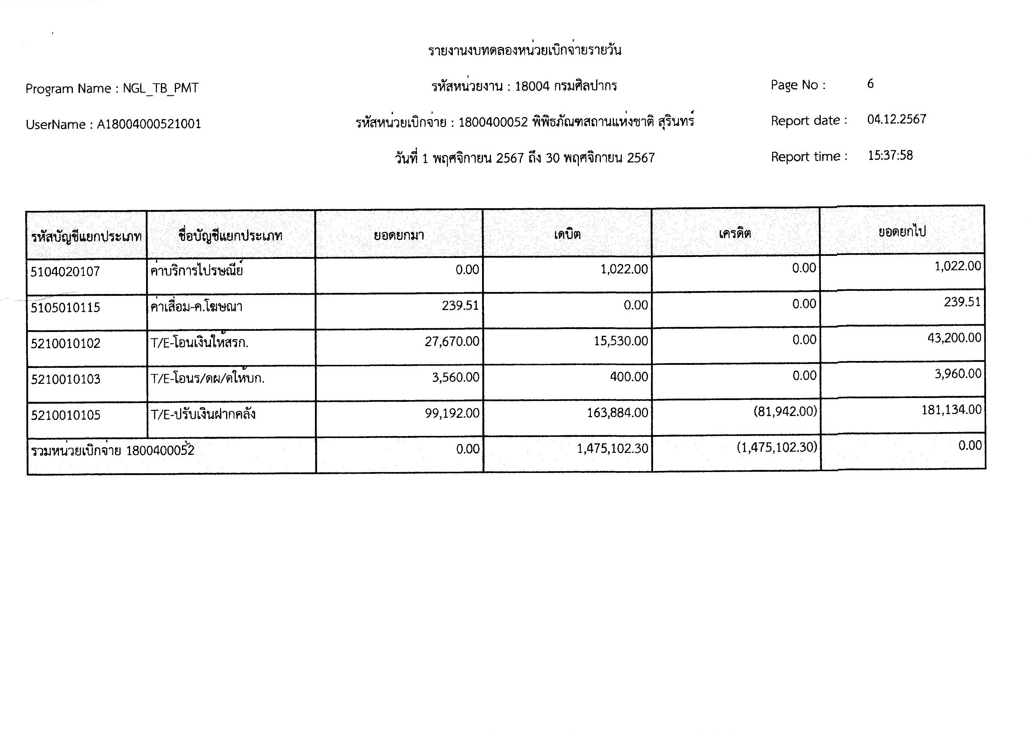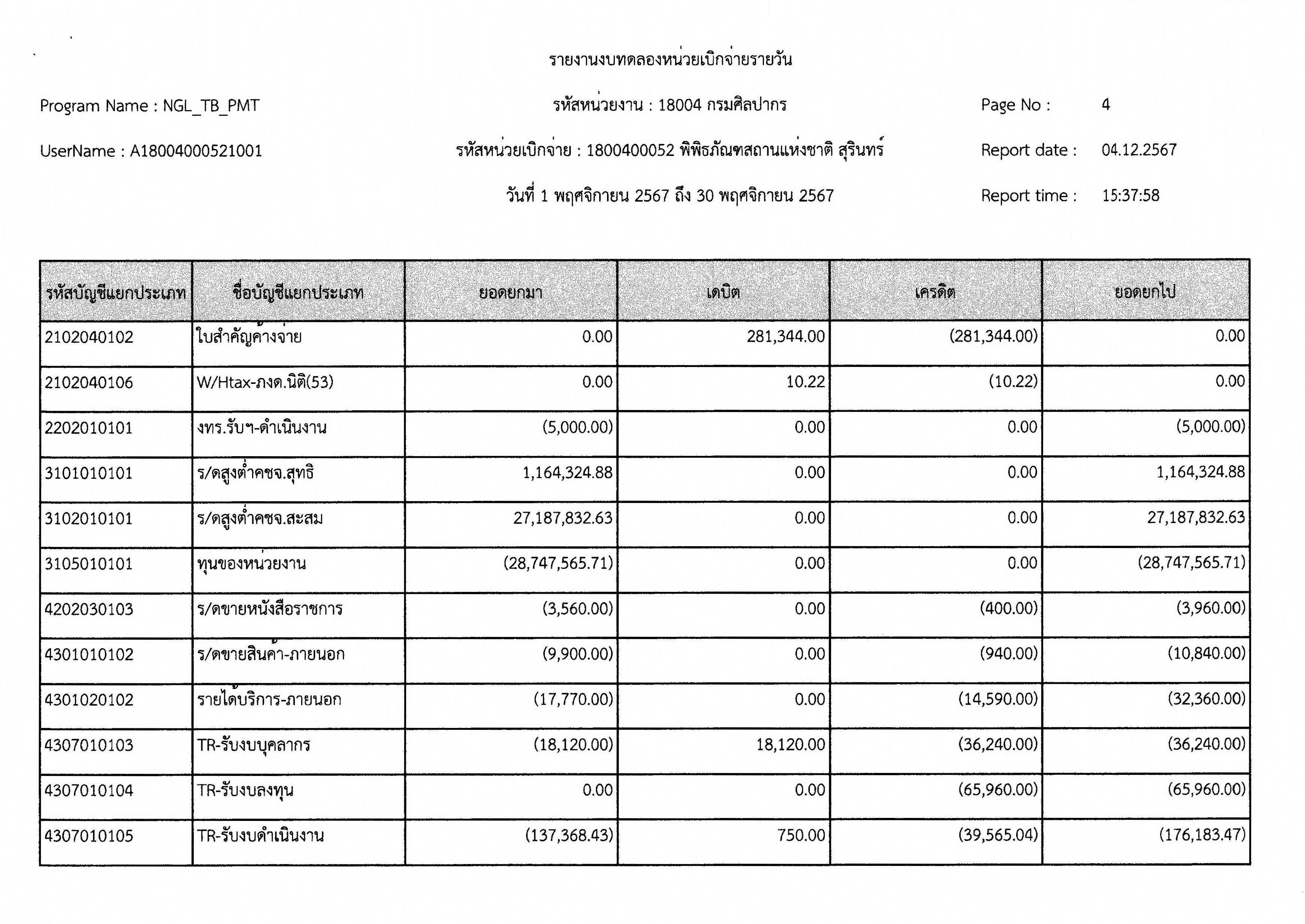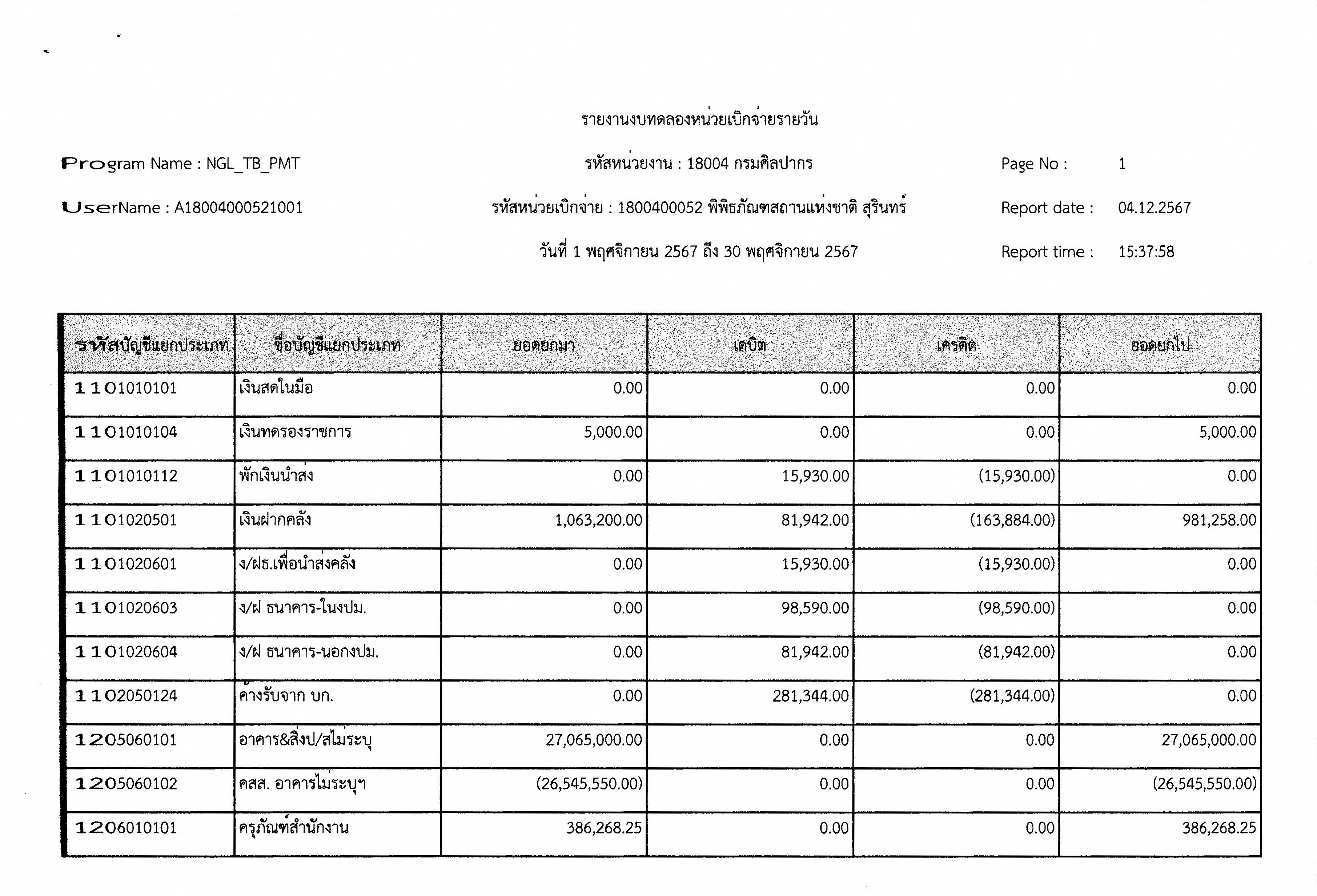 รายงานงบทดลองหน่วยเบิกจ่ายรายเดือน พฤศจิกายน ๒๕๖๗