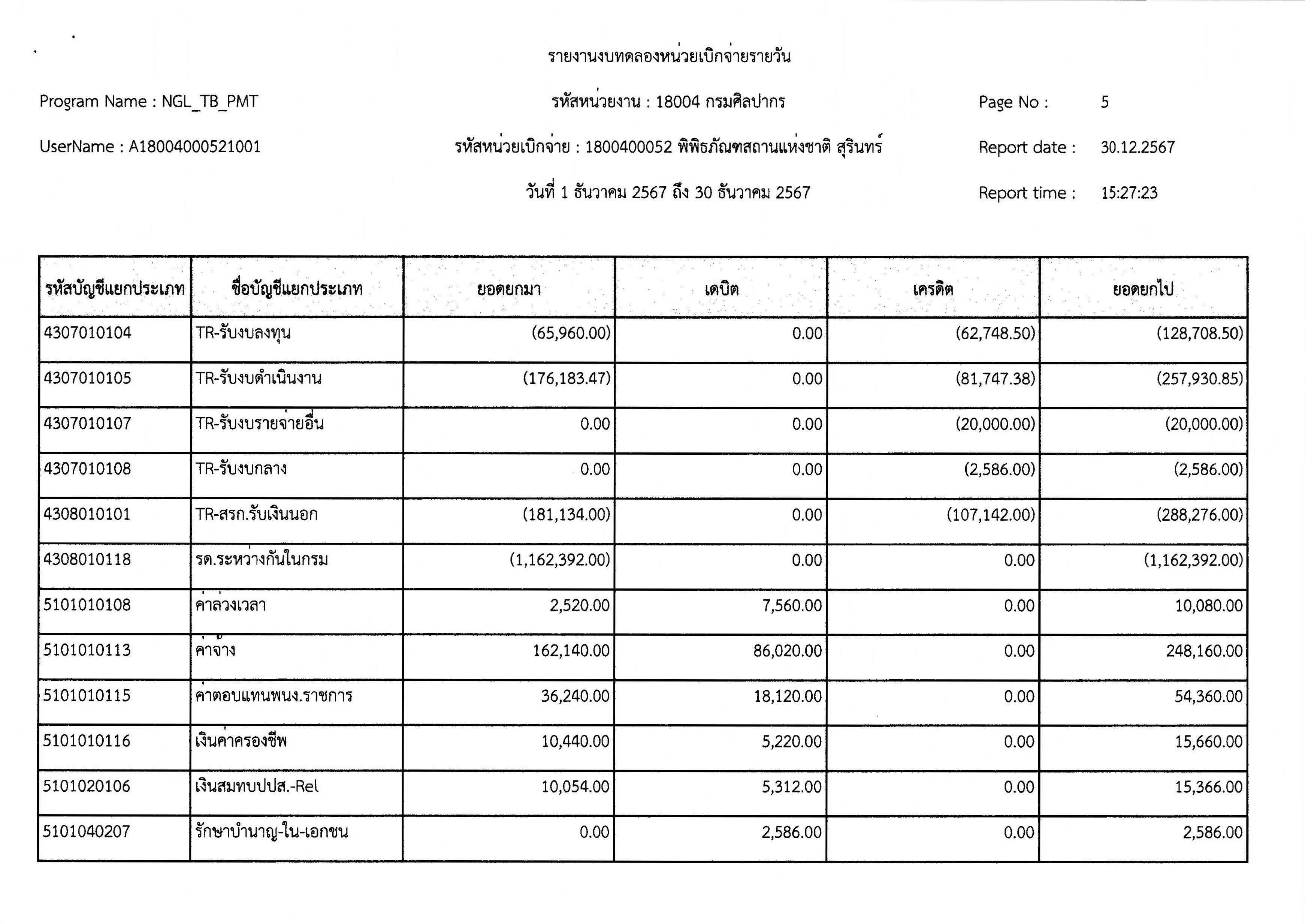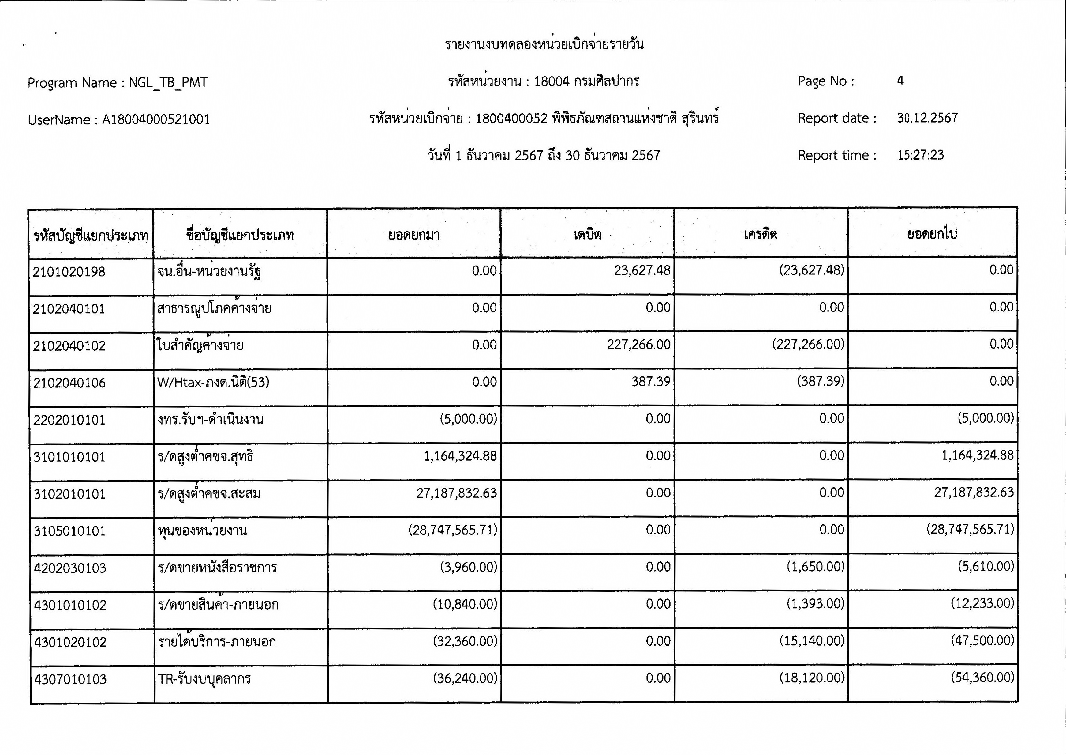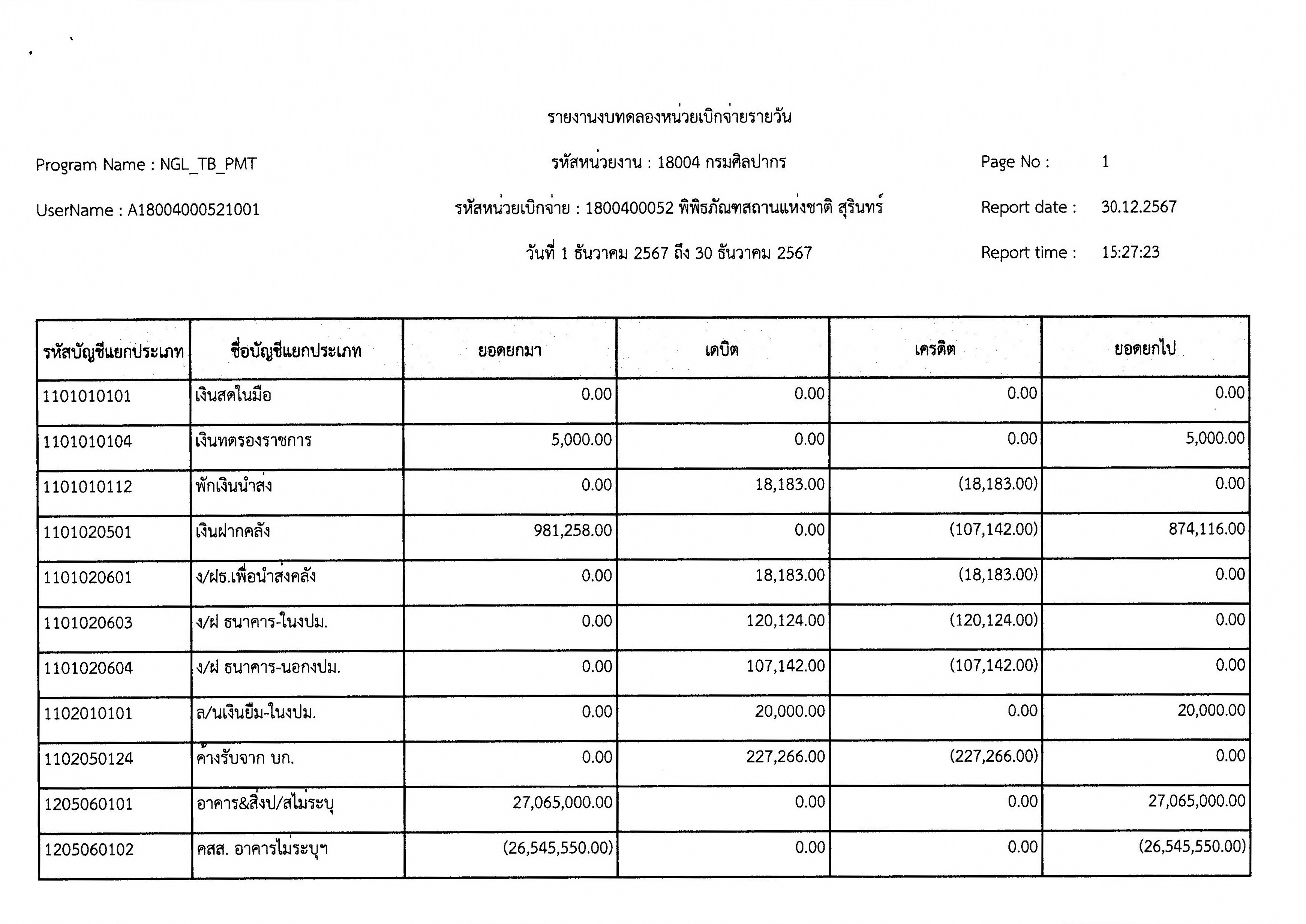 รายงานงบทดลองหน่วยเบิกจ่ายรายเดือน ประจำเดือนธันวาคม ๒๕๖๗