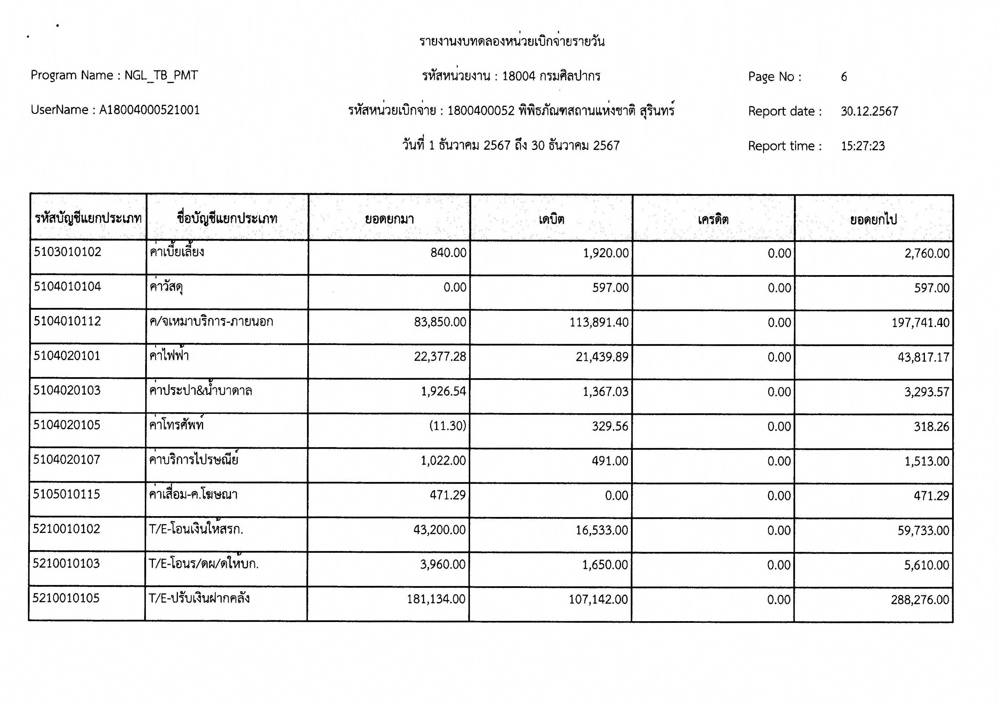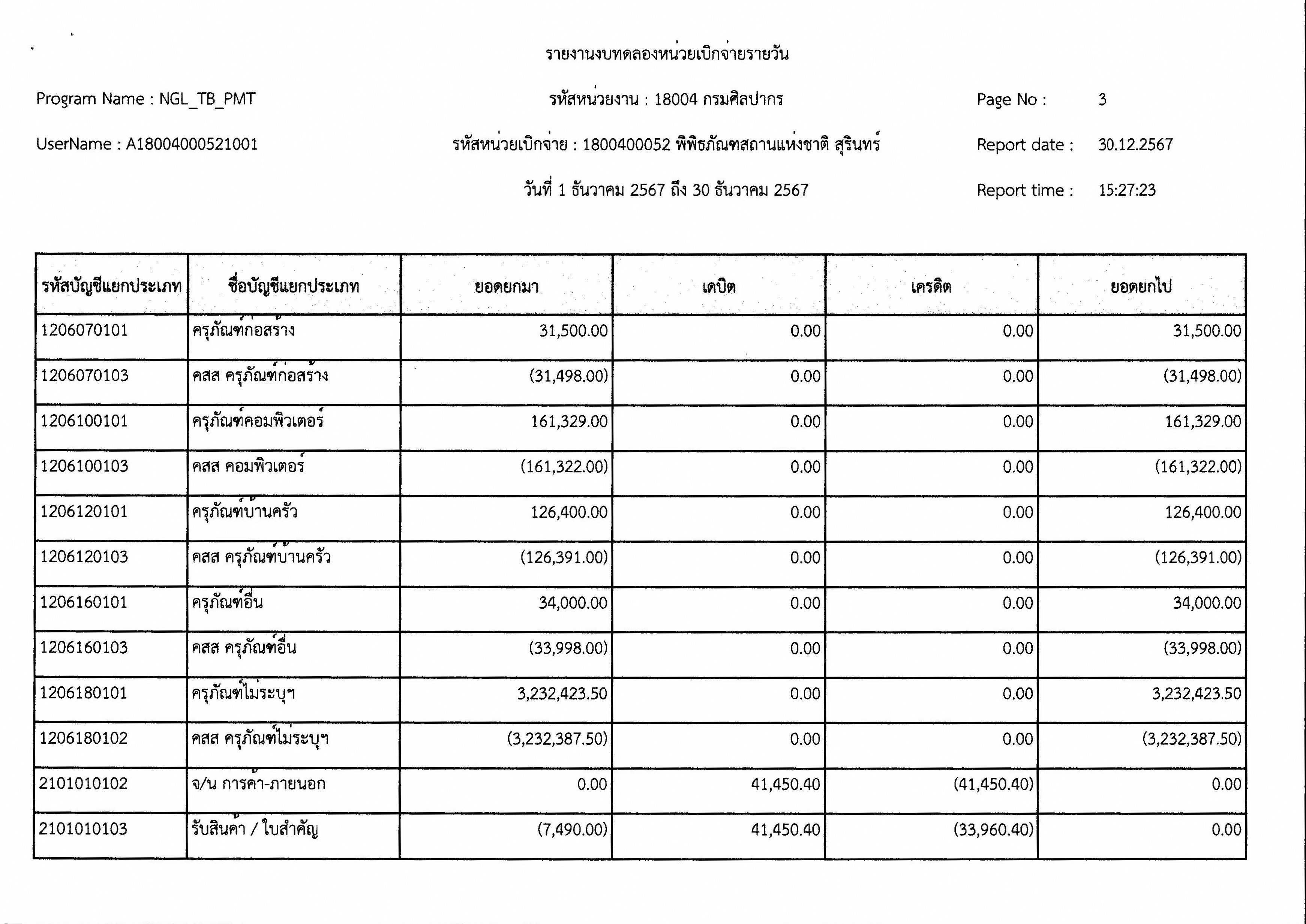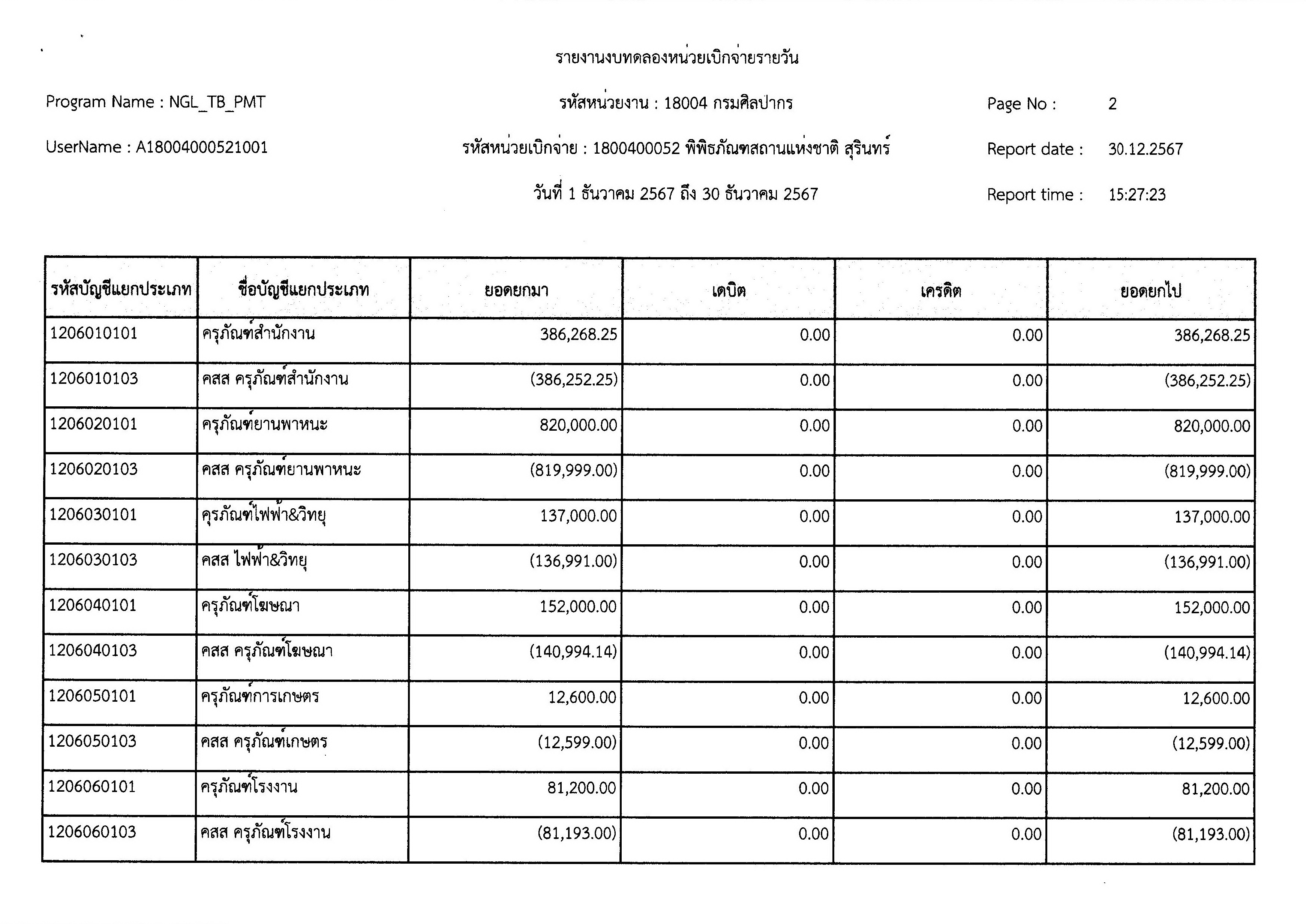 รายงานงบทดลองหน่วยเบิกจ่ายรายเดือน ประจำเดือนธันวาคม ๒๕๖๗