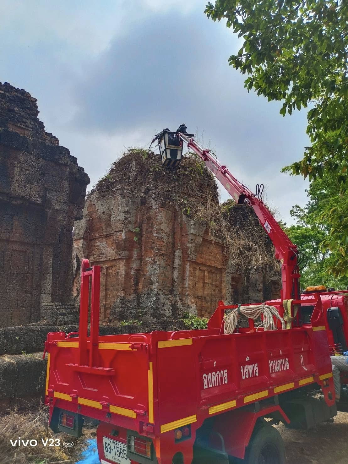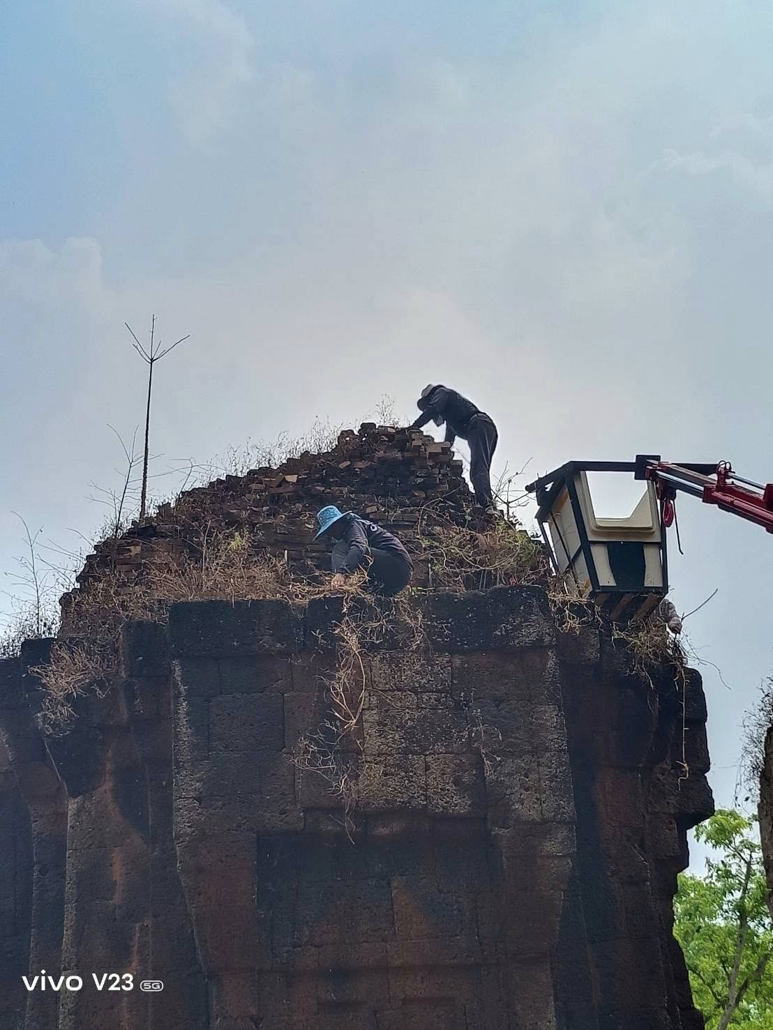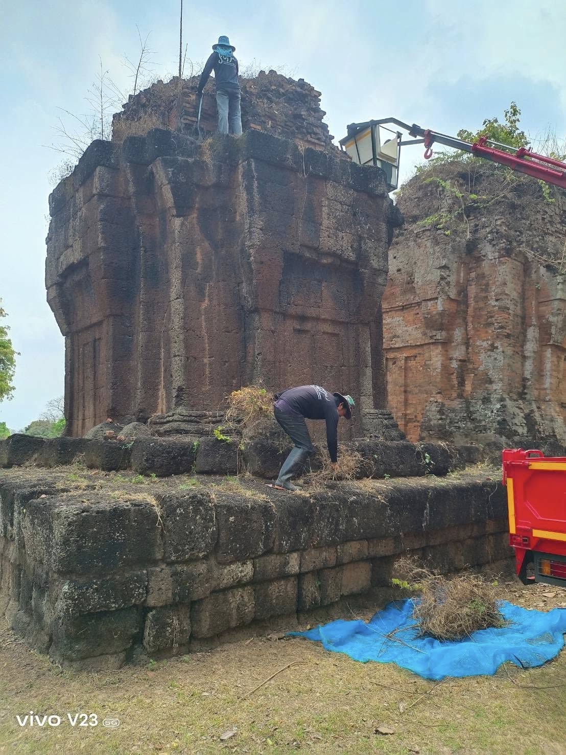 กำจัดต้นไม้และวัชพืชบนยอดโบราณสถานปราสาทปรางค์กู่