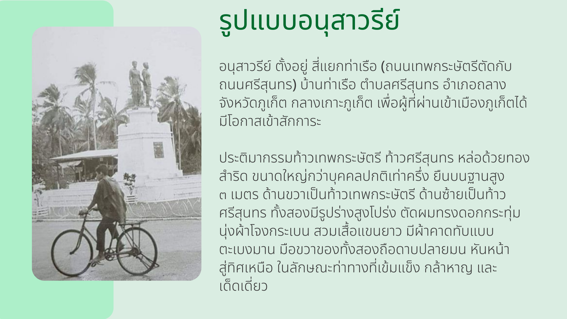 พระบาทสมเด็จพระบรมชนกาธิเบศร มหาภูมิพลอดุลยเดชมหาราช บรมนาถบพิตร (รัชกาลที่ ๙) และสมเด็จพระนางเจ้าสิริกิติ์ พระบรมราชินีนาถ พระบรมราชชนนีพันปีหลวง (พระบรมราชินีนาถในรัชกาลที่ ๙) เสด็จพระราชดำเนินเป็นองค์ประธานประกอบพิธีเปิดอนุสาวรีย์ท้าวเทพกระษัตรี ท้าวศรีสุนทร ณ สี่แยกท่าเรือ บ้านท่าเรือ ตำบลศรีสุนทร อำเภอถลาง จังหวัดภูเก็ต ภัณฑารักษ์ปฏิบัติการ และนางสาวนฤมล สักกามาส เจ้าหน้าที่ประจำห้อง ให้การต้อนรับ และเป็นวิทยากรนำชม