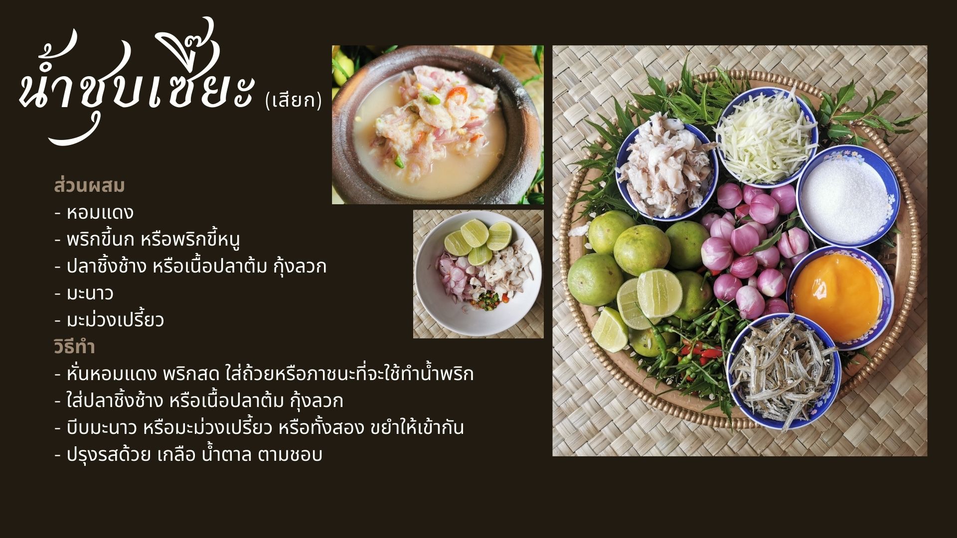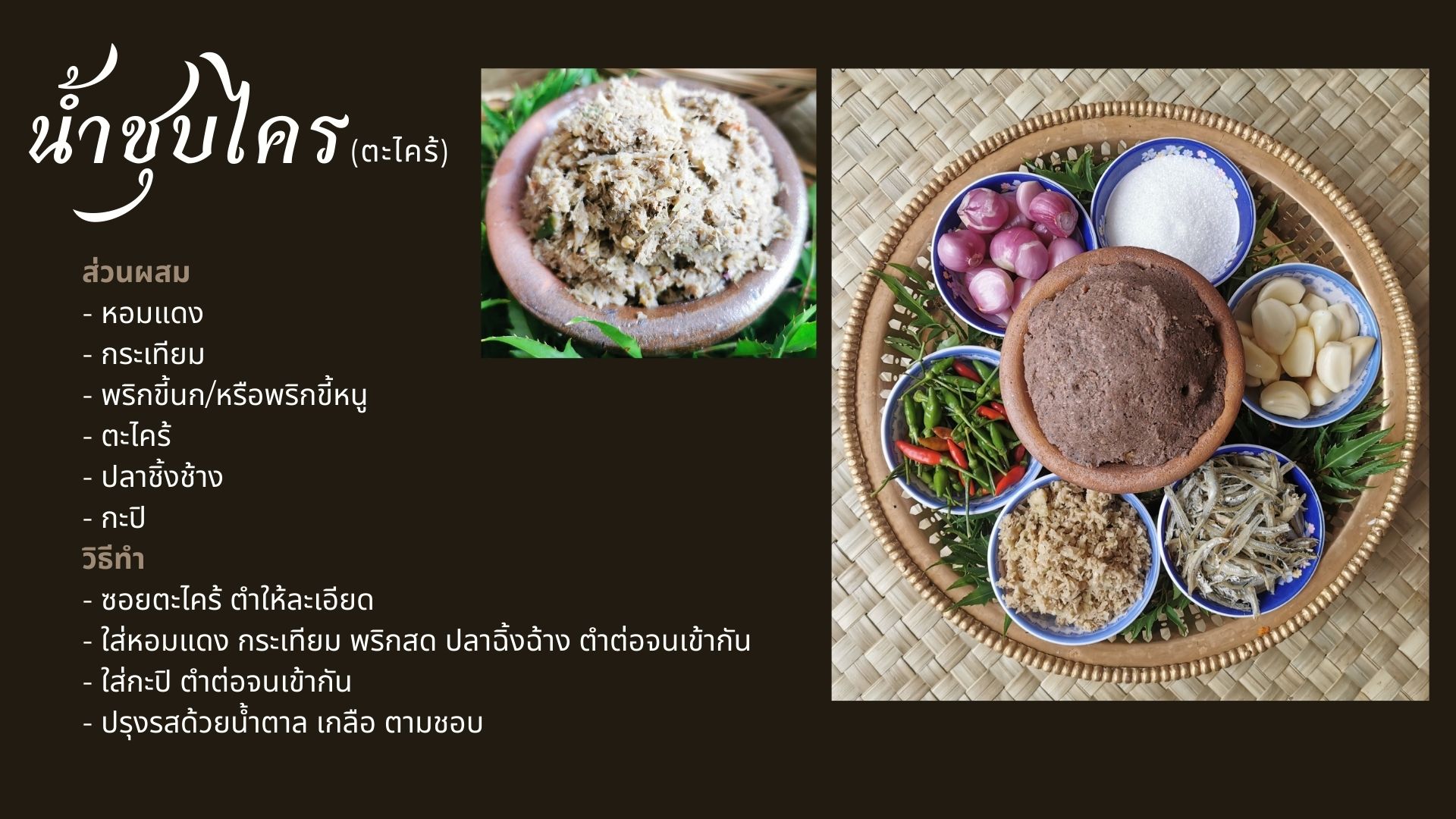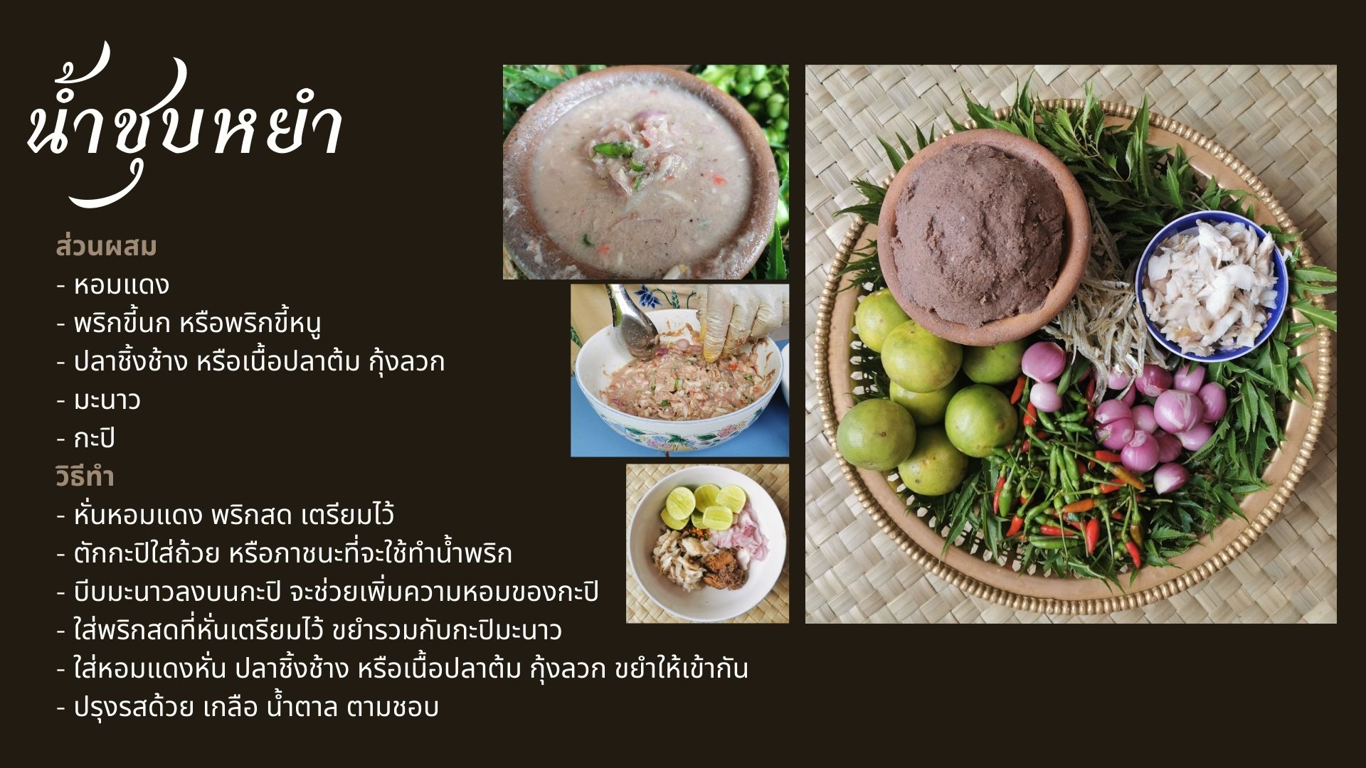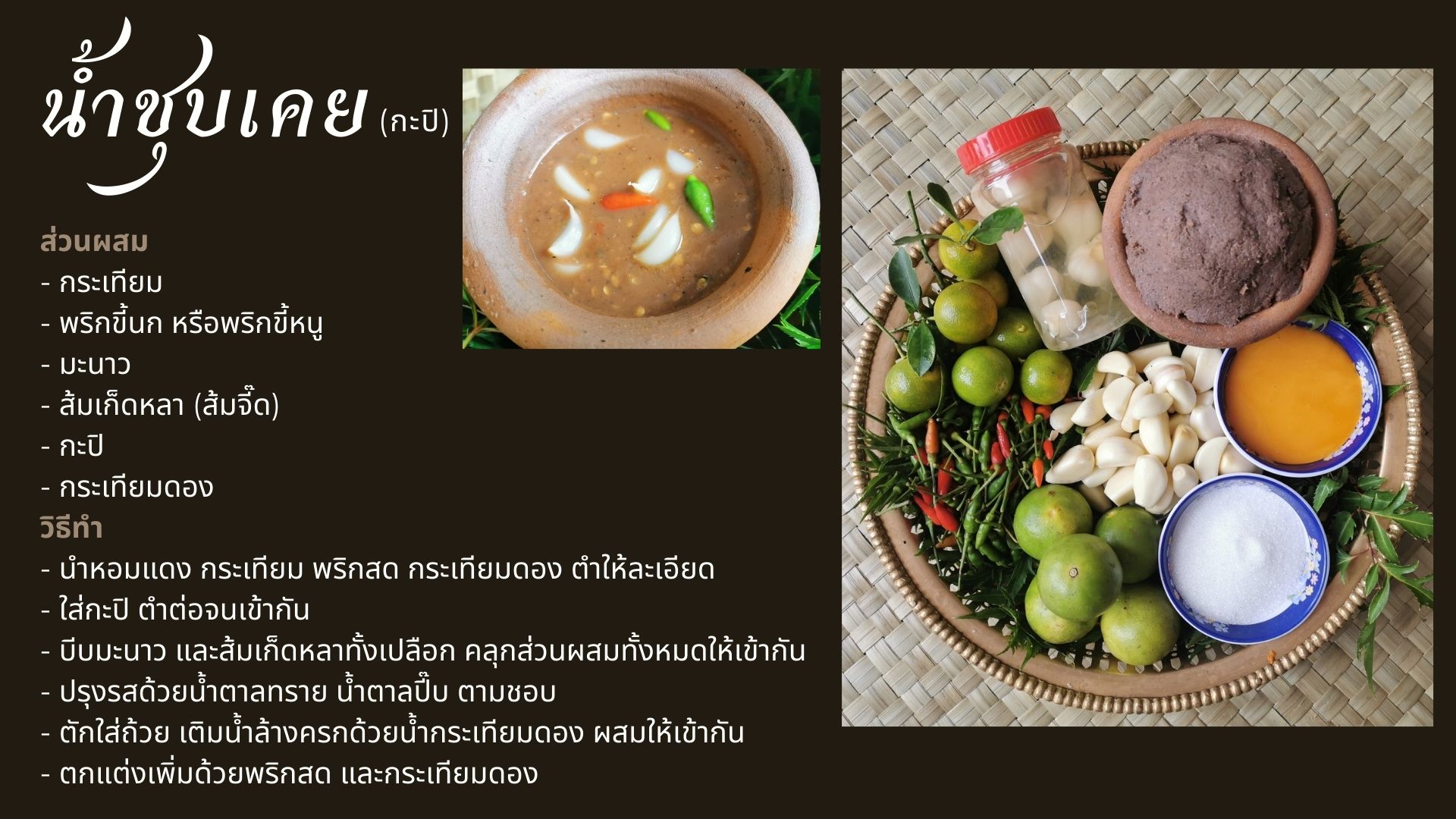 น้ำชุบ หรือ น้ำพริก เป็นอาหารคาวอย่างหนึ่งของคนใต้ มีกะปิเป็นวัตถุดิบหลัก และวัตถุดิบอื่น ๆ ที่สามารถหาได้ตามพื้นบ้าน มีขั้นตอนการทำไม่ยุ่งยาก ใช้เวลาน้อย ซึ่งแต่ละพื้นที่ก็จะมีส่วนผสมของวัตถุดิบ และขั้นตอนการทำที่แตกต่างกันออกไป