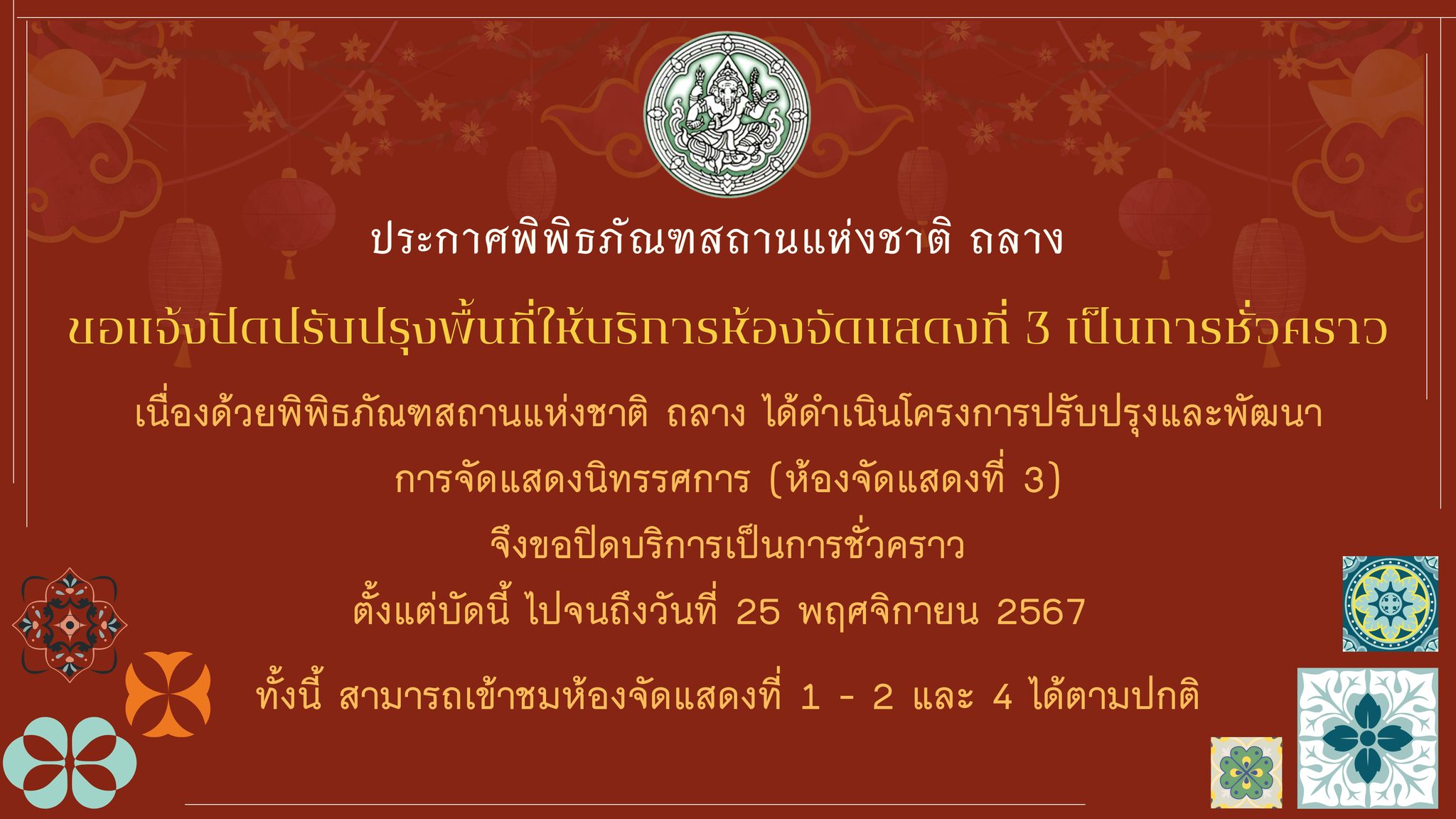 เนื่องด้วยพิพิธภัณฑสถานแห่งชาติ ถลาง ได้ดำเนินโครงการปรับปรุงและพัฒนาการจัดแสดงนิทรรศการชั่วคราว ห้องจัดแสดงที่ 3 จึงขอปิดบริการเป็นการชั่วคราว ตั้งแต่บัดนี้ ไปจนถึงวันที่ 25 พฤศจิกายน 2567