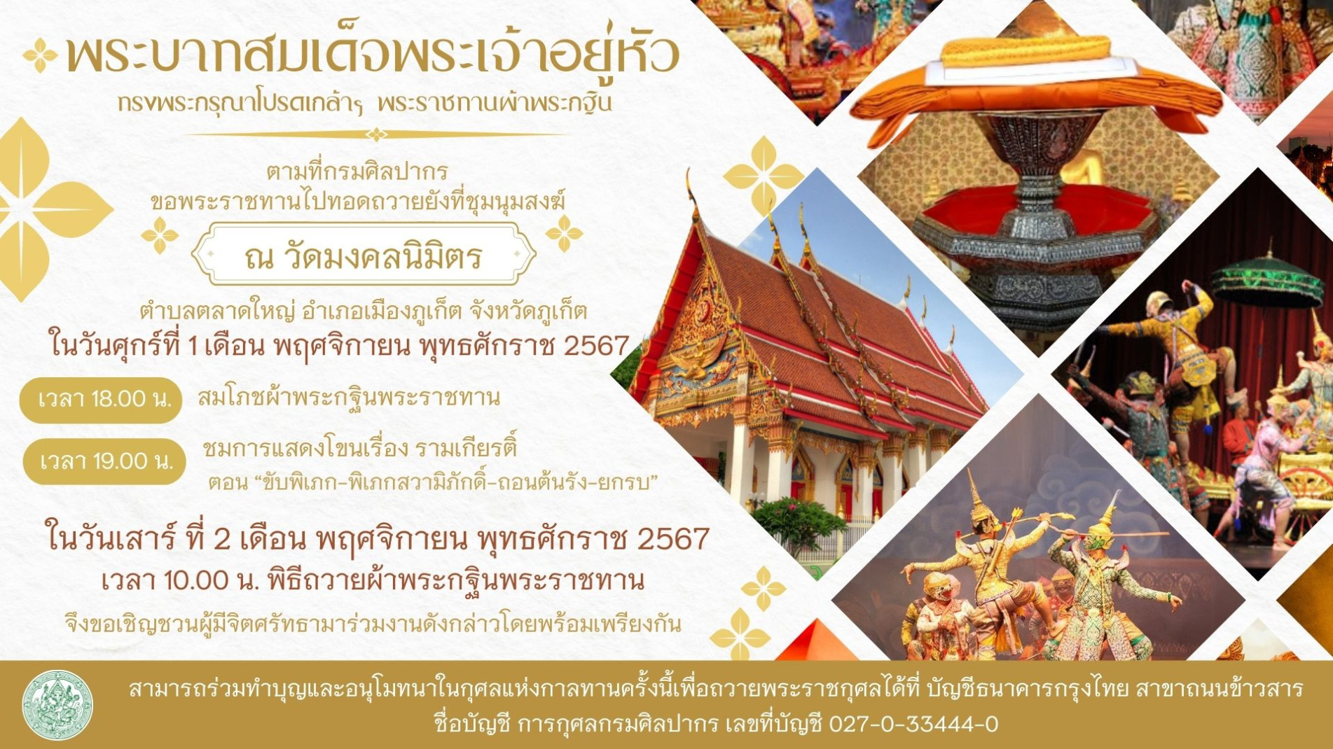 ด้วยพระบาทสมเด็จพระวชิรเกล้าเจ้าอยู่หัว ทรงพระกรุณาโปรดเกล้าฯ ให้กรมศิลปากรรับพระราชทานผ้าพระกฐิน ประจำปีพุทธศักราช ๒๕๖๗ นำไปถวาย ณ วัดมงคลนิมิตร ตำบลตลาดใหญ่ อำเภอเมืองภูเก็ต จังหวัดภูเก็ต ในวันเสาร์ที่ ๒ พฤศจิกายน ๒๕๖๗