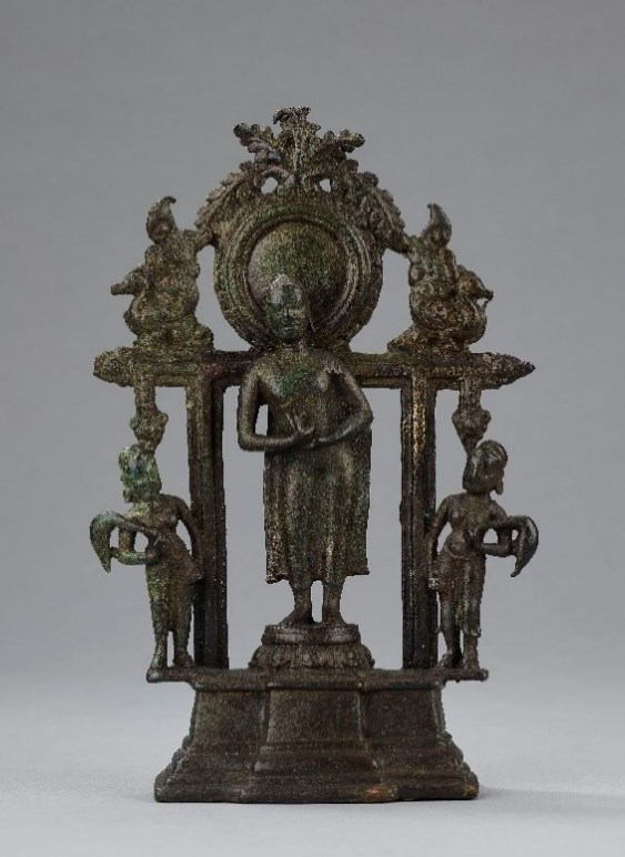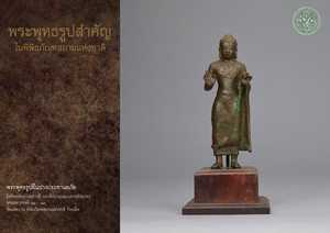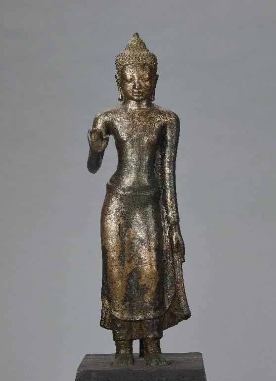 พระพุทธรูปยืนปางแสดงธรรม ศิลปะทวารวดี พุทธศตวรรษที่ ๑๕ - ๑๖ สัมฤทธิ์ สูง ๓๔ เซนติเมตร