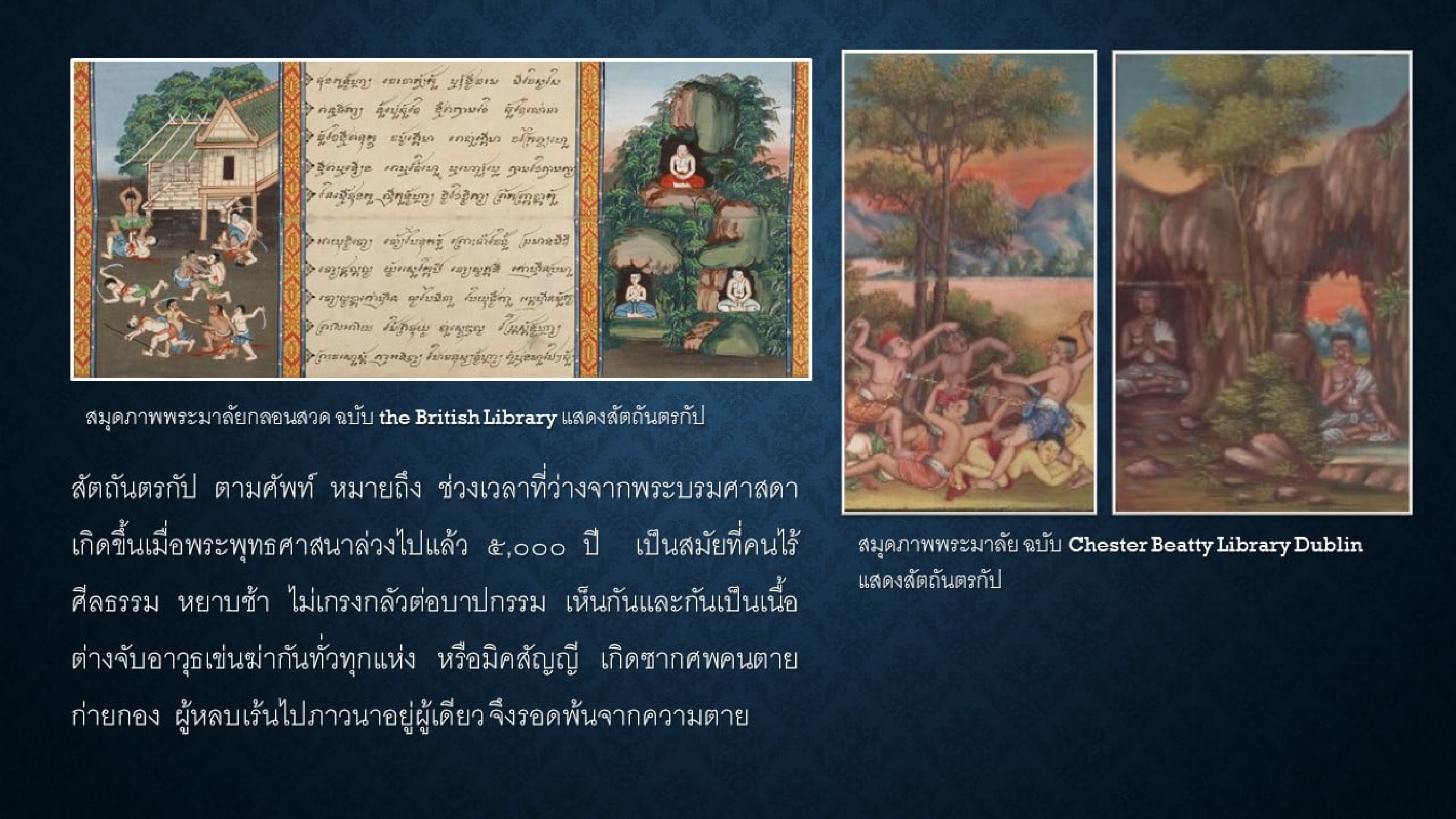 “...พระพุทธเจ้า เสด็จเข้านิฤพาน ยังแต่พระศรีอาริย์ ในชั้นดุสิตา พระพุทธรูปัง ยังครองศาสนา ให้สงฆ์ทั้งหลาย กราบไหว้วันทา ต่างองค์พระศาสดา สรรเพชญมุนี รักษาศาสนา ถ้วนห้าพันปี คำพระชินศรี โปรดให้แก่เรา...”