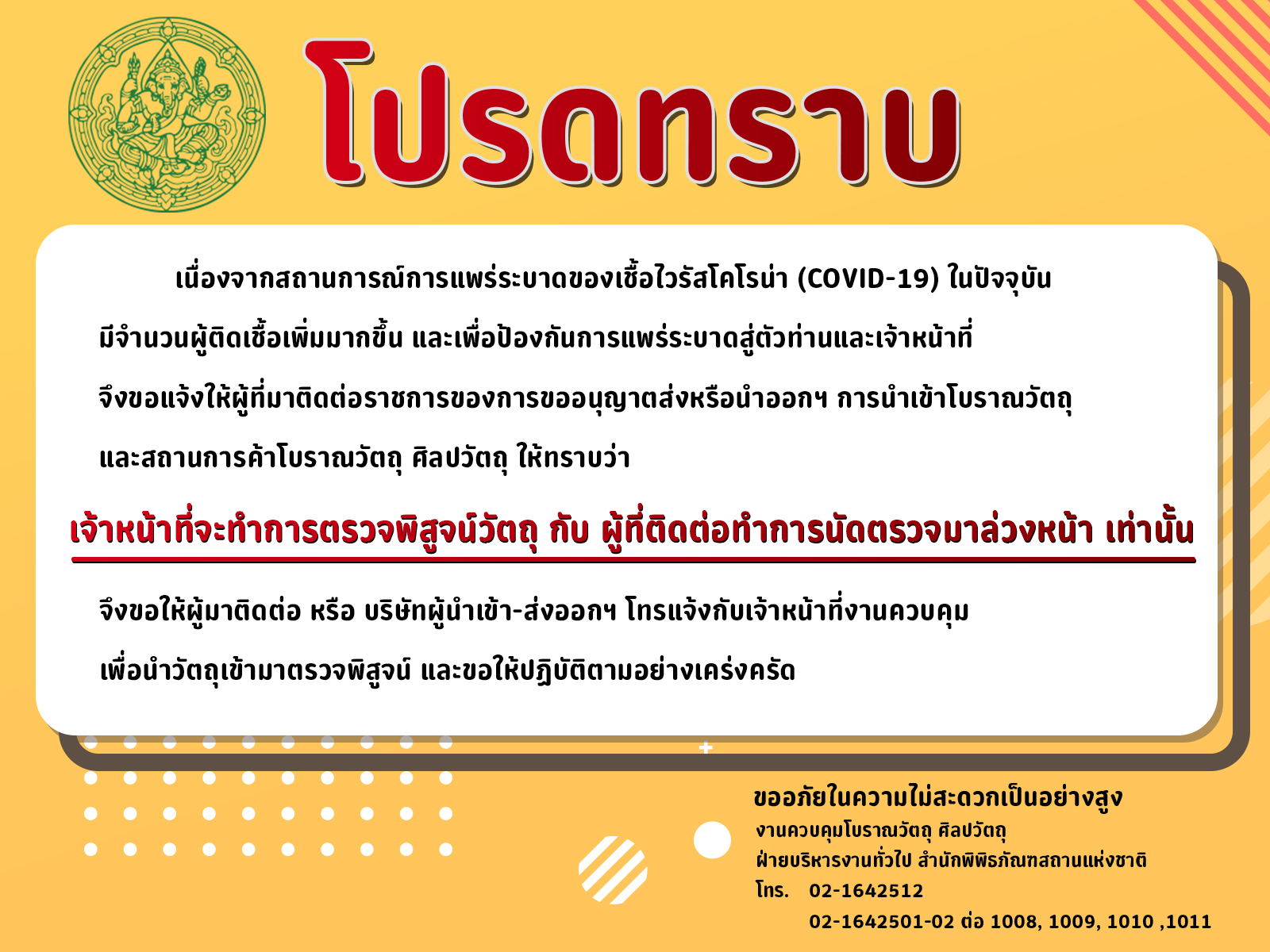 ประกาศ : ผู้ที่ต้องการใช้บริการกลุ่มงานควบคุมโบราณวัตถุ ศิลปวัตถุฯ "ขอให้แจ้งนัดหมายล่วงหน้า"