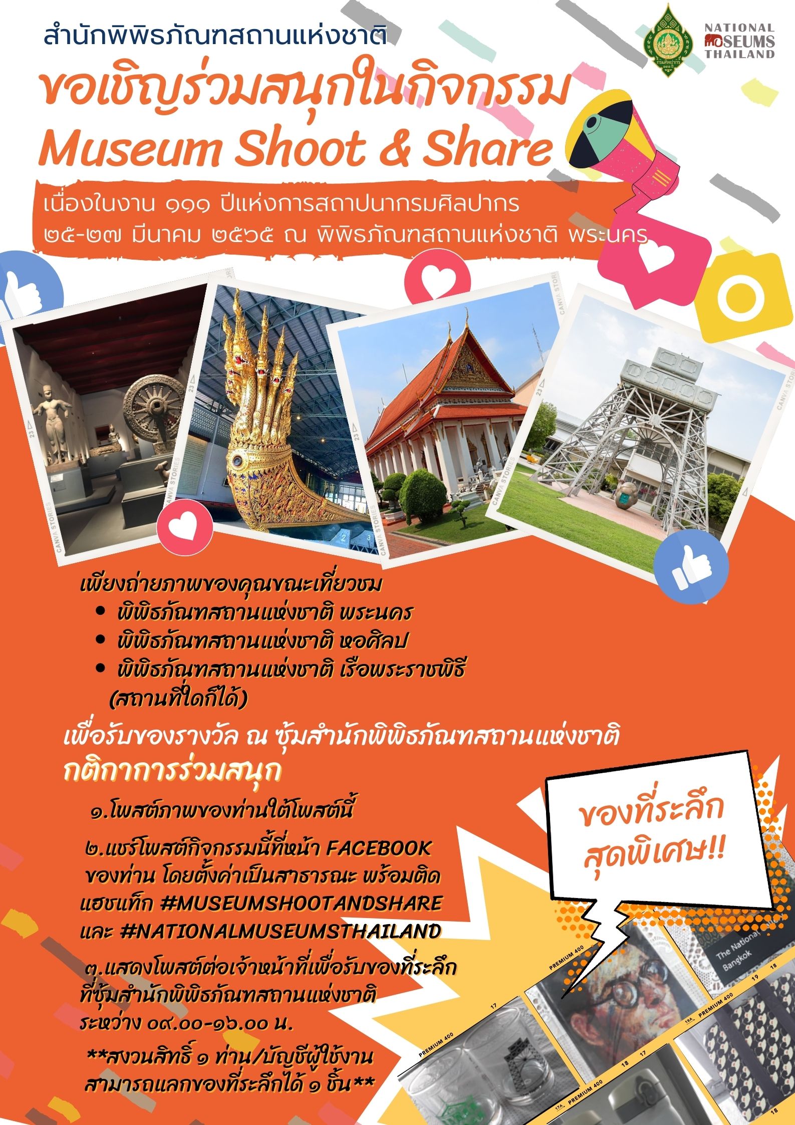 สำนักพิพิธภัณฑสถานแห่งชาติขอเชิญร่วมสนุกในกิจกรรม Museum Shoot & Share เนื่องในงาน ๑๑๑ ปีแห่งการสถาปนากรมศิลปากร ระหว่างวันที่ ๒๕-๒๗ มีนาคม ๒๕๖๕