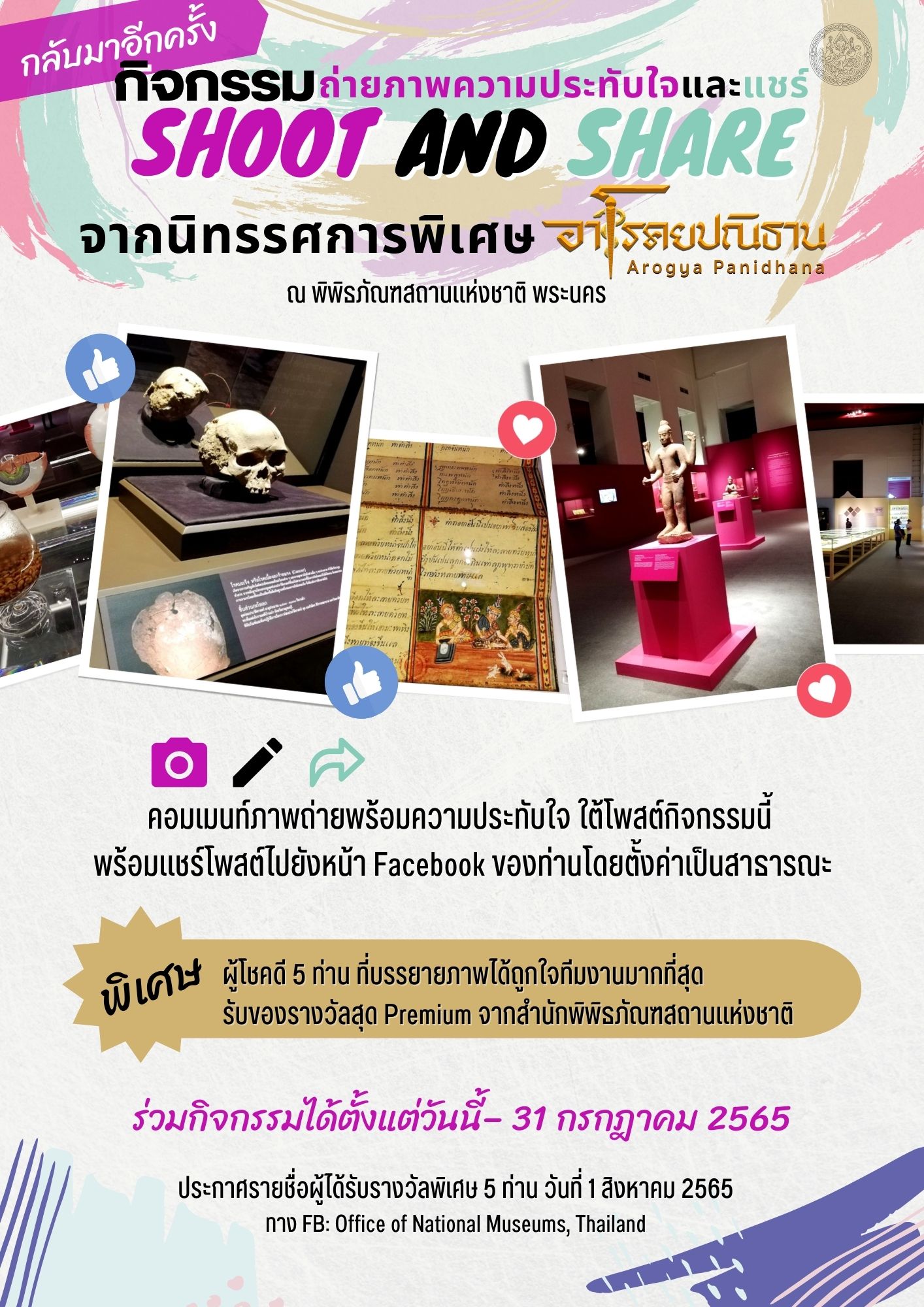 ขอเชิญทุกท่านร่วมแบ่งปันภาพและความประทับใจในนิทรรศการพิเศษอาโรคยปณิธาน เพื่อลุ้นรับของที่ระลึกสุดพิเศษจากสำนักพิพิธภัณฑสถานแห่งชาติ จำนวน 5 รางวัล