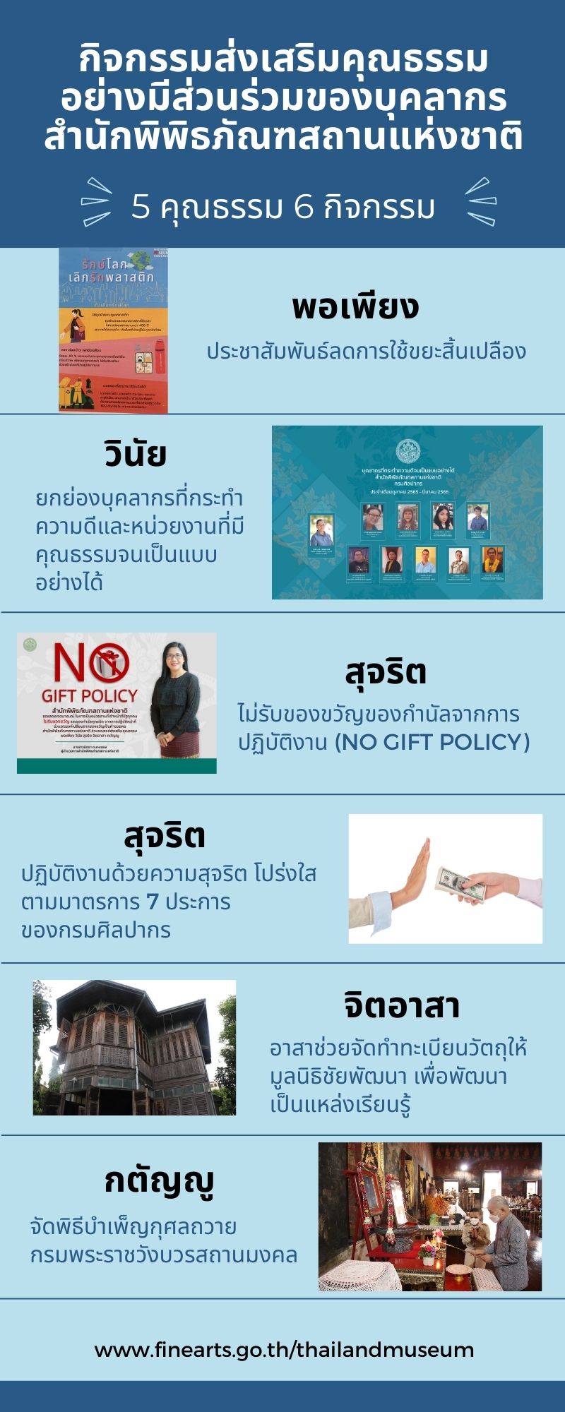 สำนักพิพิธภัณฑสถานแห่งชาติขอประชาสัมพันธ์แผนส่งเสริมคุณธรรมอย่างมีส่วนร่วมของบุคลากรในองค์กร ประจำปีงบประมาณ พ.ศ. 2566 ที่สอดคล้องกับคุณธรรมเป้าหมาย 5 ประการ ประกอบด้วย พอเพียง วินัย สุจริต จิตอาสา กตัญญู จำนวน 6 กิจกรรม