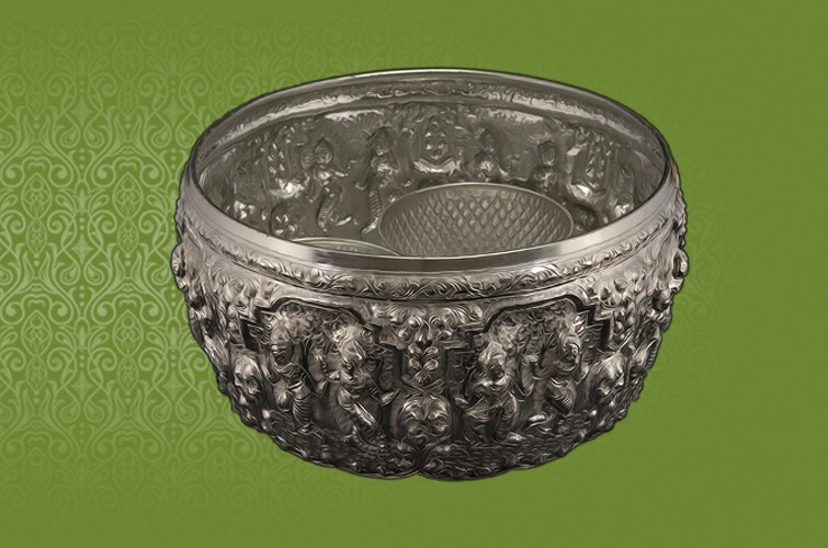 ลักษณะ : ลักษณะดุนลายเป็นเทพนมกำลังร่ายรำจำนวน 8 คู่ ที่ก้นขันมีปุ่มสามปุ่ม มียี่ห้อตราแมวน้ำ เป็นของสมเด็จพระเจ้าอยู่หัววชิราลงกรณ บดินทรเทพยวรางกูร เมื่อครั้งดำรงพระอิสริยยศสมเด็จพระบรมโอรสาธิราชฯ สยามมกุฎราชกุมาร ทรงใช้หลังจากทรงหว่านข้าว ณ บึงไผ่แขก เมื่อคราวเสด็จพระราชดำเนินทรงหว่านข้าว ณ บึงไผ่แขก อำเภอเมืองสุพรรณบุรี จังหวัดสุพรรณบุรี เมื่อวันที่ 27 มีนาคม 2529