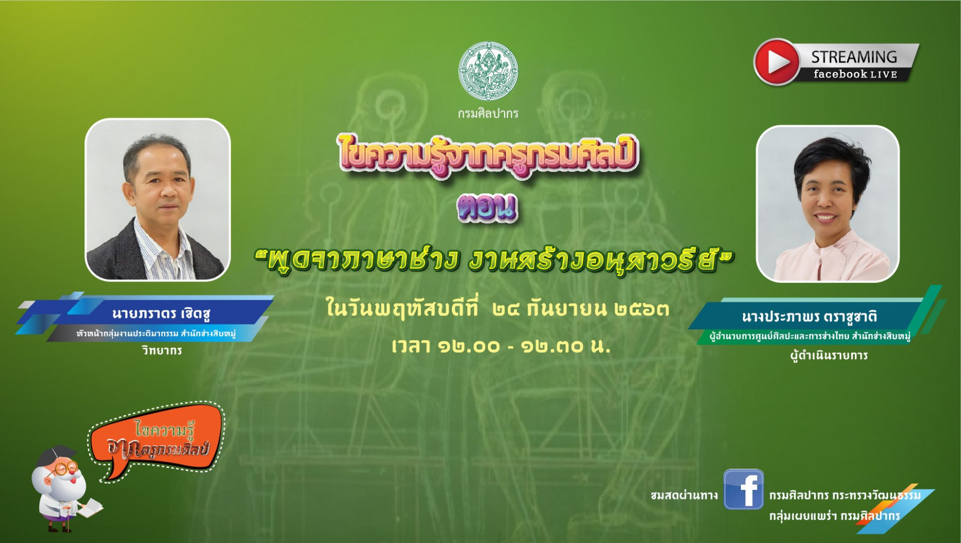 ขอเชิญรับชมถ่ายทอดสด Facebook Live รายการ ไขความรู้จากครูกรมศิลป์ ตอน “พูดจาภาษาช่าง งานสร้างอนุสาวรีย์”