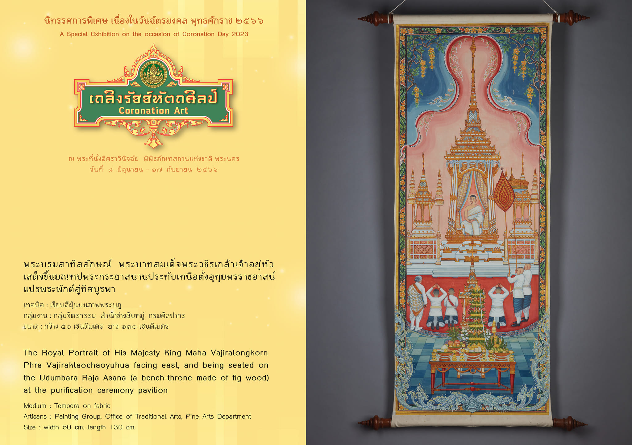 ผลงานศิลปกรรมออกแบบและจัดสร้างโดย กลุ่มจิตรกรรม สำนักช่างสิบหมู่ กรมศิลปากร จัดแสดงในนิทรรศการพิเศษ “เถลิงรัชช์หัตถศิลป์” ณ พระที่นั่งอิศราวินิจฉัย พิพิธภัณฑสถานแห่งชาติ พระนคร ระหว่างวันที่ ๙ มิถุนายน – ๑๗ กันยายน ๒๕๖๖ เวลา ๐๙.๐๐ – ๑๖.๐๐ น. วันพุธ – วันอาทิตย์ (ปิดวันจันทร์ – วันอังคาร)
