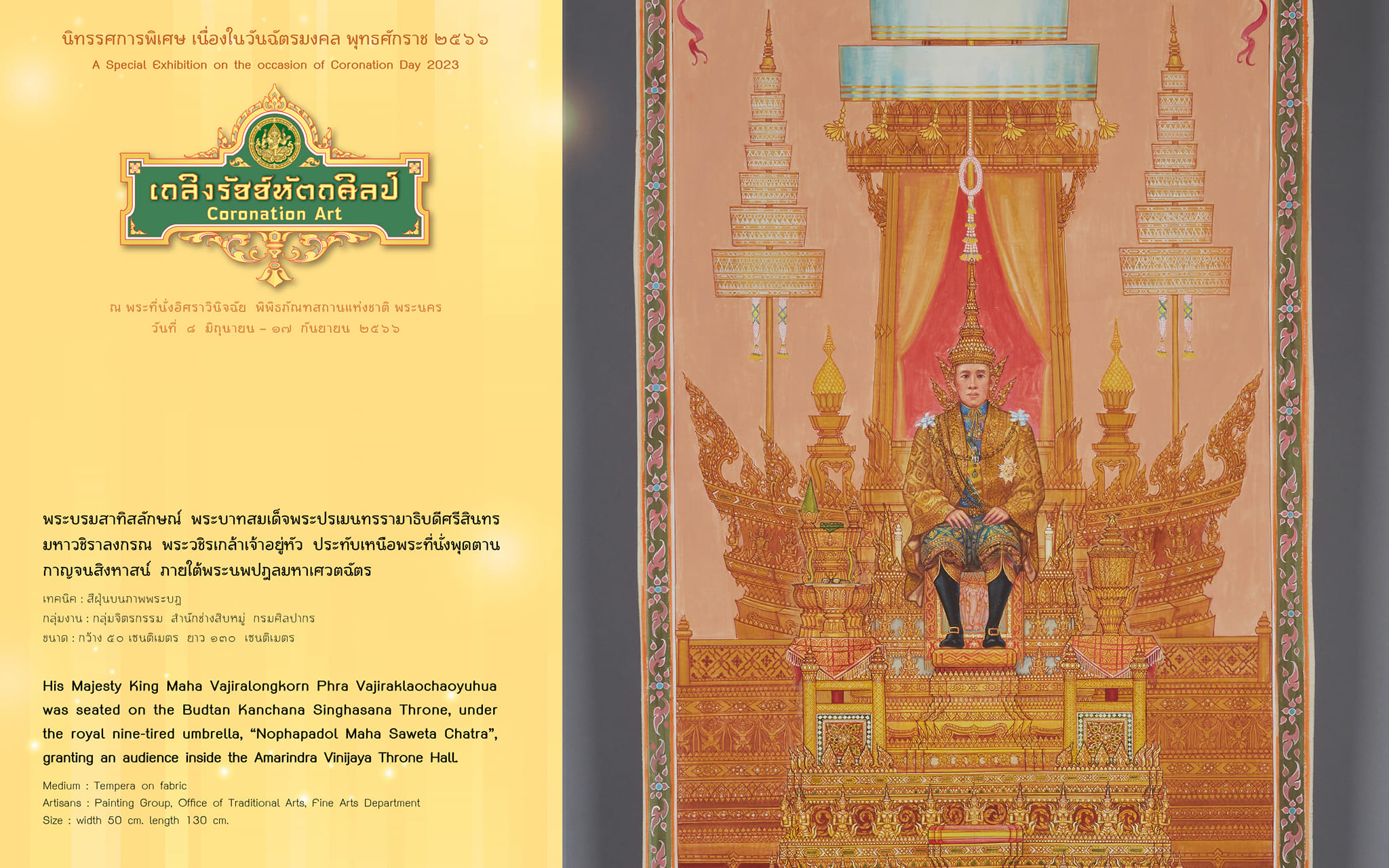 ผลงานศิลปกรรมออกแบบและจัดสร้างโดย กลุ่มจิตรกรรม สำนักช่างสิบหมู่ กรมศิลปากร จัดแสดงในนิทรรศการพิเศษ “เถลิงรัชช์หัตถศิลป์” ณ พระที่นั่งอิศราวินิจฉัย พิพิธภัณฑสถานแห่งชาติ พระนคร ระหว่างวันที่ ๙ มิถุนายน – ๑๗ กันยายน ๒๕๖๖ เวลา ๐๙.๐๐ – ๑๖.๐๐ น. วันพุธ – วันอาทิตย์ (ปิดวันจันทร์ – วันอังคาร)