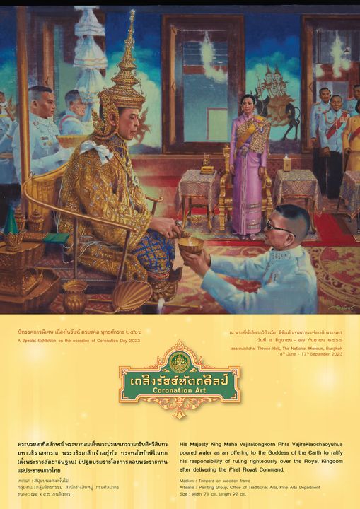 ผลงานศิลปกรรมออกแบบและจัดสร้างโดย กลุ่มจิตรกรรม สำนักช่างสิบหมู่ กรมศิลปากร จัดแสดงในนิทรรศการพิเศษ “เถลิงรัชช์หัตถศิลป์” ณ พระที่นั่งอิศราวินิจฉัย พิพิธภัณฑสถานแห่งชาติ พระนคร ระหว่างวันที่ ๙ มิถุนายน – ๑๗ กันยายน ๒๕๖๖ เวลา ๐๙.๐๐ – ๑๖.๐๐ น. วันพุธ – วันอาทิตย์ (ปิดวันจันทร์ – วันอังคาร)