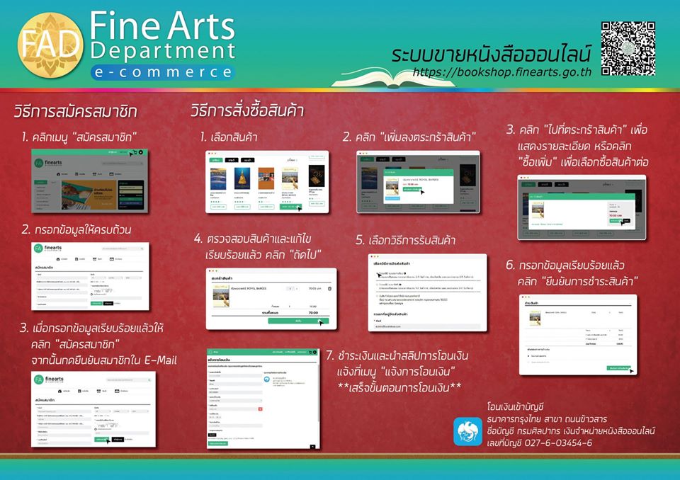 กรมศิลปากรได้เพิ่มช่องทางในการเข้าถึงองค์ความรู้ด้านศิลปวัฒนธรรม ในการสั่งซื้อหนังสือที่กรมศิลปากรจัดพิมพ์ผ่านทางเว็บไซต์ http://bookshop.finearts.go.th/
