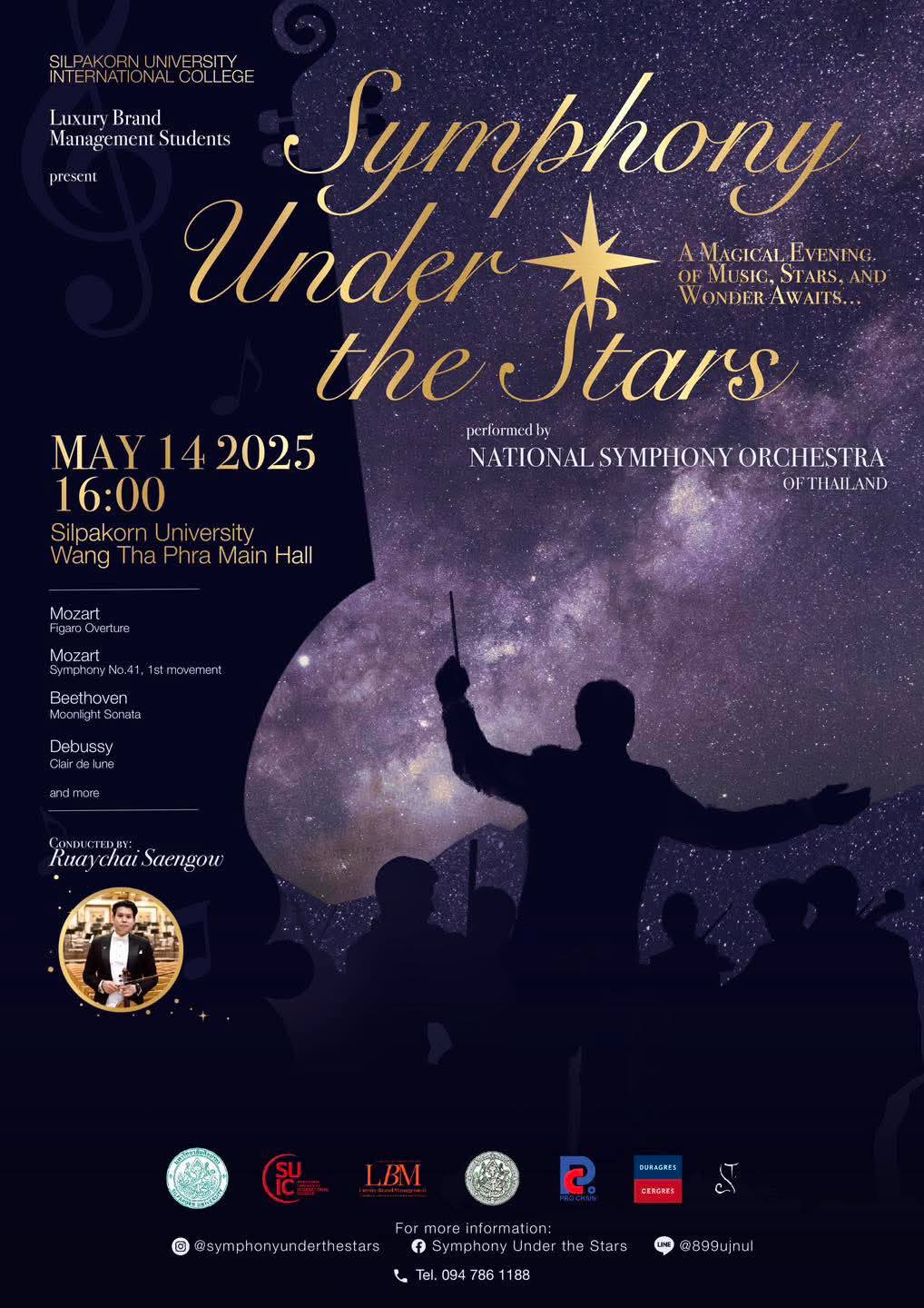 ภาพการบรรเลงดนตรีสากล เนื่องในการจัดงานออร์เคสตรา “Symphony Under the Star” ณ หอประชุมมหาวิทยาลัยศิลปากร วังท่าพระ ในวันพุธที่ ๑๔ พฤษภาคม ๒๕๖๘